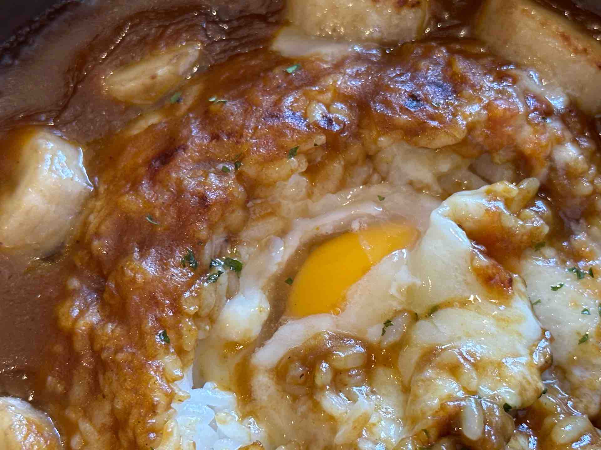 中に半熟卵が埋まっているので、掘り返して食べます。