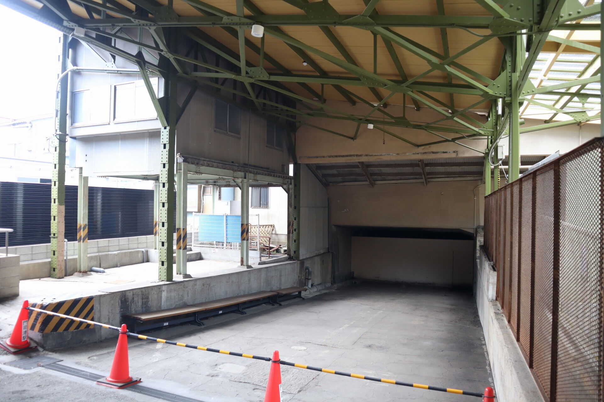 古めかしいレール流用のホーム上屋です。