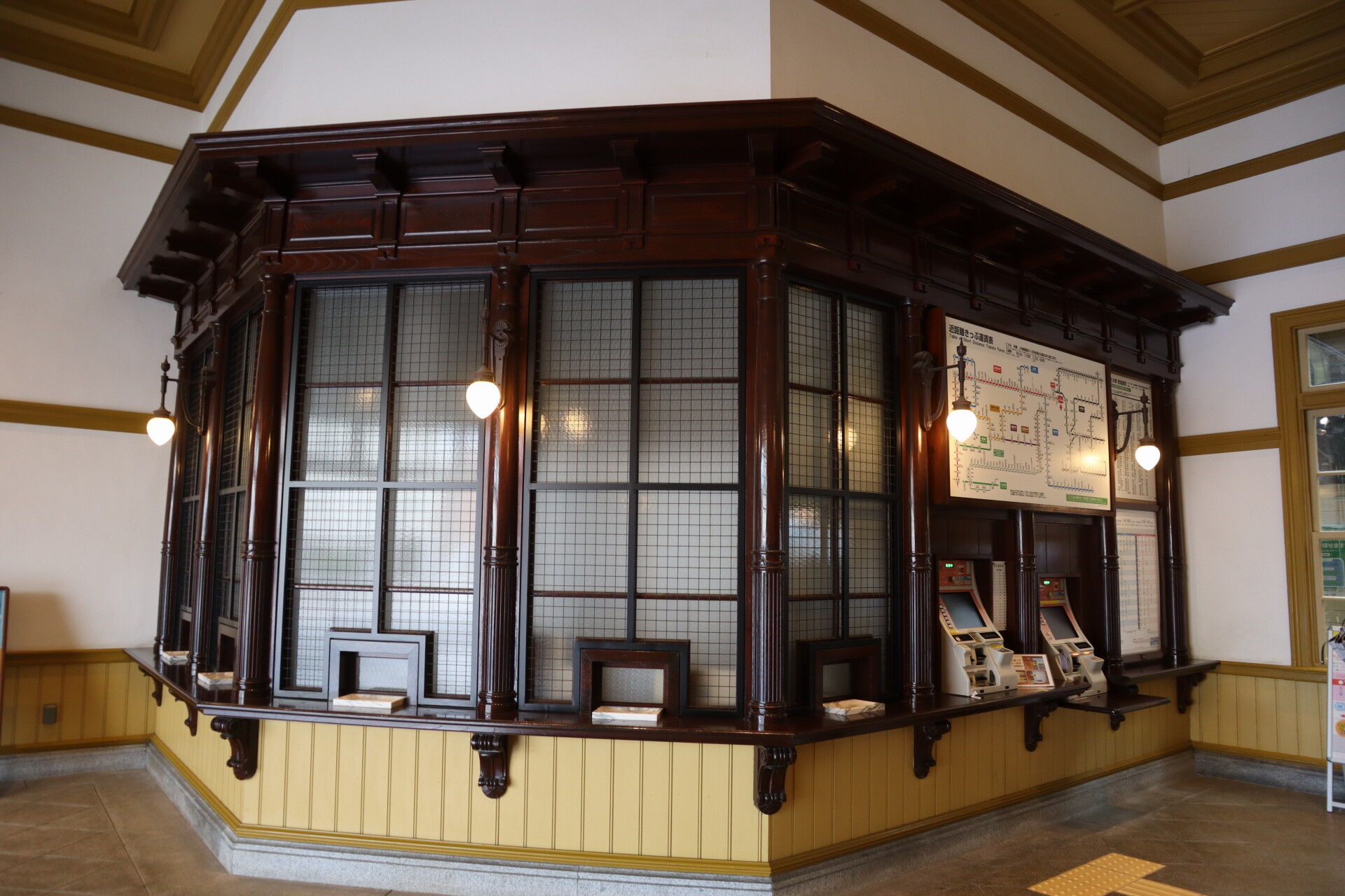 自動券売機を置きながら出札口をモニュメントとして残し、機能と美観を両立した良いもの。