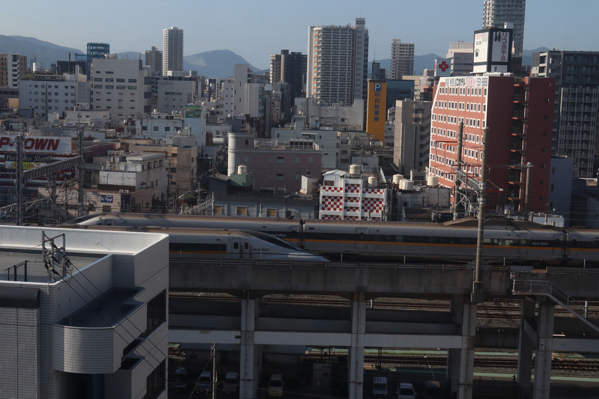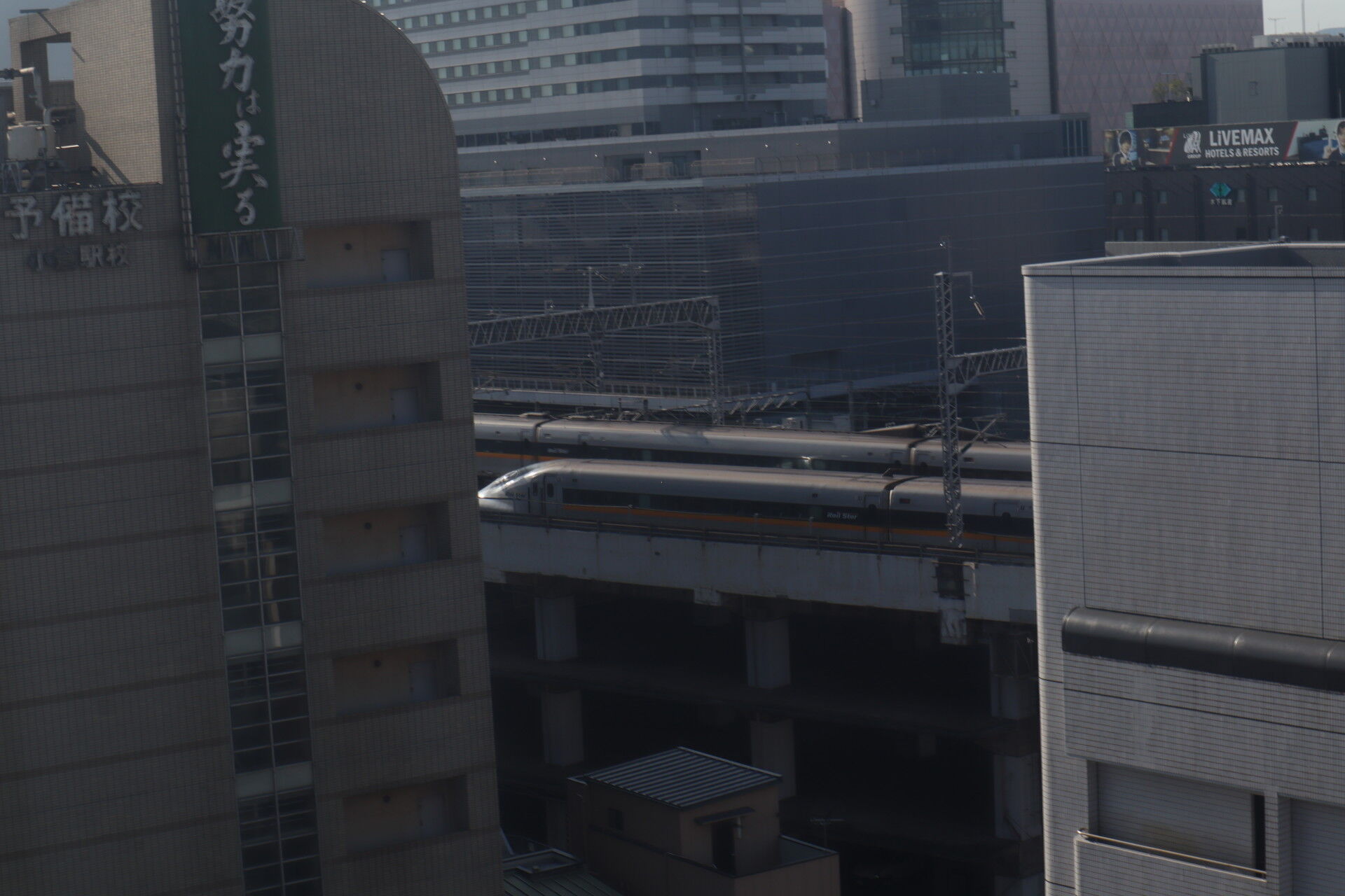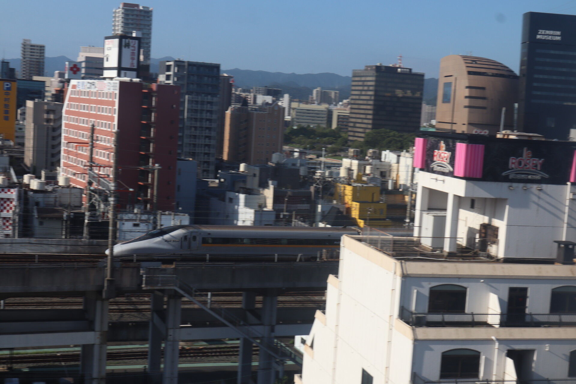 朝起きるとホテルの窓には新幹線