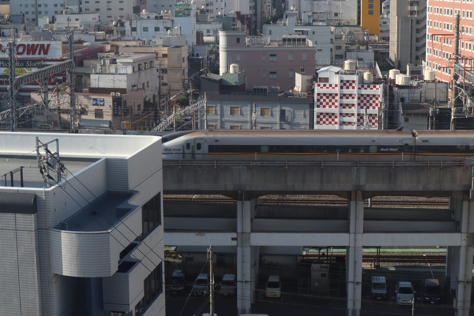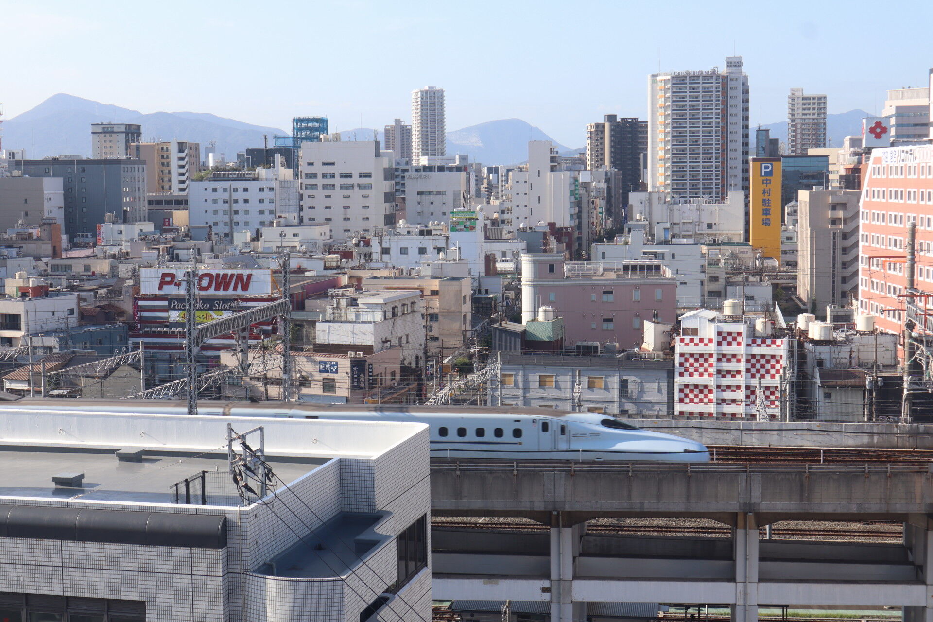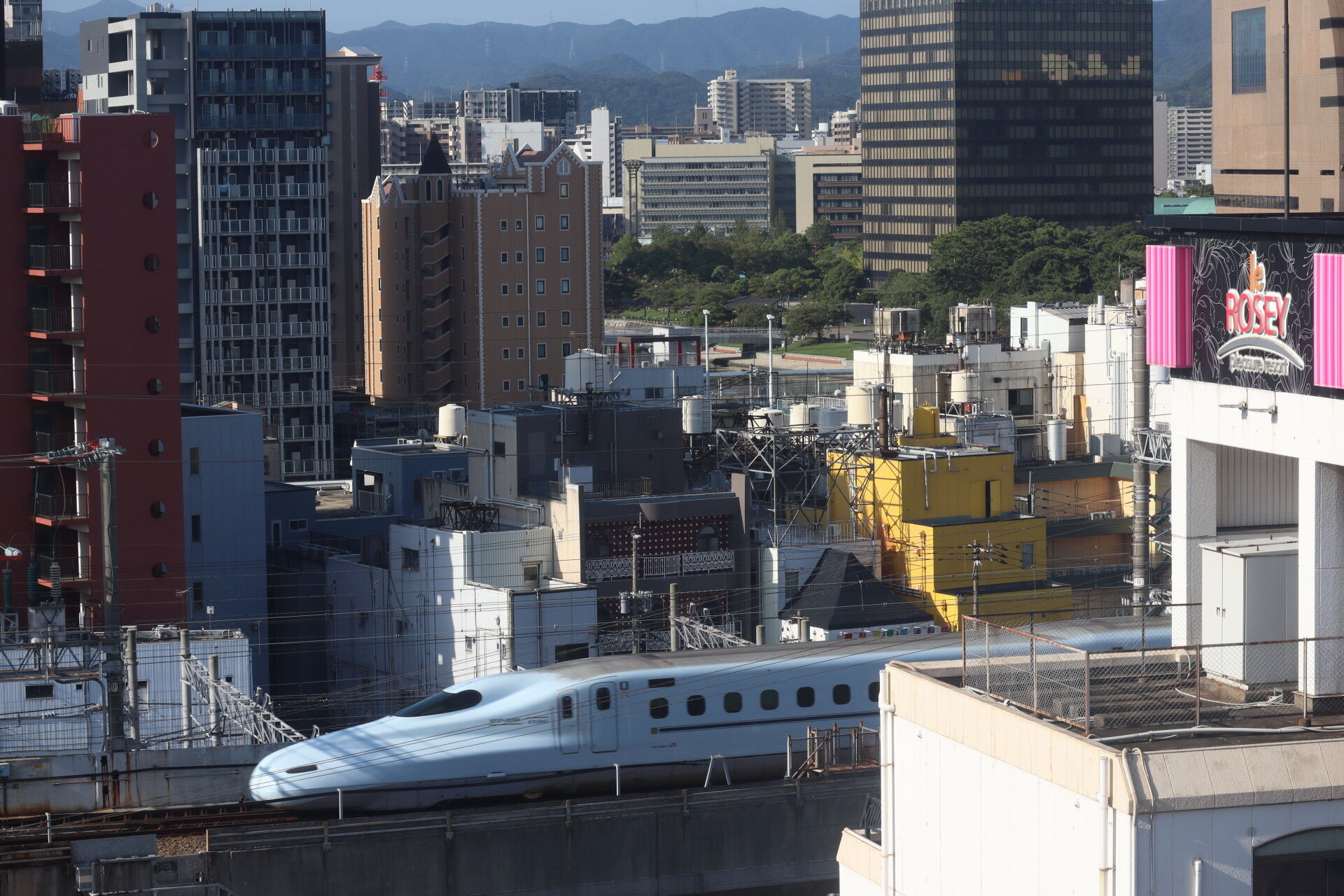 朝起きるとホテルの窓には新幹線