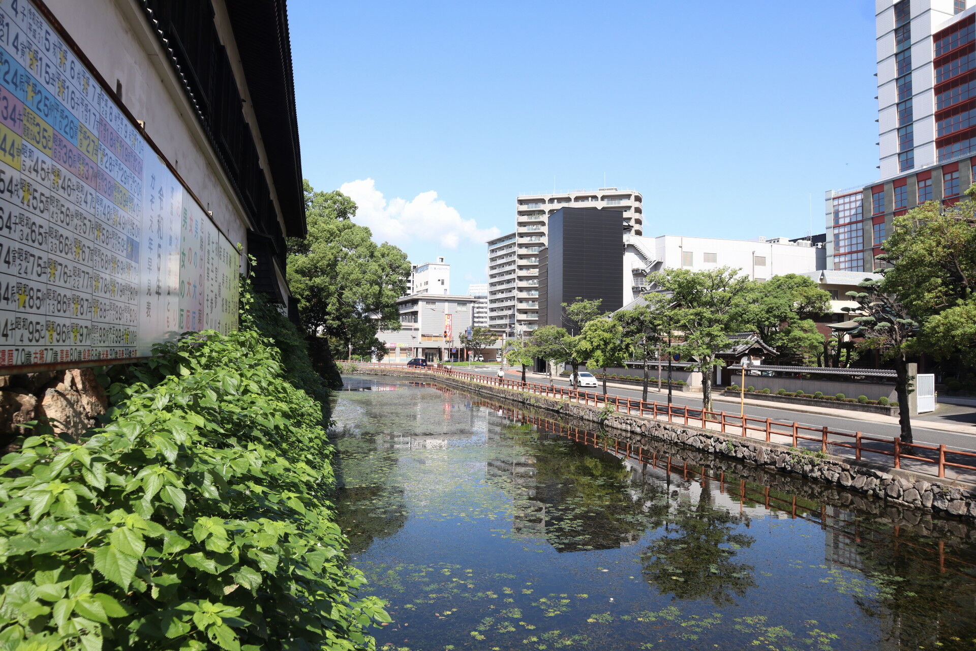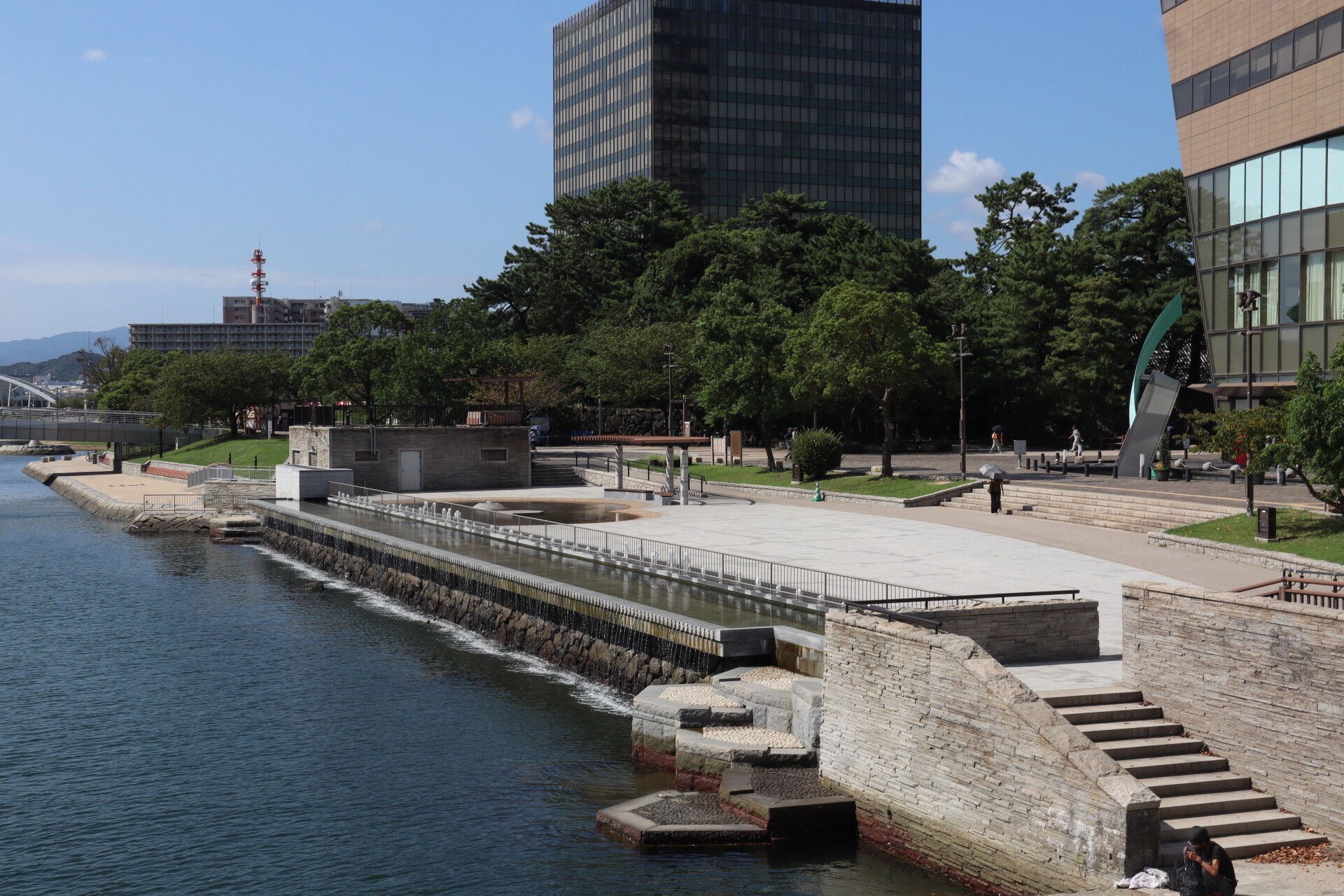 堀の穏やかな水面に高層ビルがきらめきます。