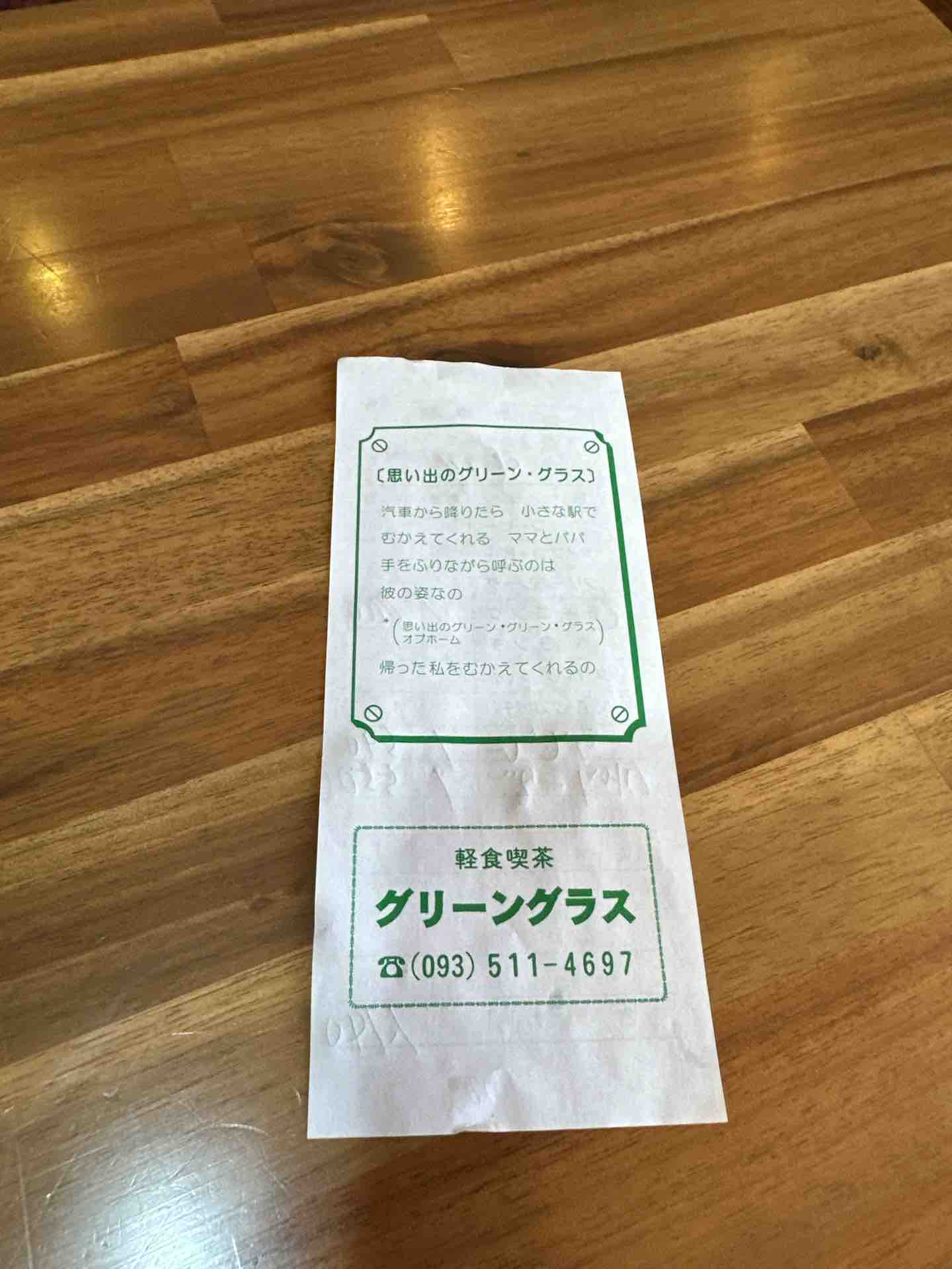 「思い出のグリーン・グラス」という洋楽の歌詞が記された伝票。