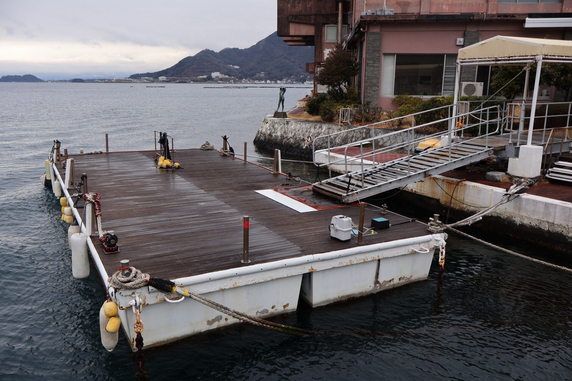 あと、満潮なのか船の前に踏み台を設置していますね。岸壁が段々になっているのがわかりますか?