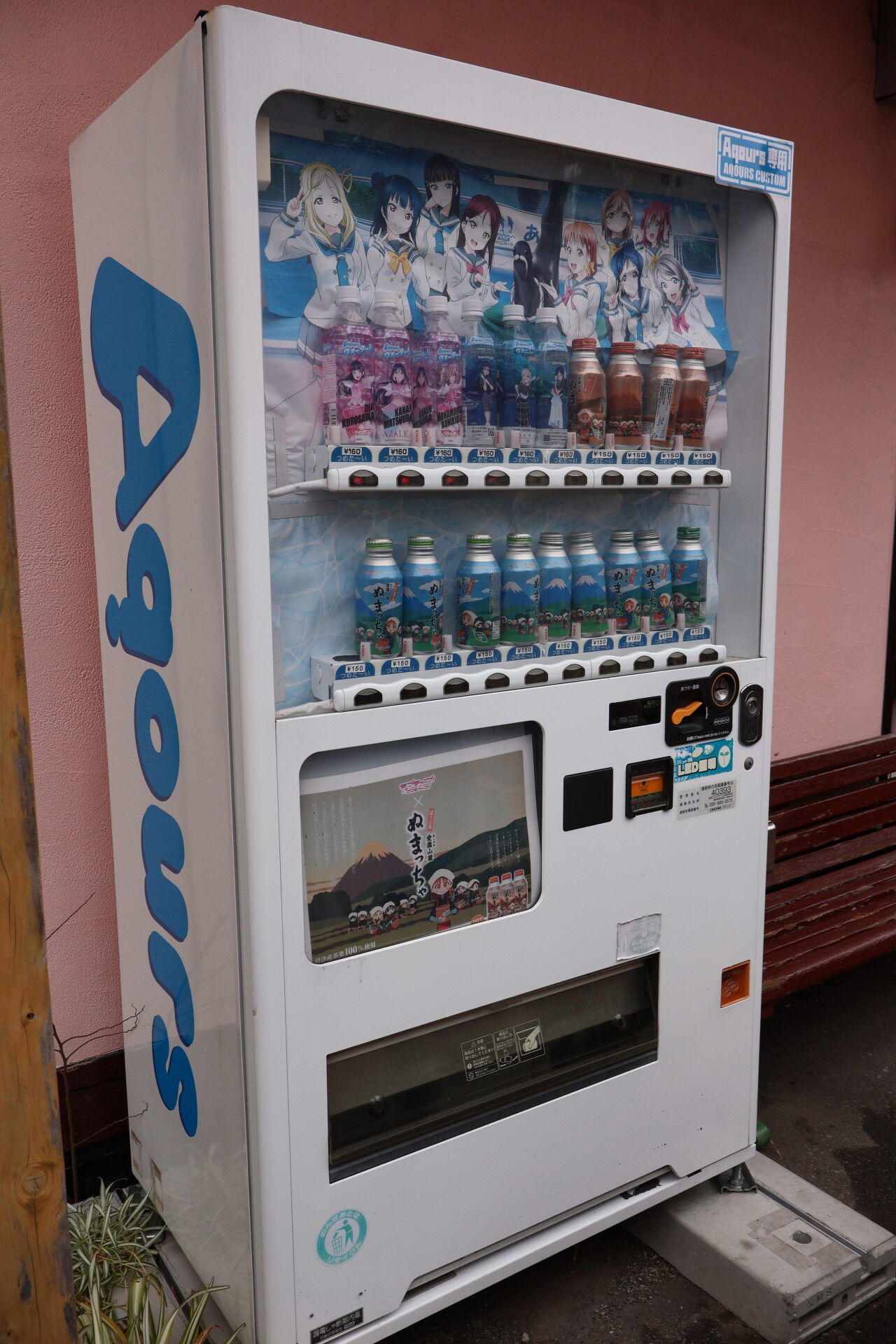 ラブライブ!自販機です。Aqoursというのはアイドルユニット名で、アクアと読むらしい。aquosはテレビ。