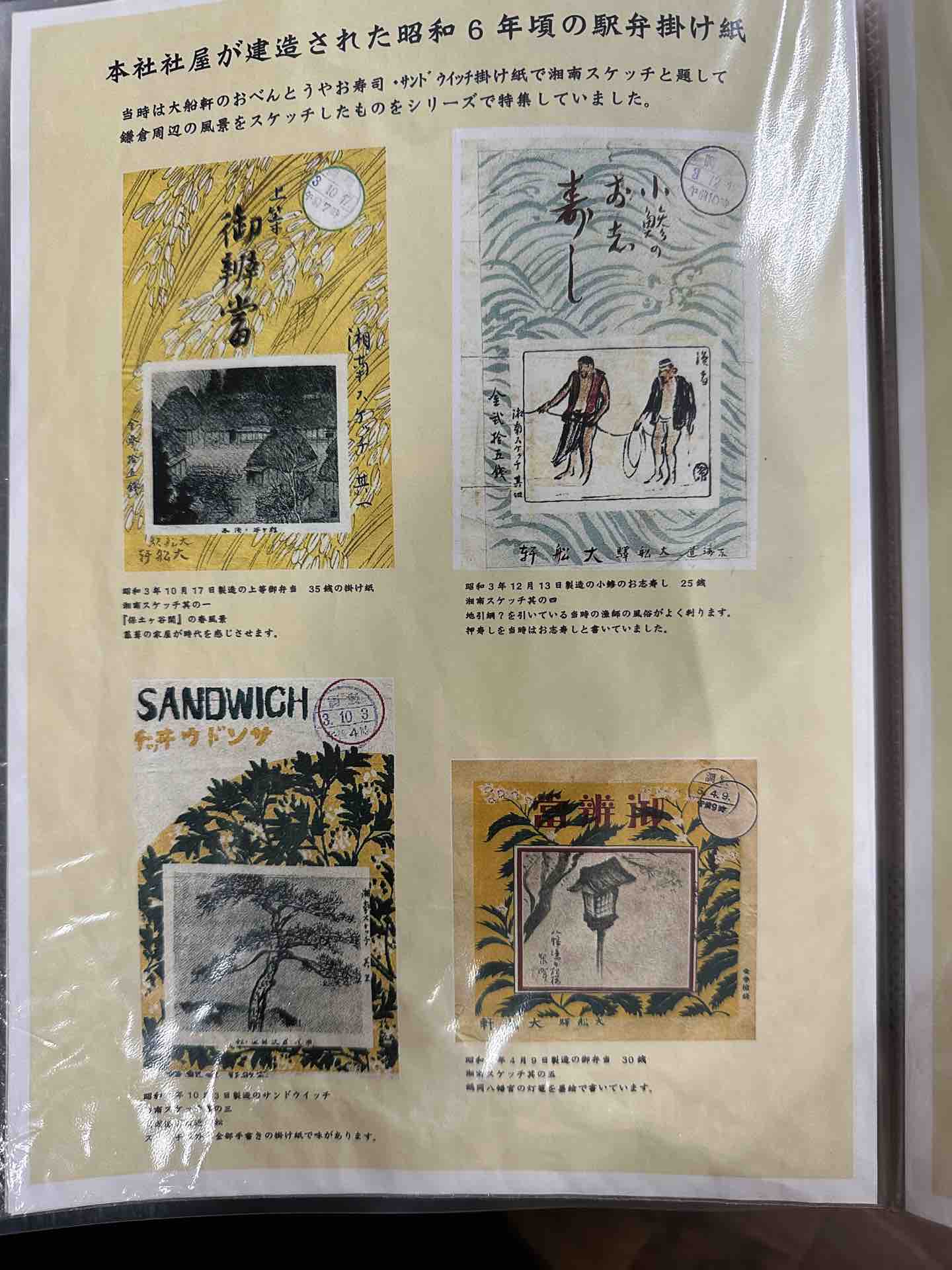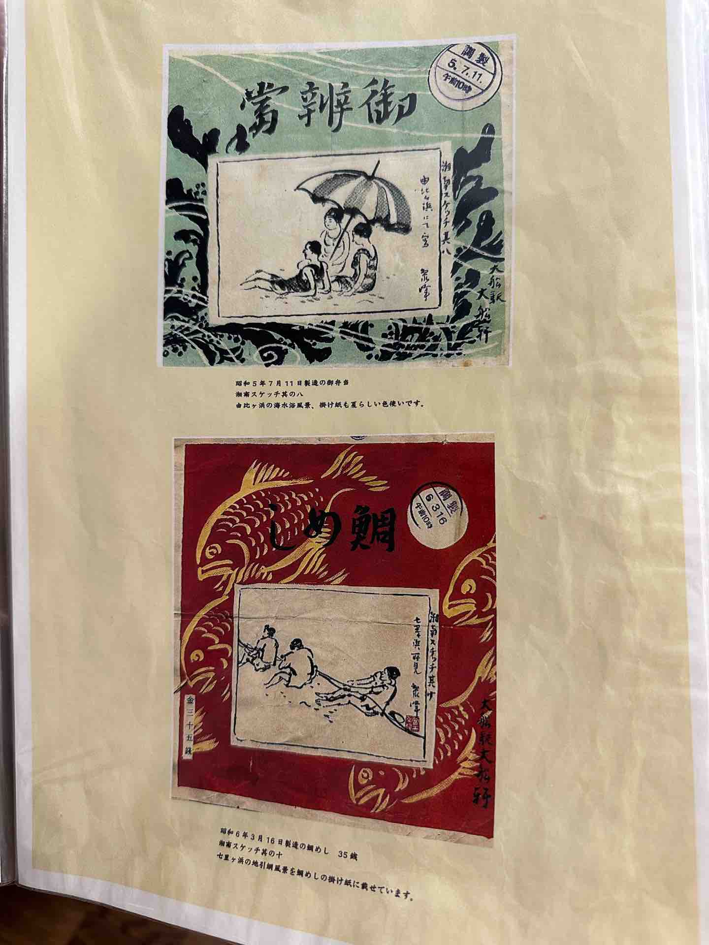 昭和初期の掛け紙は浮世絵の文化を受け継いでいるのか賑やかです。この頃は江ノ電の観光パンフレットなども精密な絵が多く、豊かな文化があったことが伺えます。