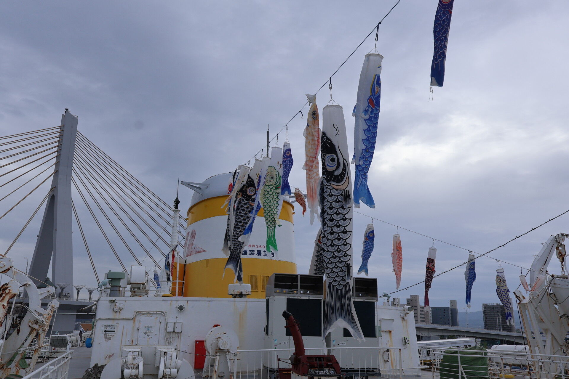 横にいるのは綱取船といい、かつて船首を岸壁につける時にロープを持って岸壁に届ける役割を担っていました。