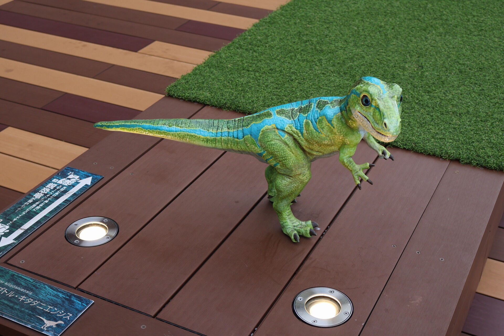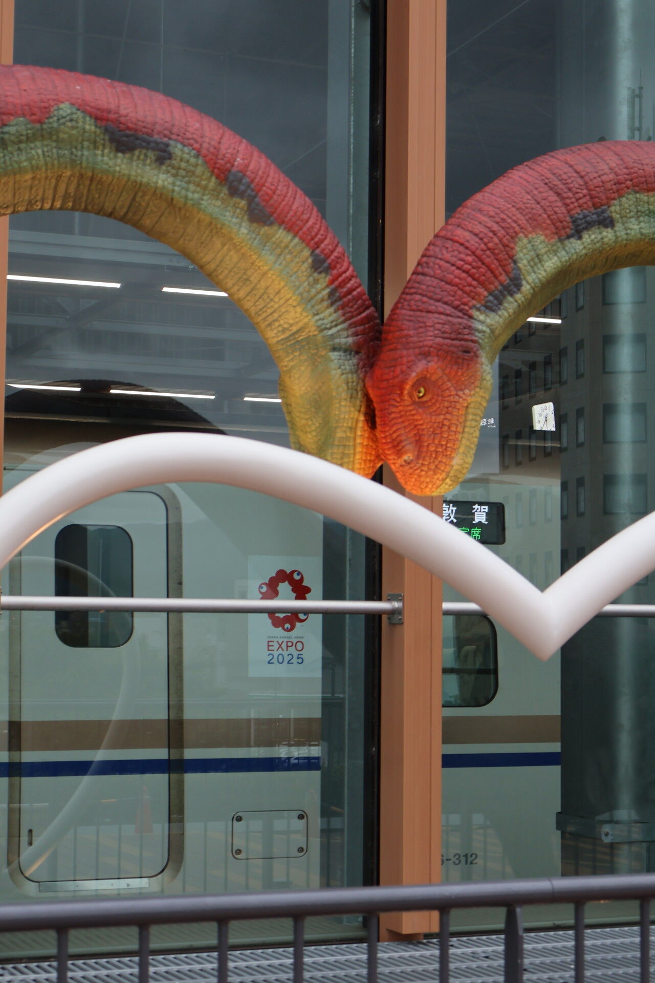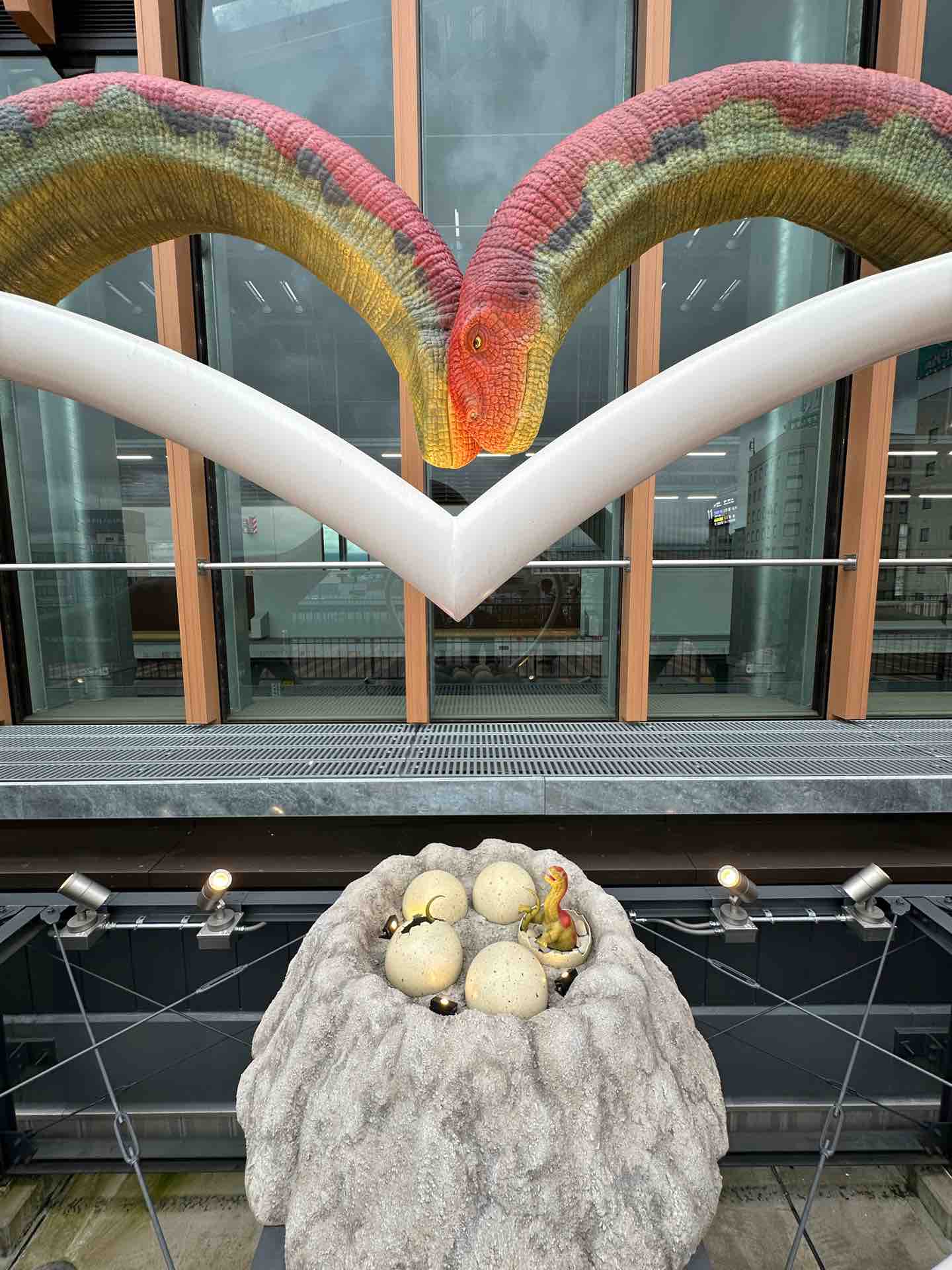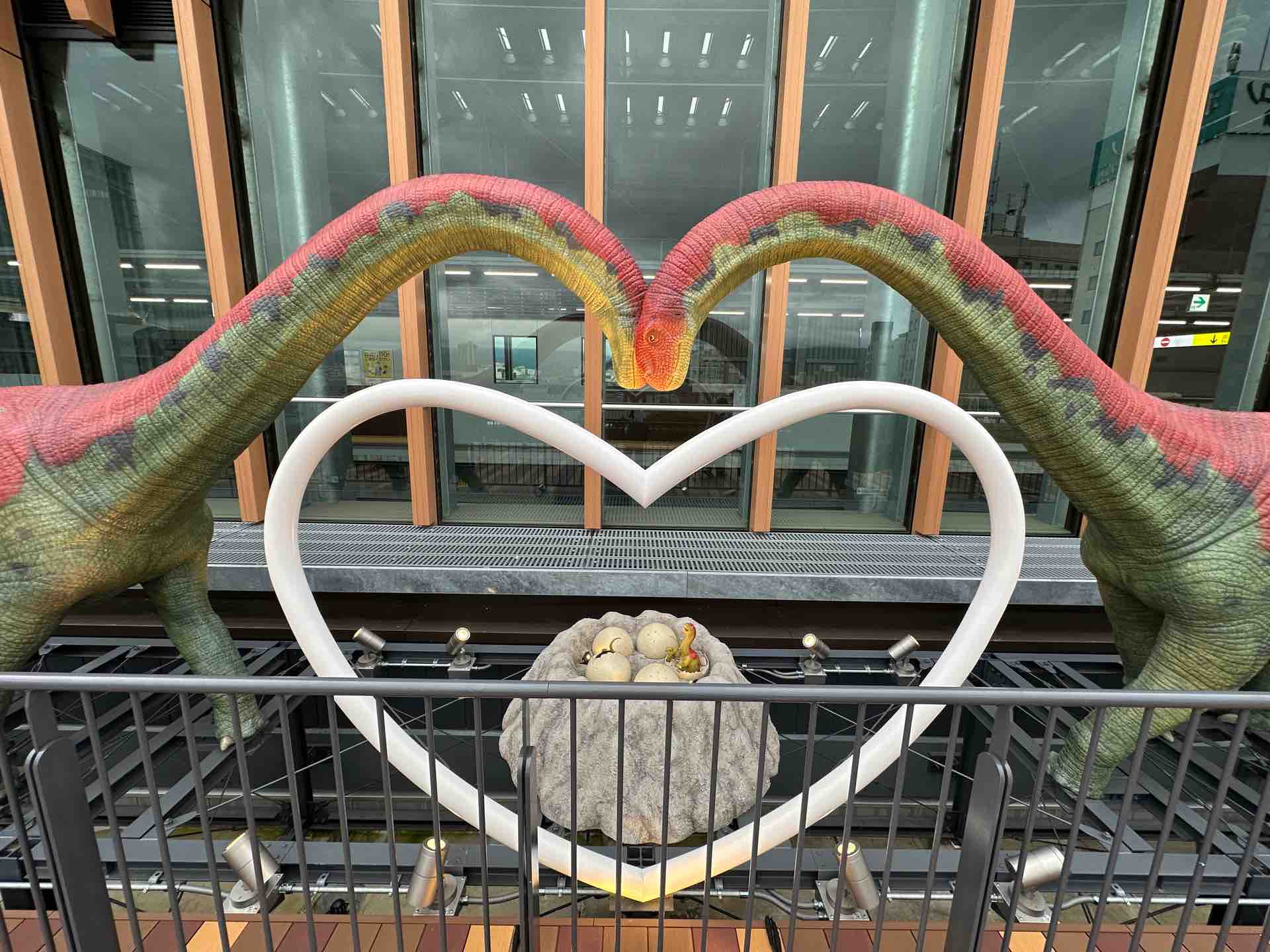 さっき新幹線ホームで見た恐竜オブジェを見に行きましょう。