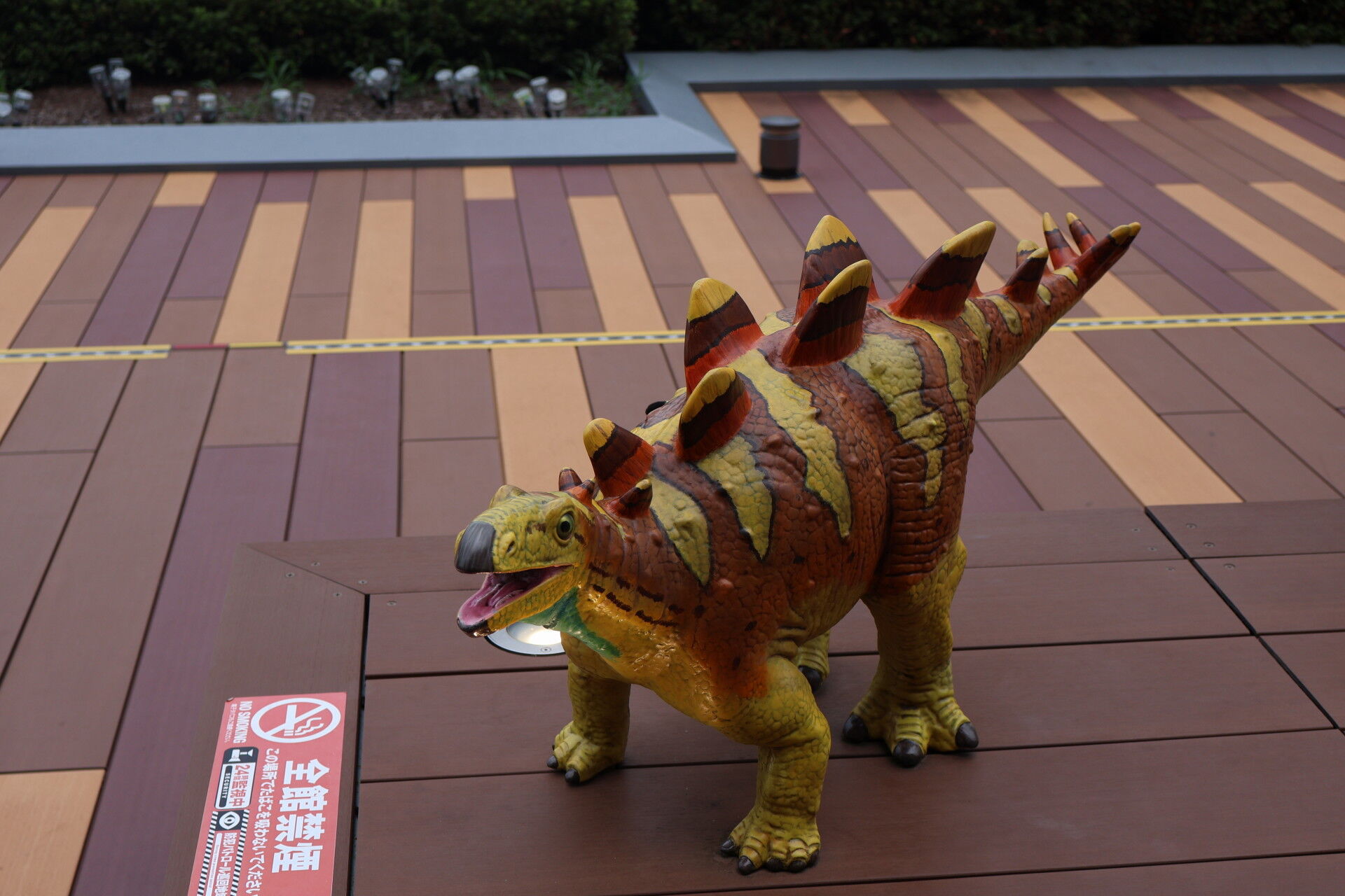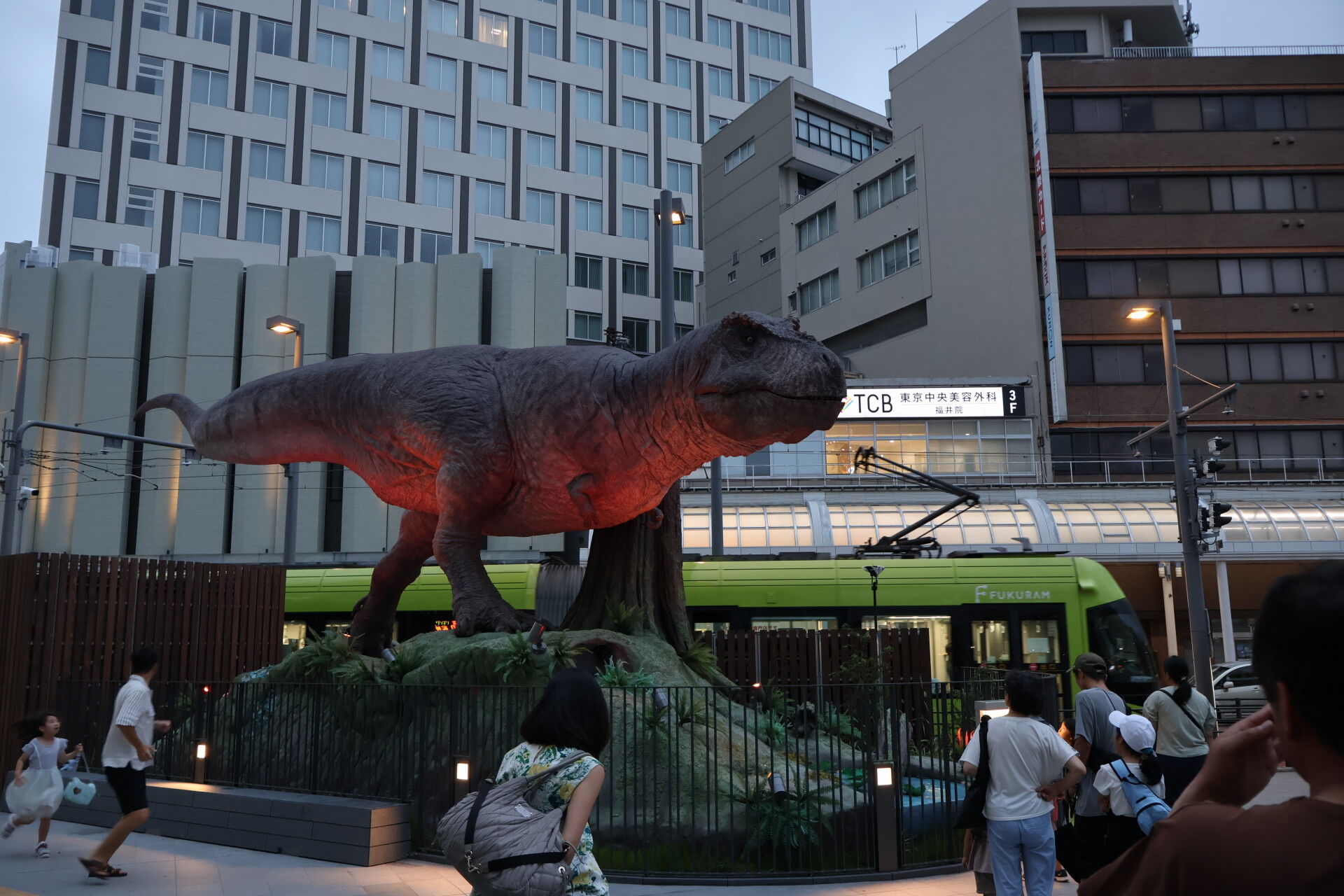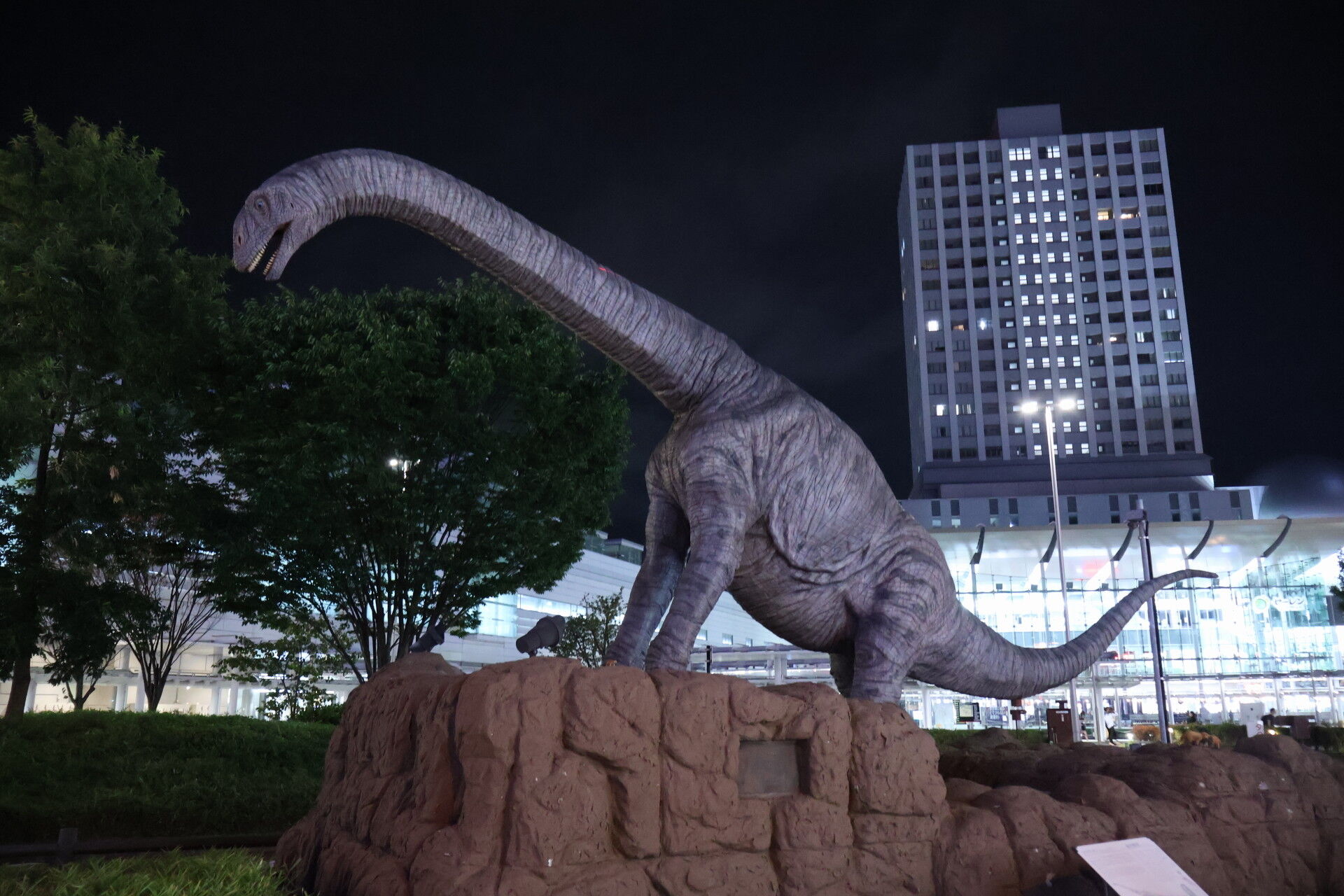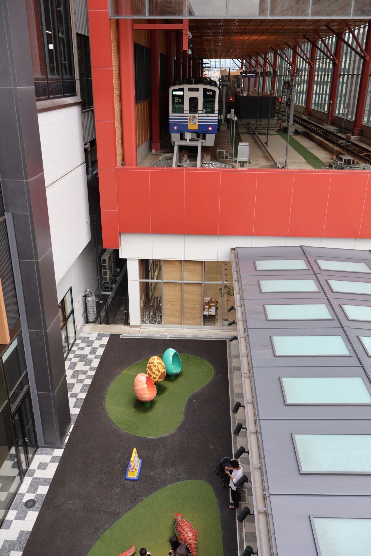 さっき新幹線ホームで見た恐竜オブジェを見に行きましょう。