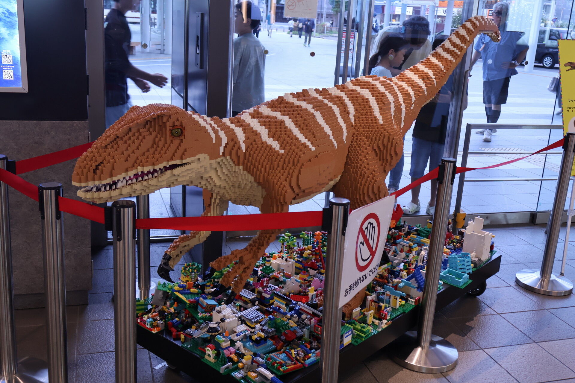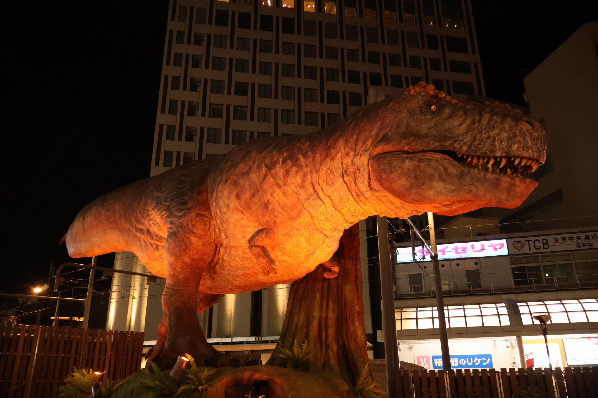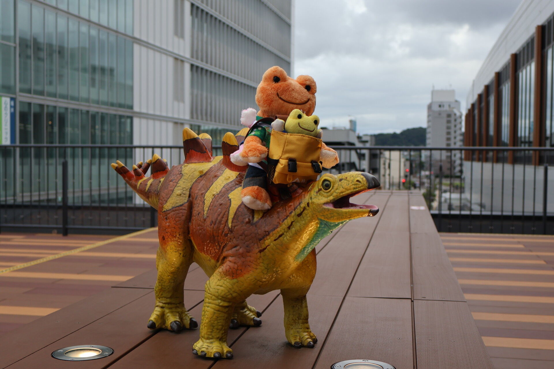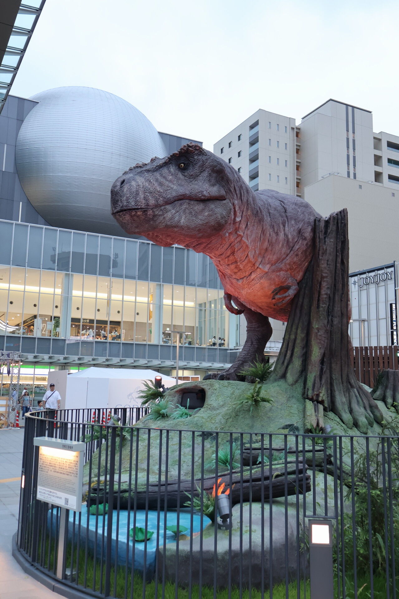 さっき新幹線ホームで見た恐竜オブジェを見に行きましょう。