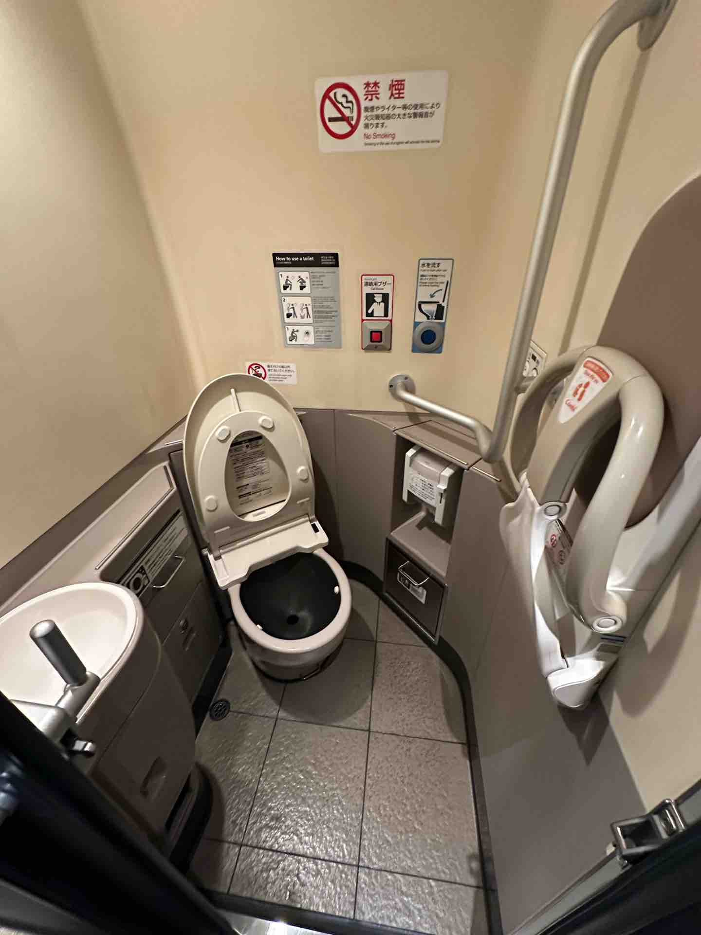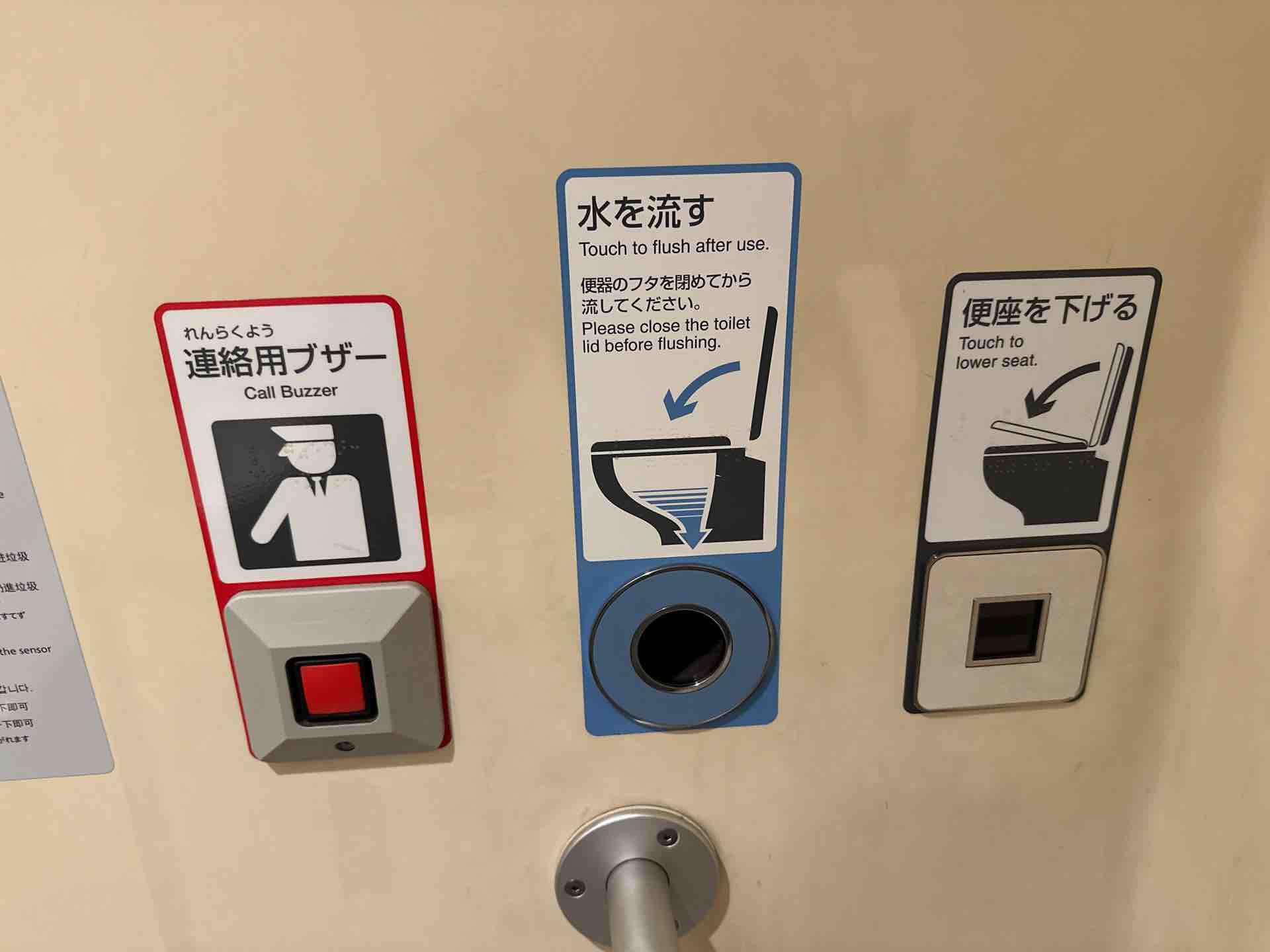 これは新幹線に乗りまくって気づいたんですけど、N700ラージAの編成だとこの「便座を下げる」というセンサーの位置が流すボタンの隣にあって、パッとわかる位置になるように改良されているらしいんですよね。