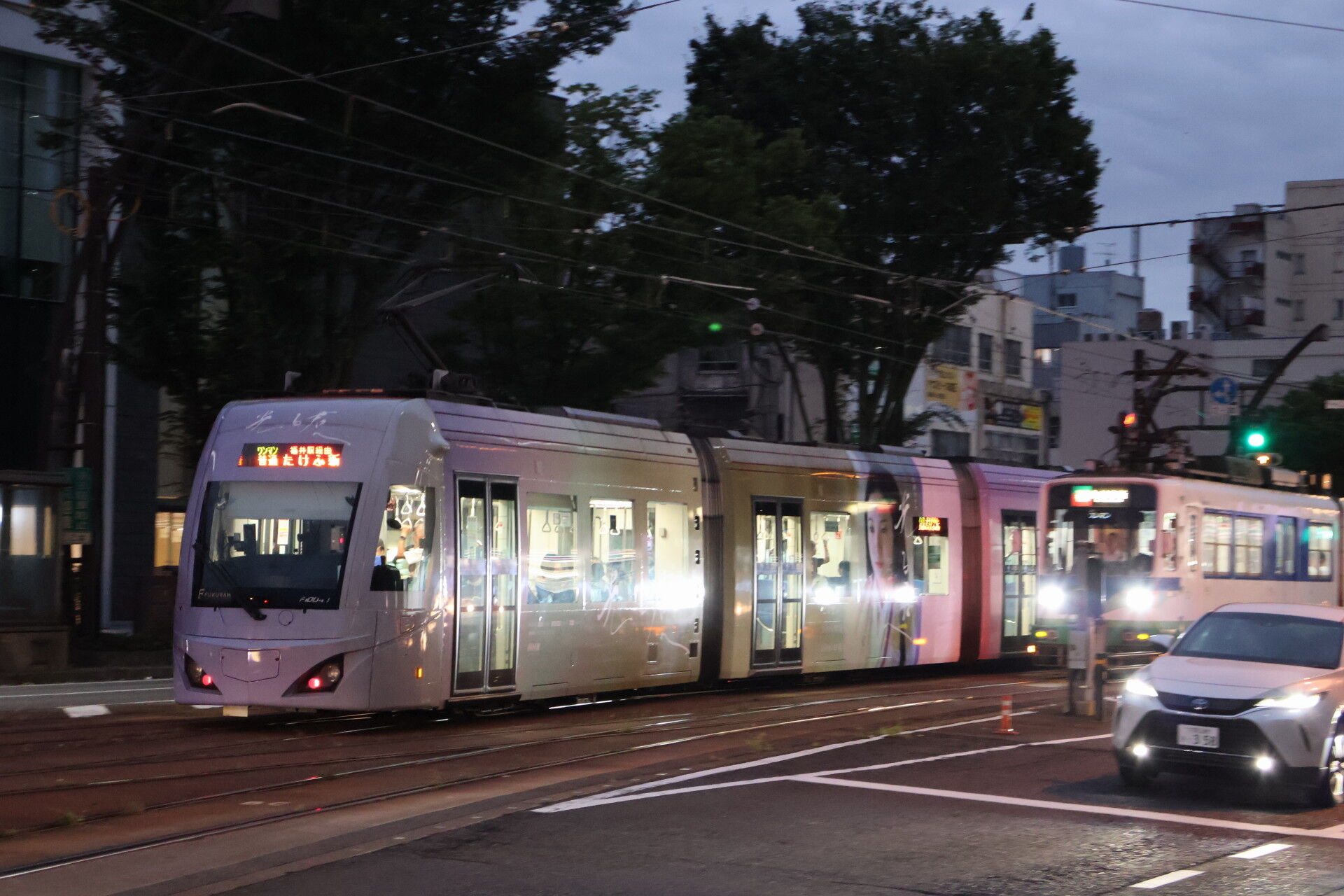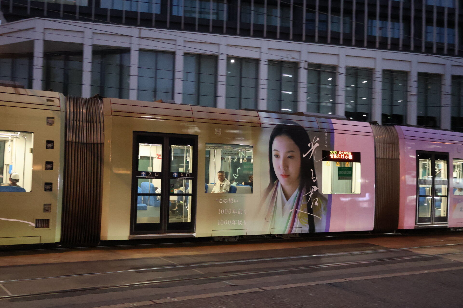 光る君へ のラッピング電車がいました。