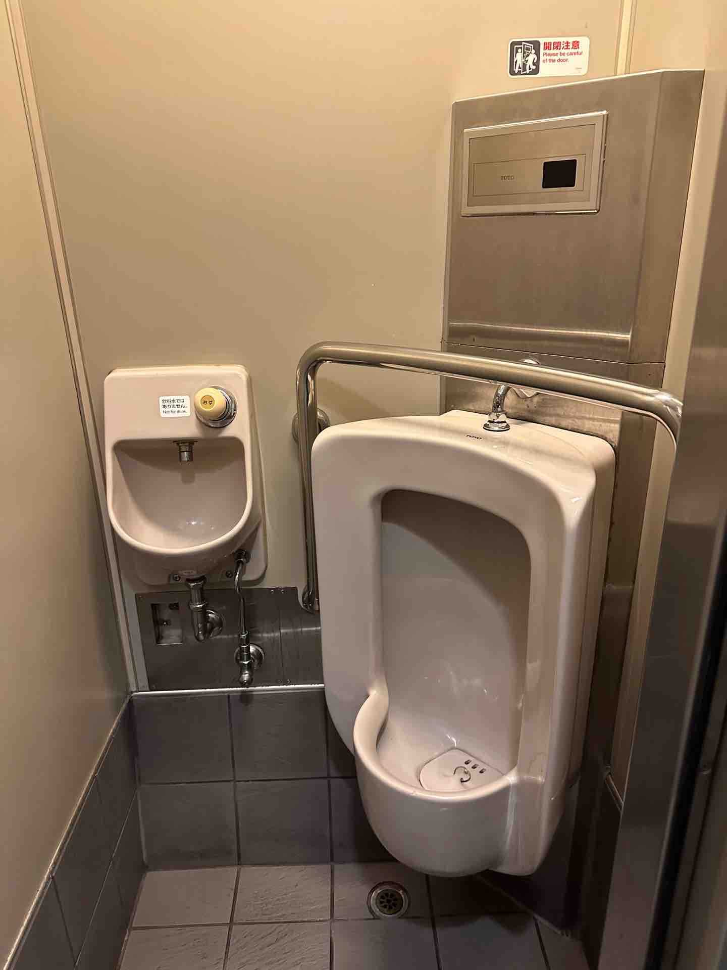 男子トイレです。開き戸になっていますが、これ寄りかかると開いてしまって危険なのでこのドアは最近採用されなくなってきています。