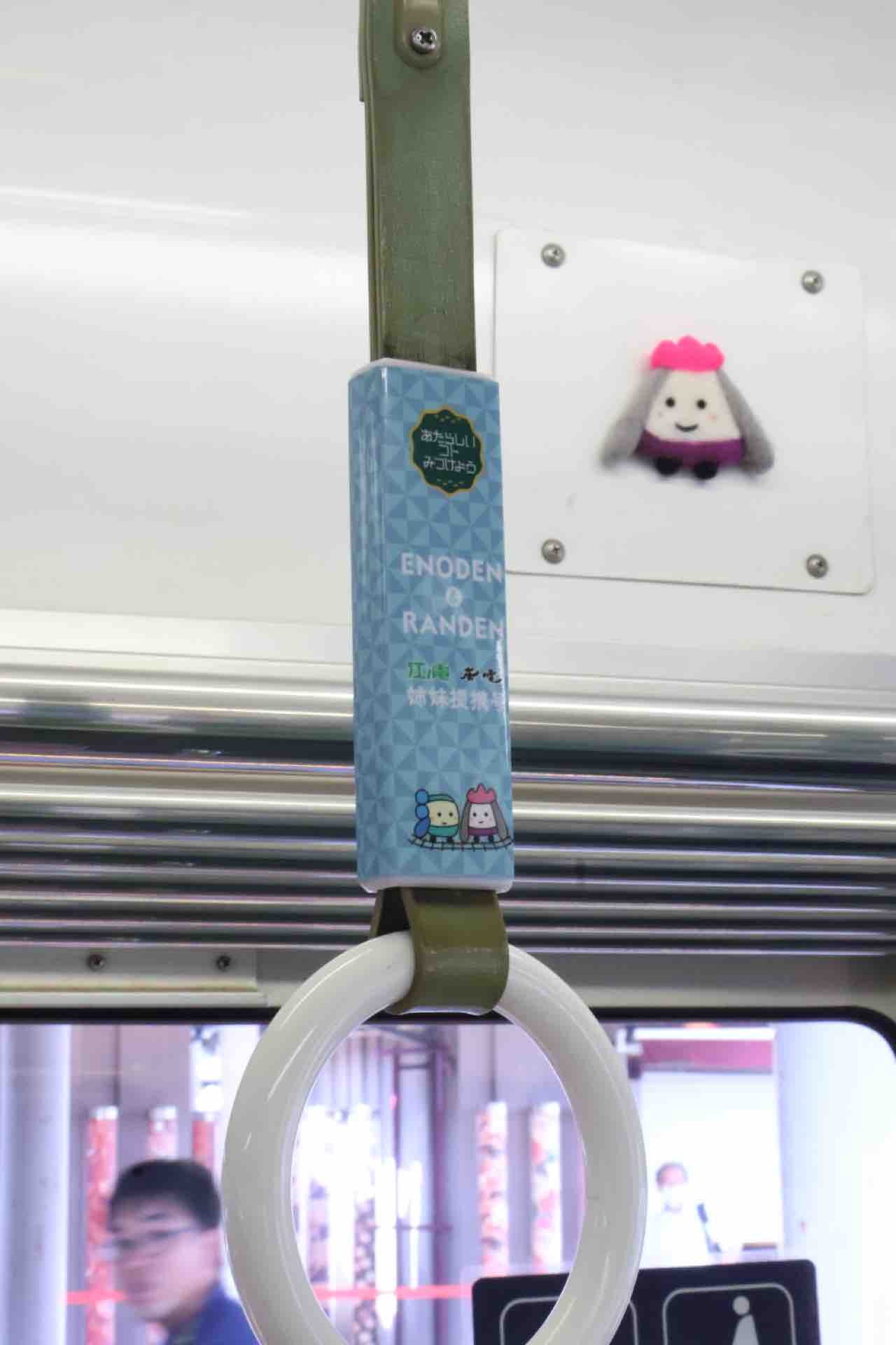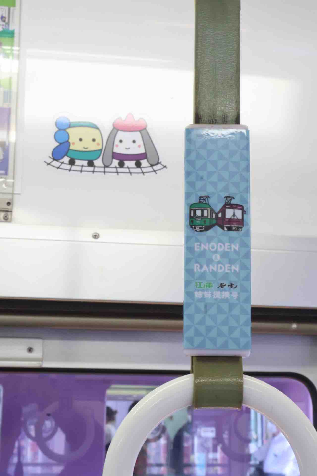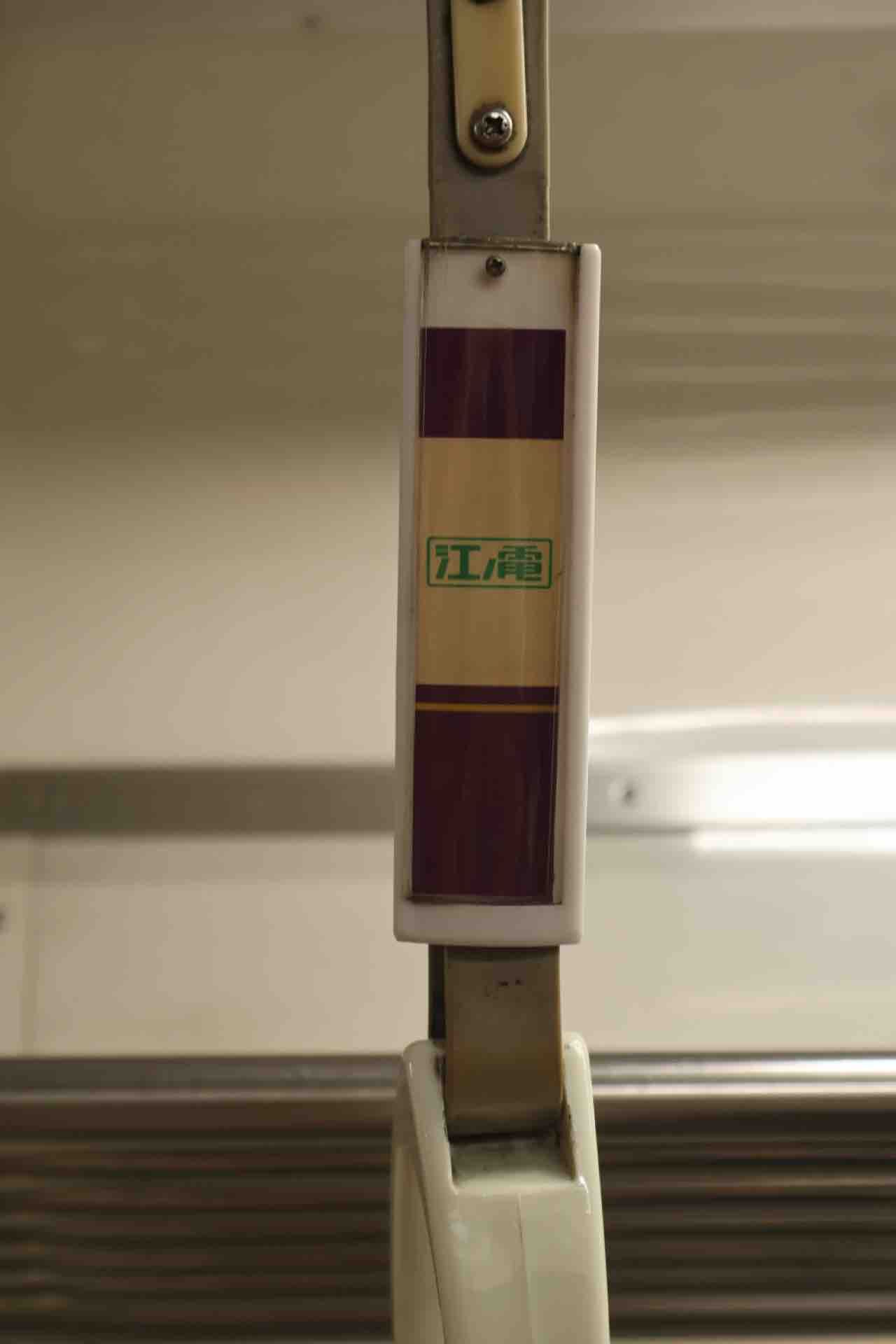 でも嵐電にもこういうロゴのついた吊り革はないんですよね。そもそも吊り革に広告をつけている車が少ないという。なんのデザインが元になったのだろう…。