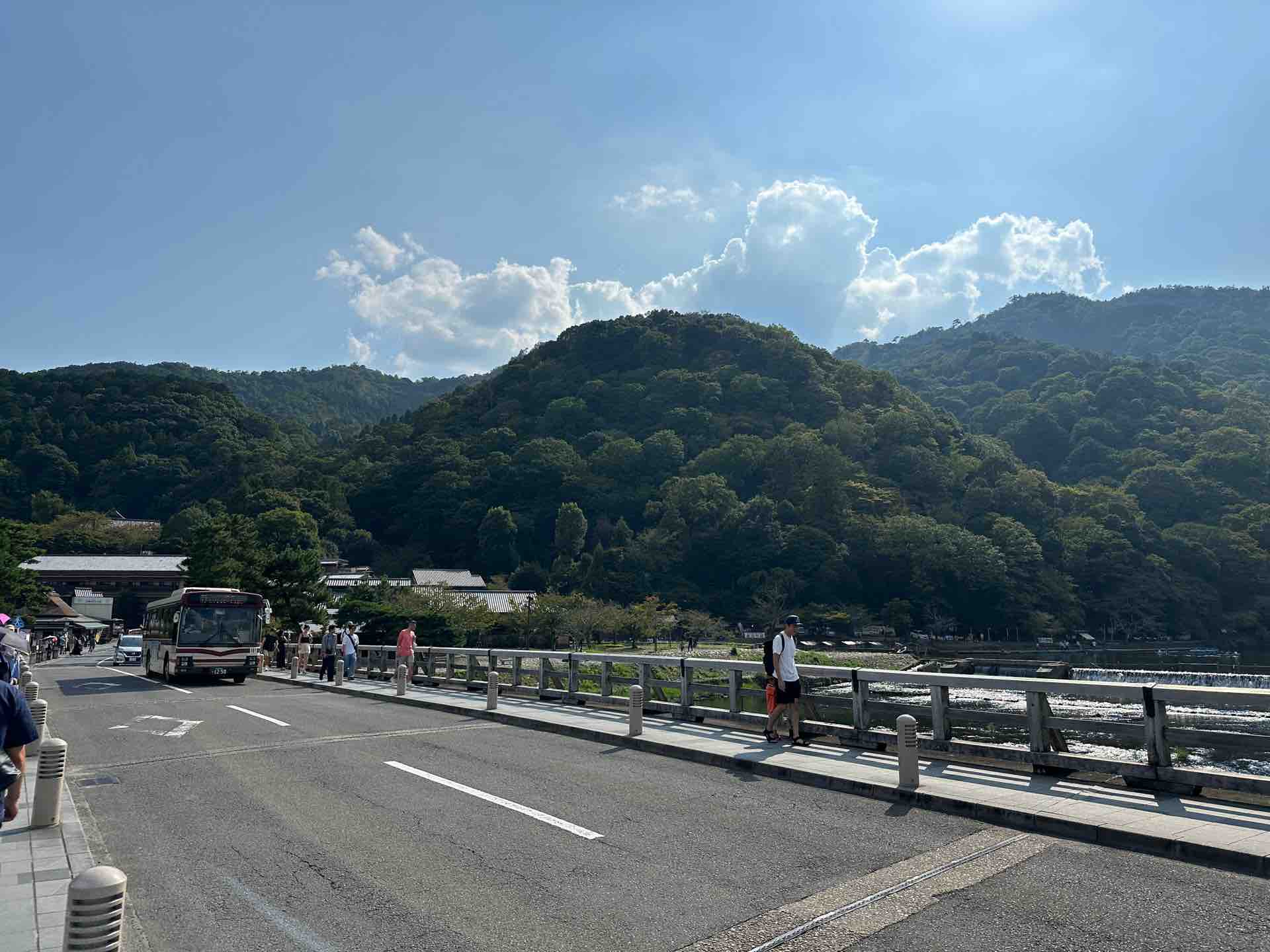 嵐山のこの広大な河原でまともな橋がこれしかないので混雑していますが、桜の時期のような混沌さはなく、一応橋としての役割を果たしていました。