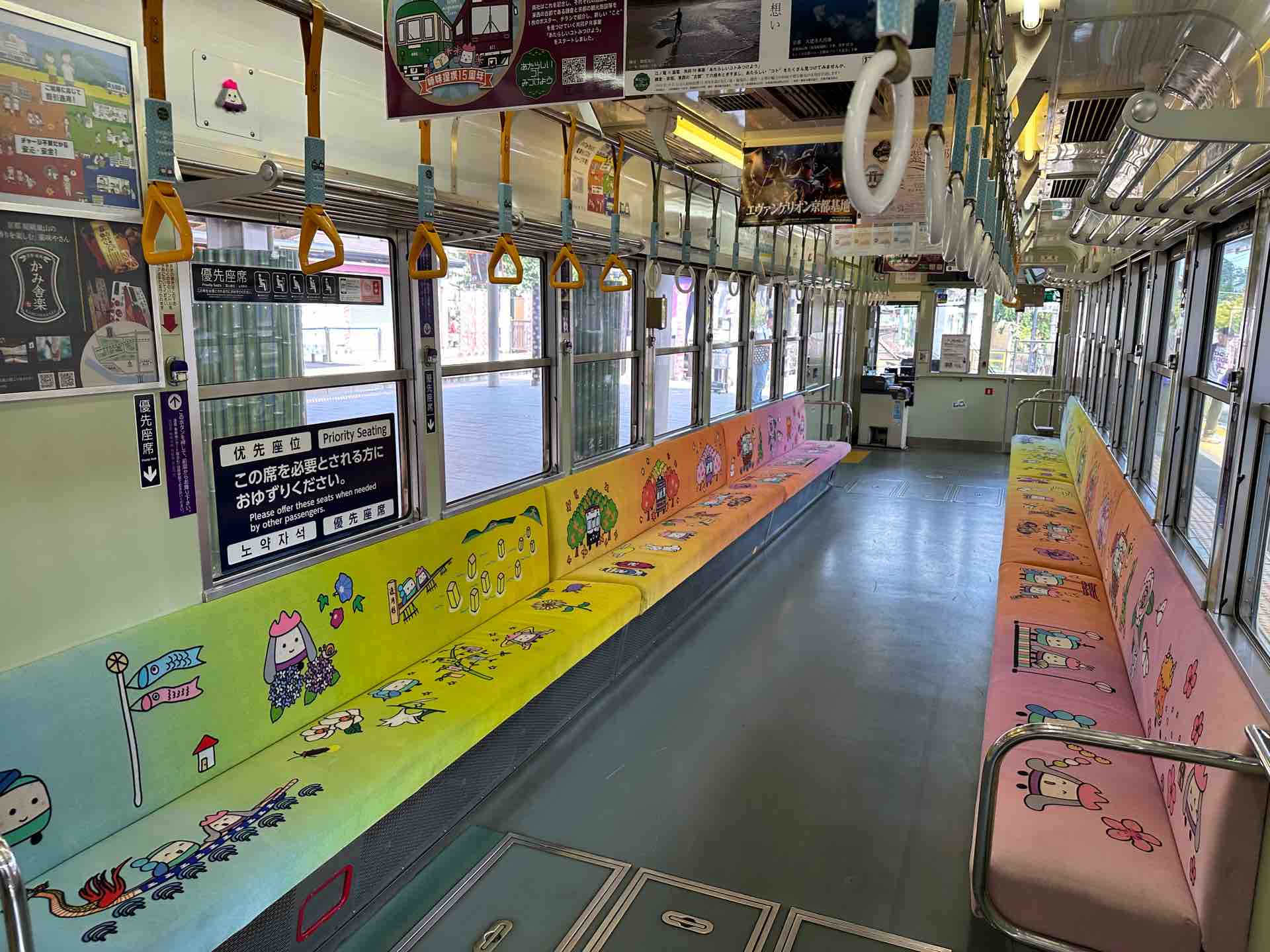 嵐電はこのカラフルなモケットを踏襲。きれい!
