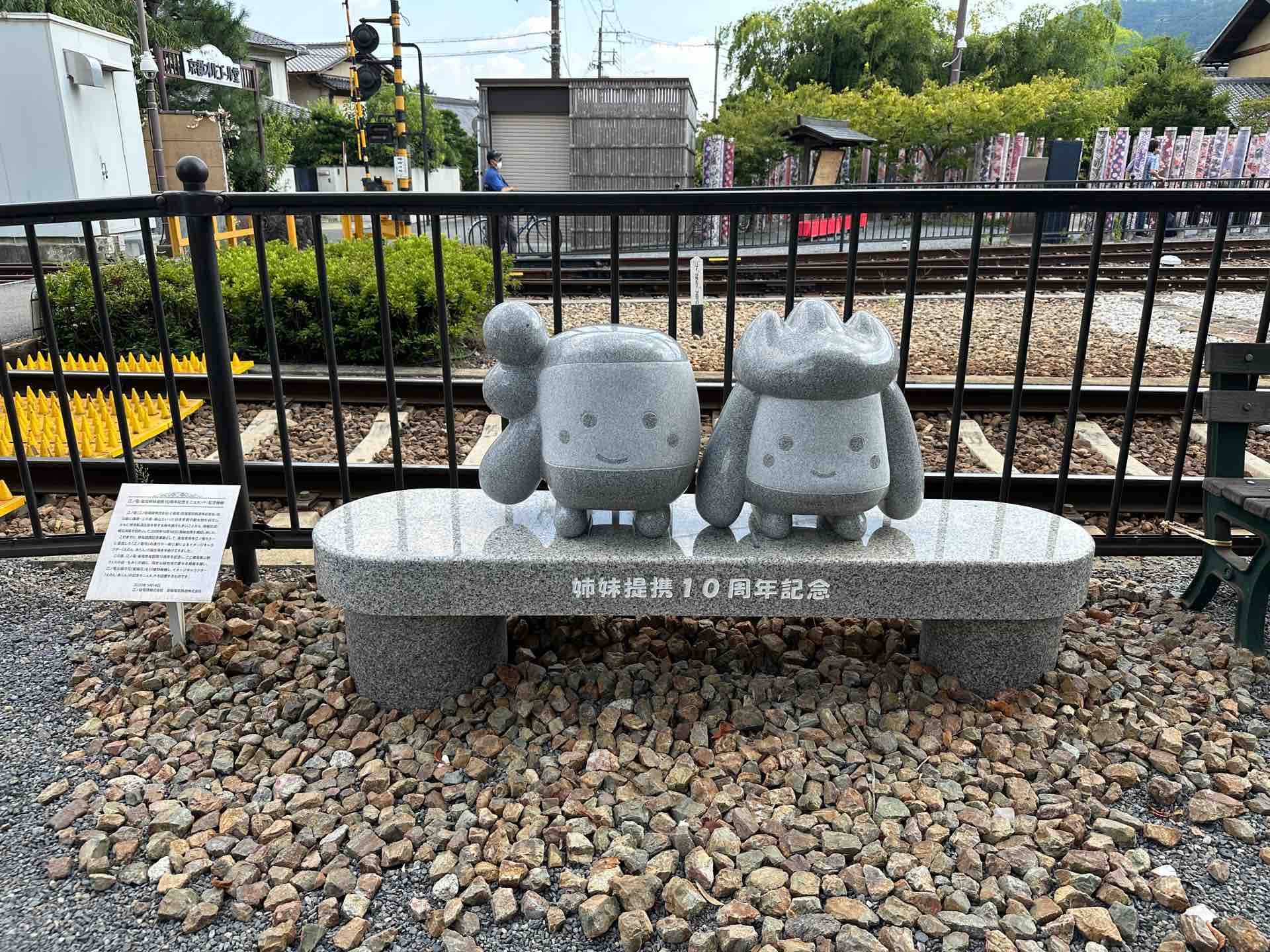 嵐山駅にあった10周年の石像。