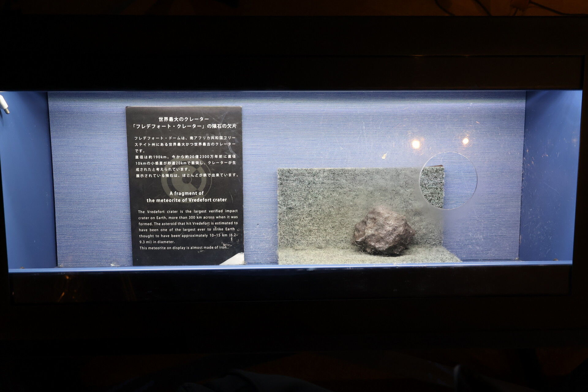 フレデフォートクレーターというところに落ちた隕石。鉄が含まれていて、触ってみましたが非常に重いです。