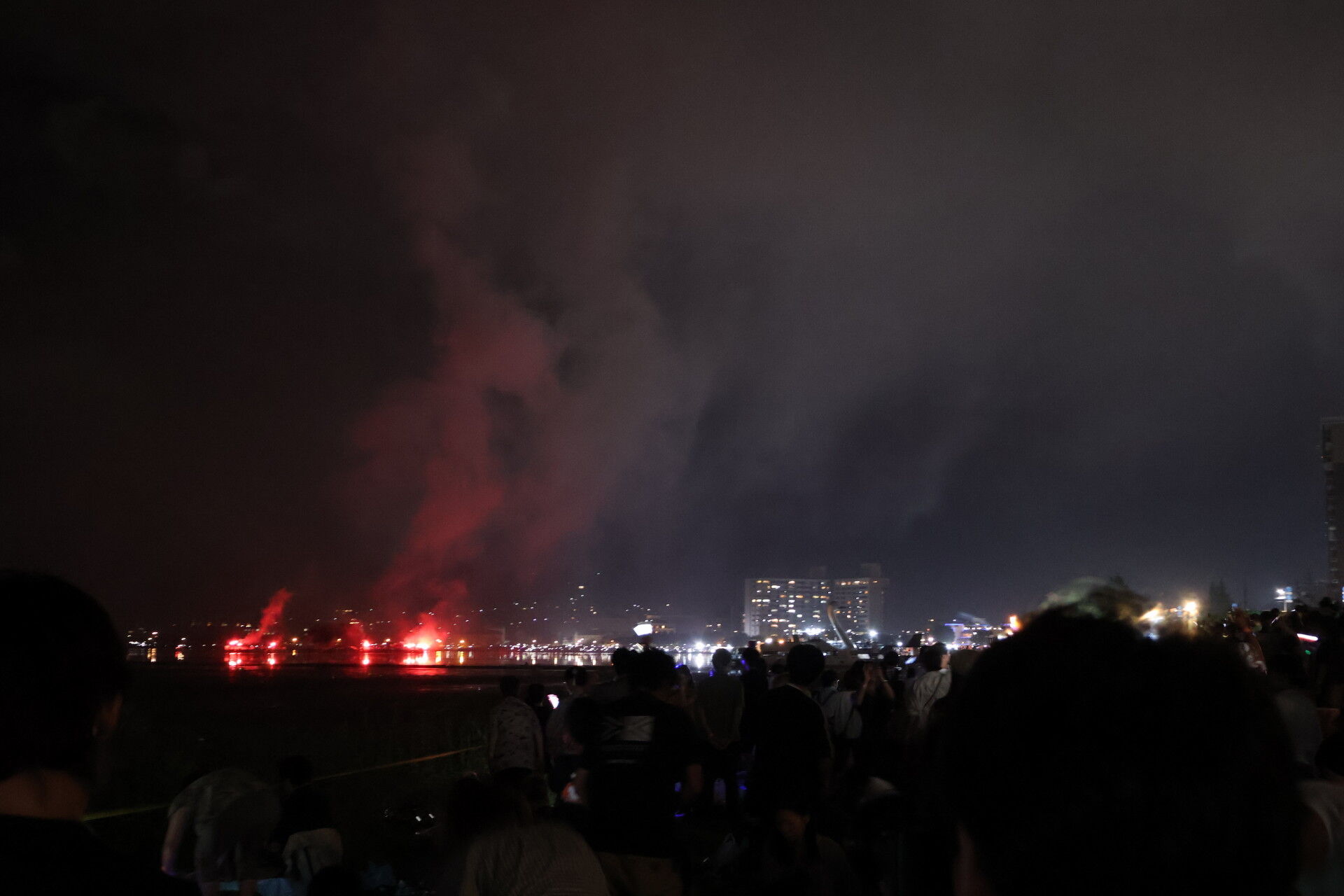 赤いライトを持った花火師さんたちが手を振っています。私たちもスマホのライトで応戦。
