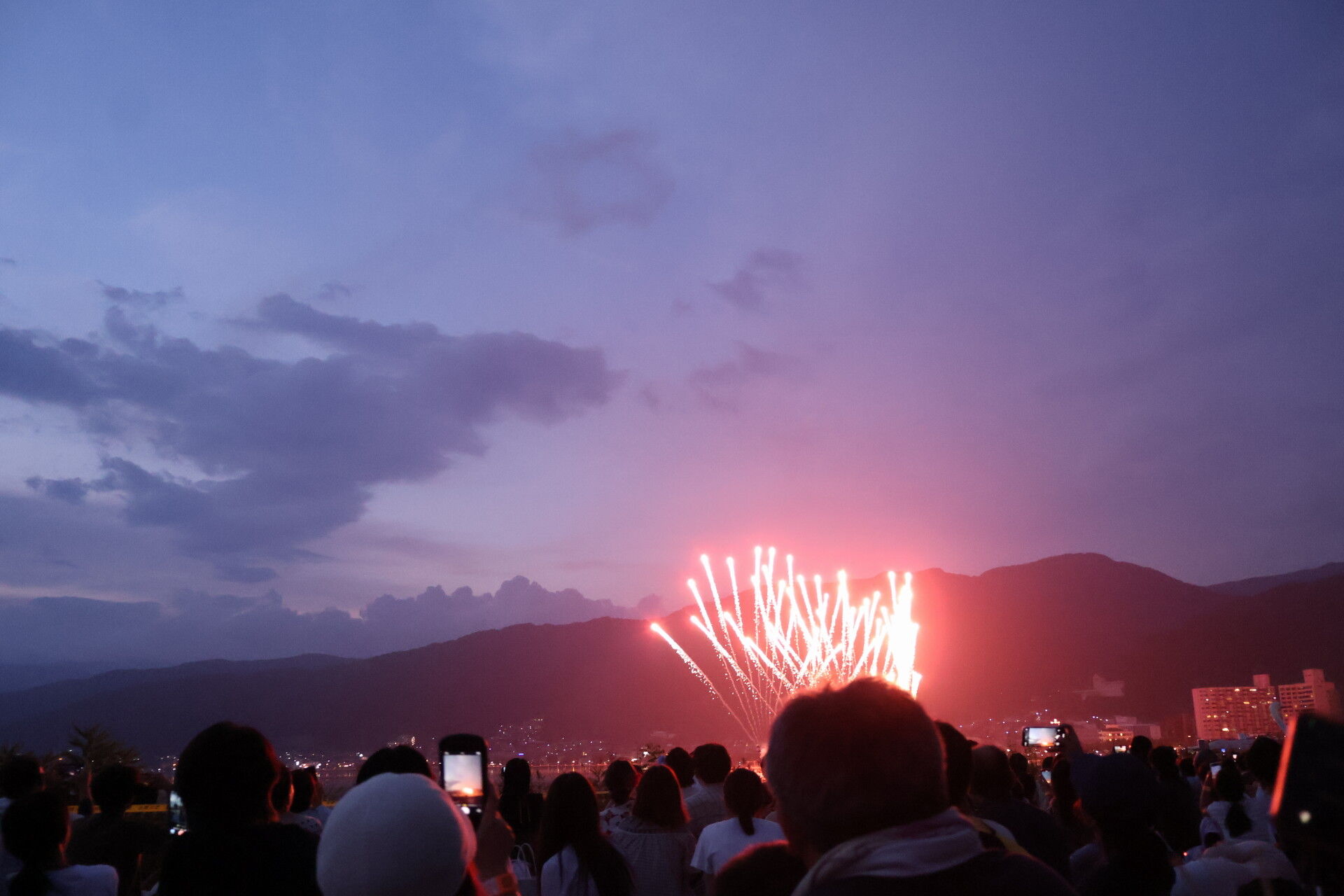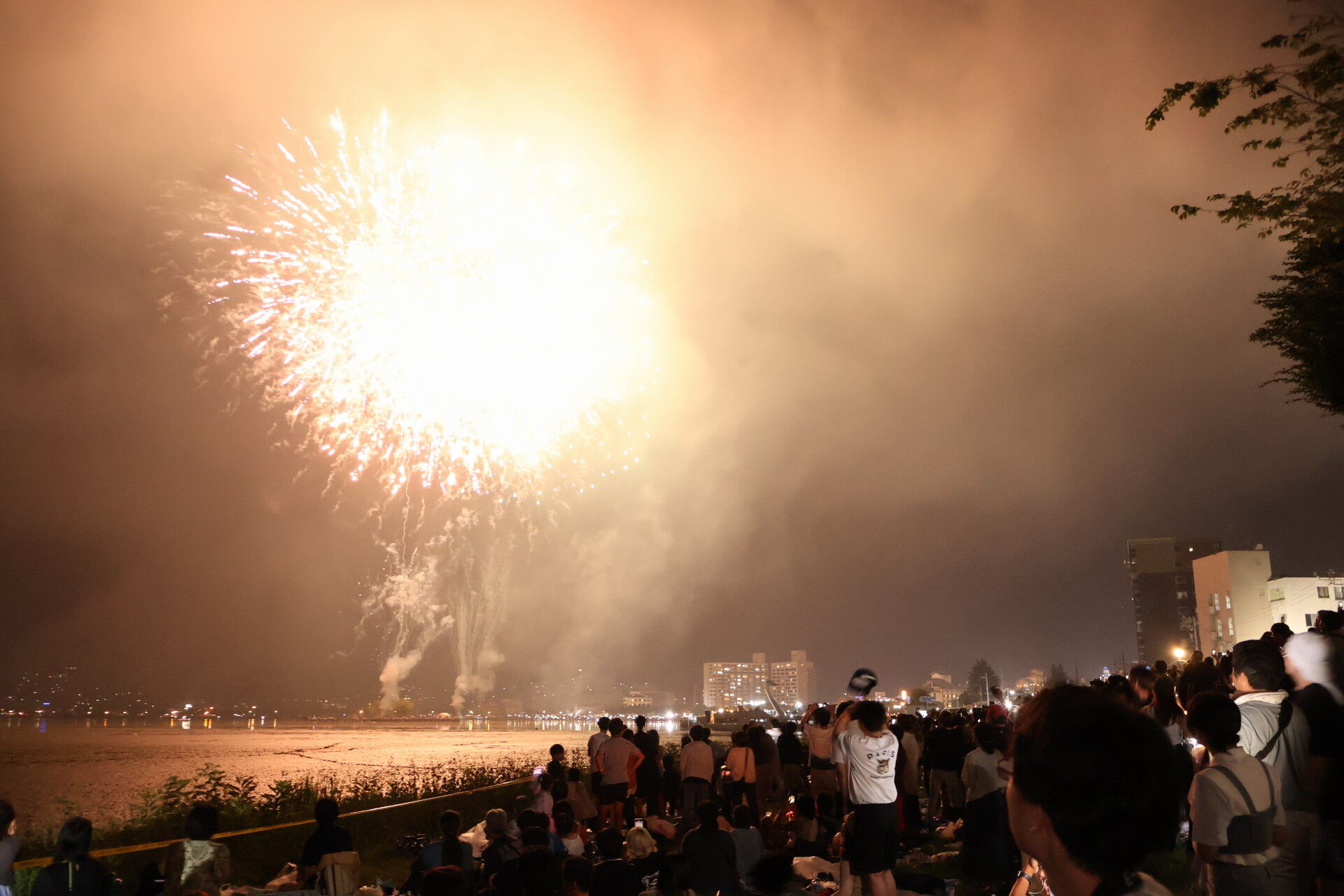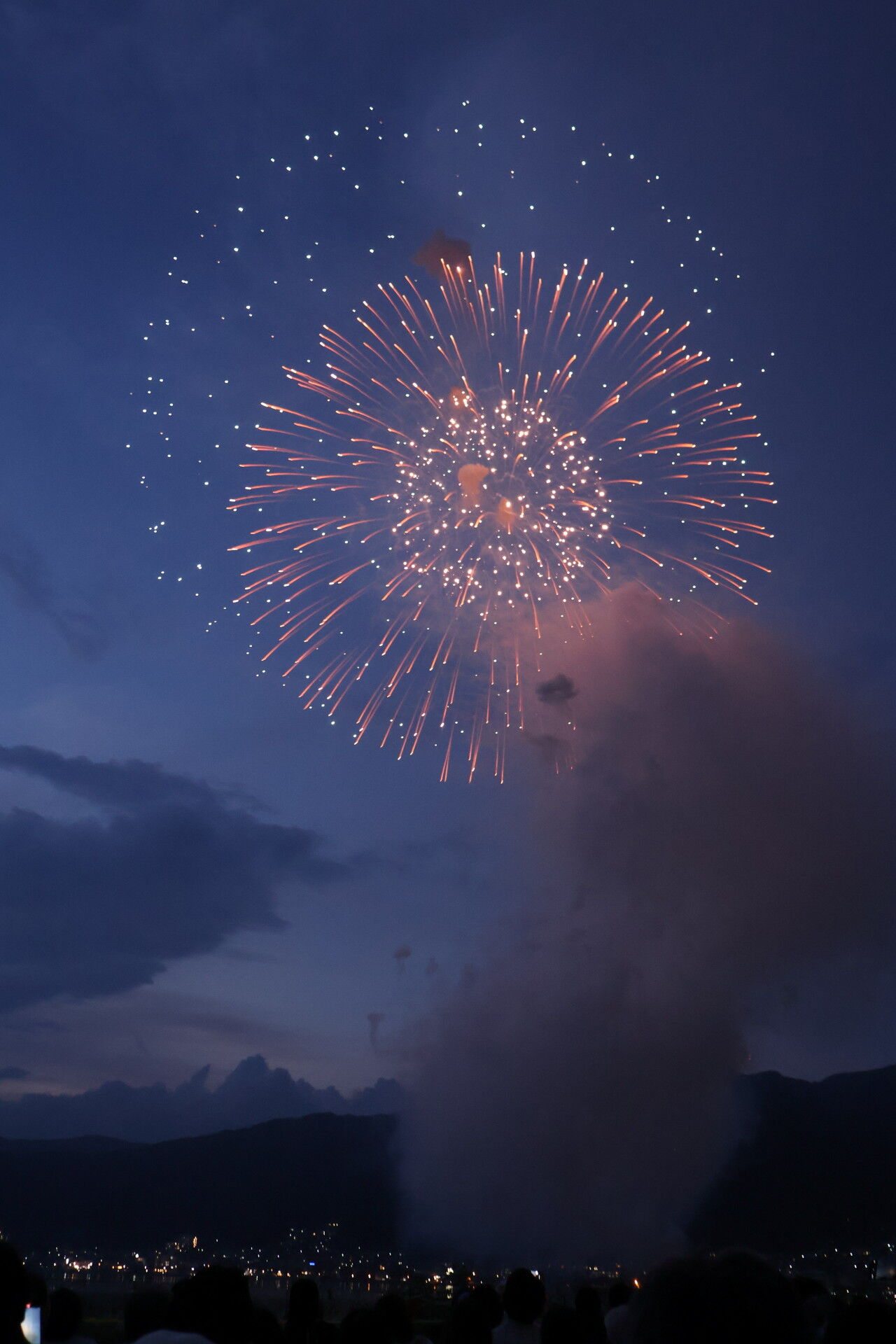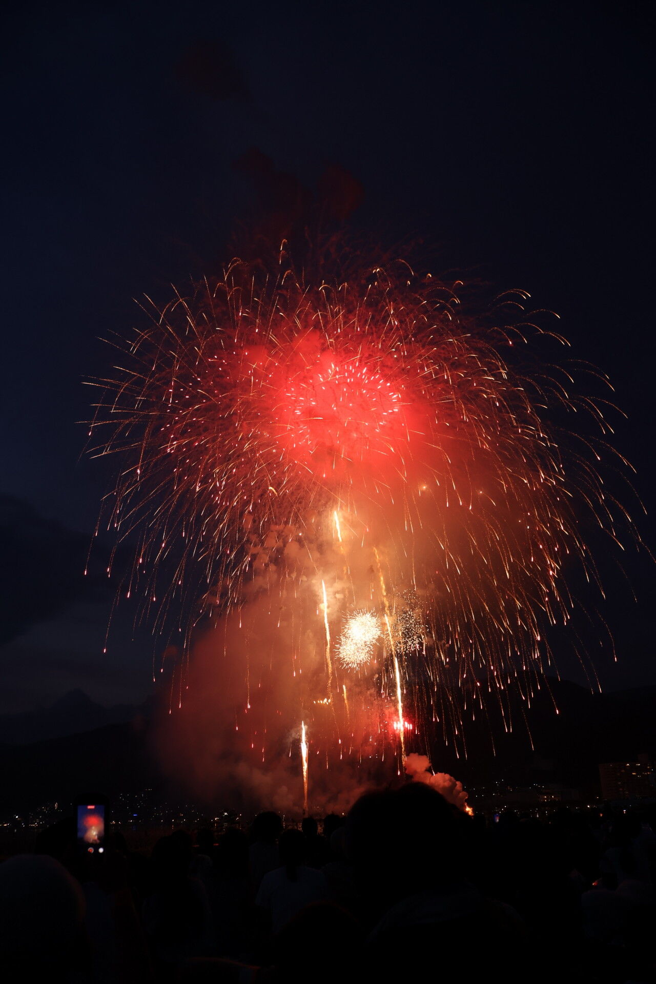 火の粉がチラチラとまあ様子をじっくり眺められるのは諏訪湖の花火ならではだと思います。