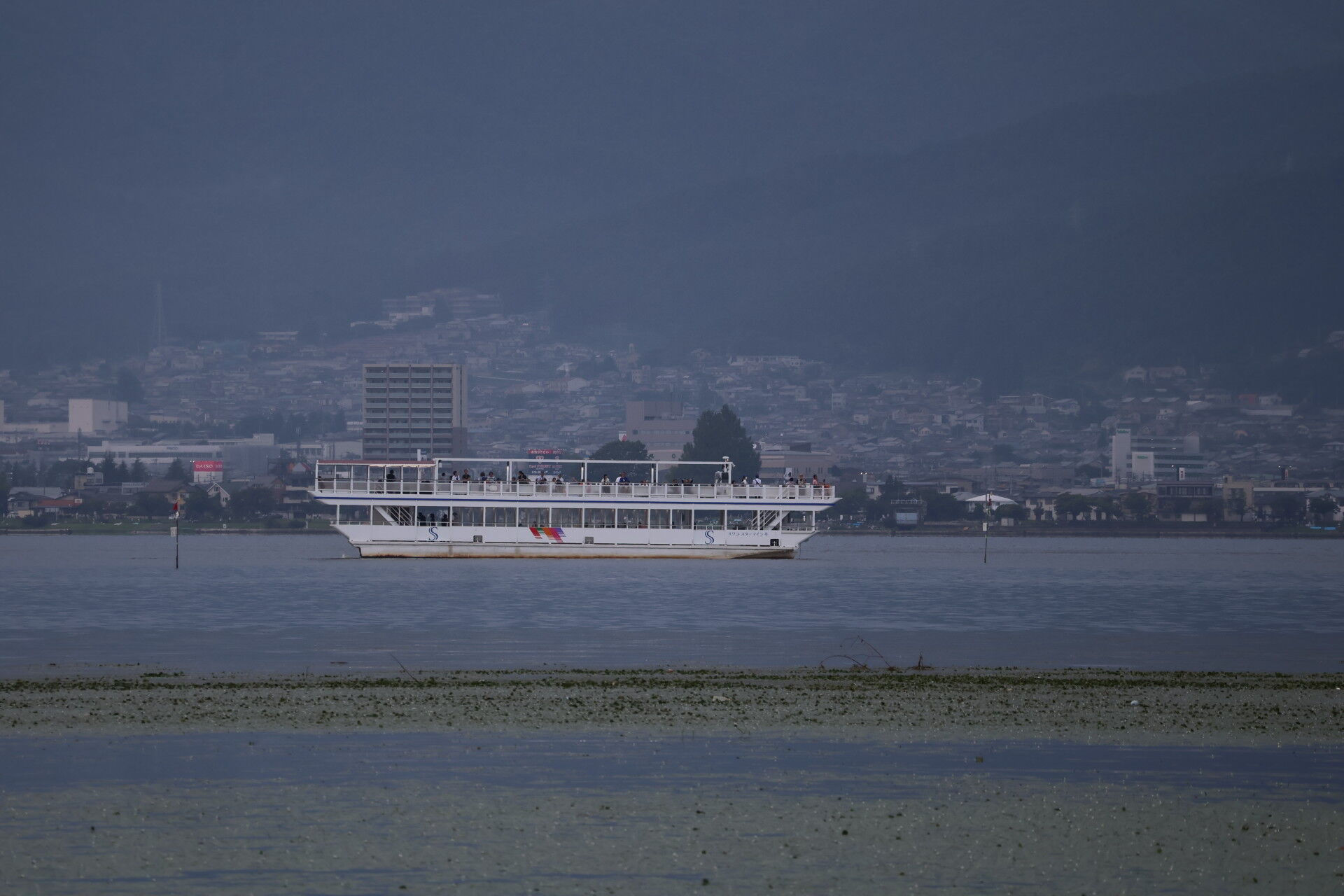 諏訪湖遊覧船スターマイン号が沖で待機しています。