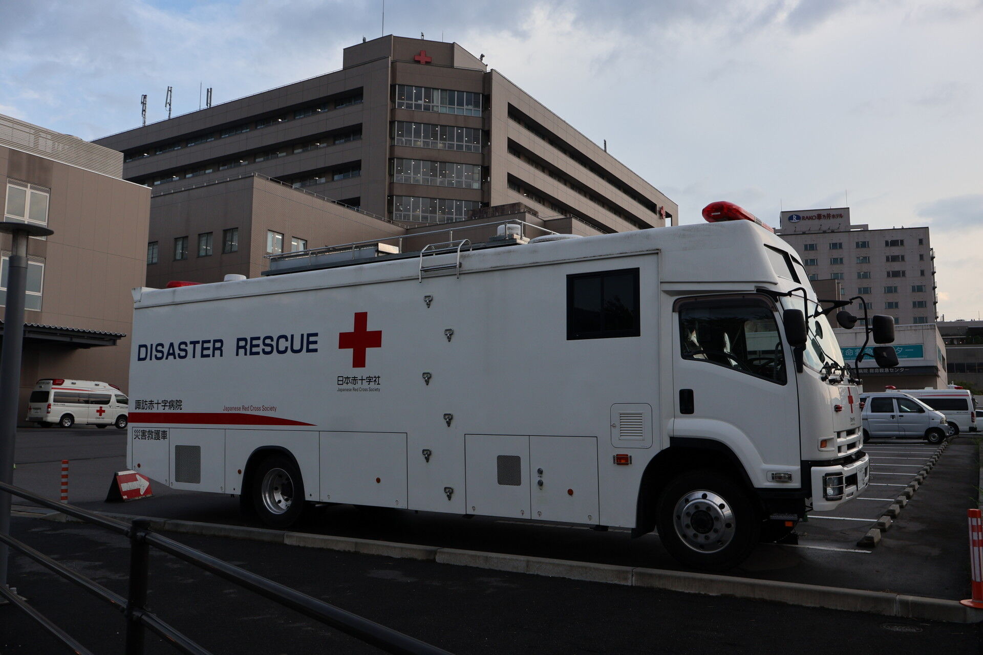 大きな病院に立派な救急車。臨戦態勢といったところ。