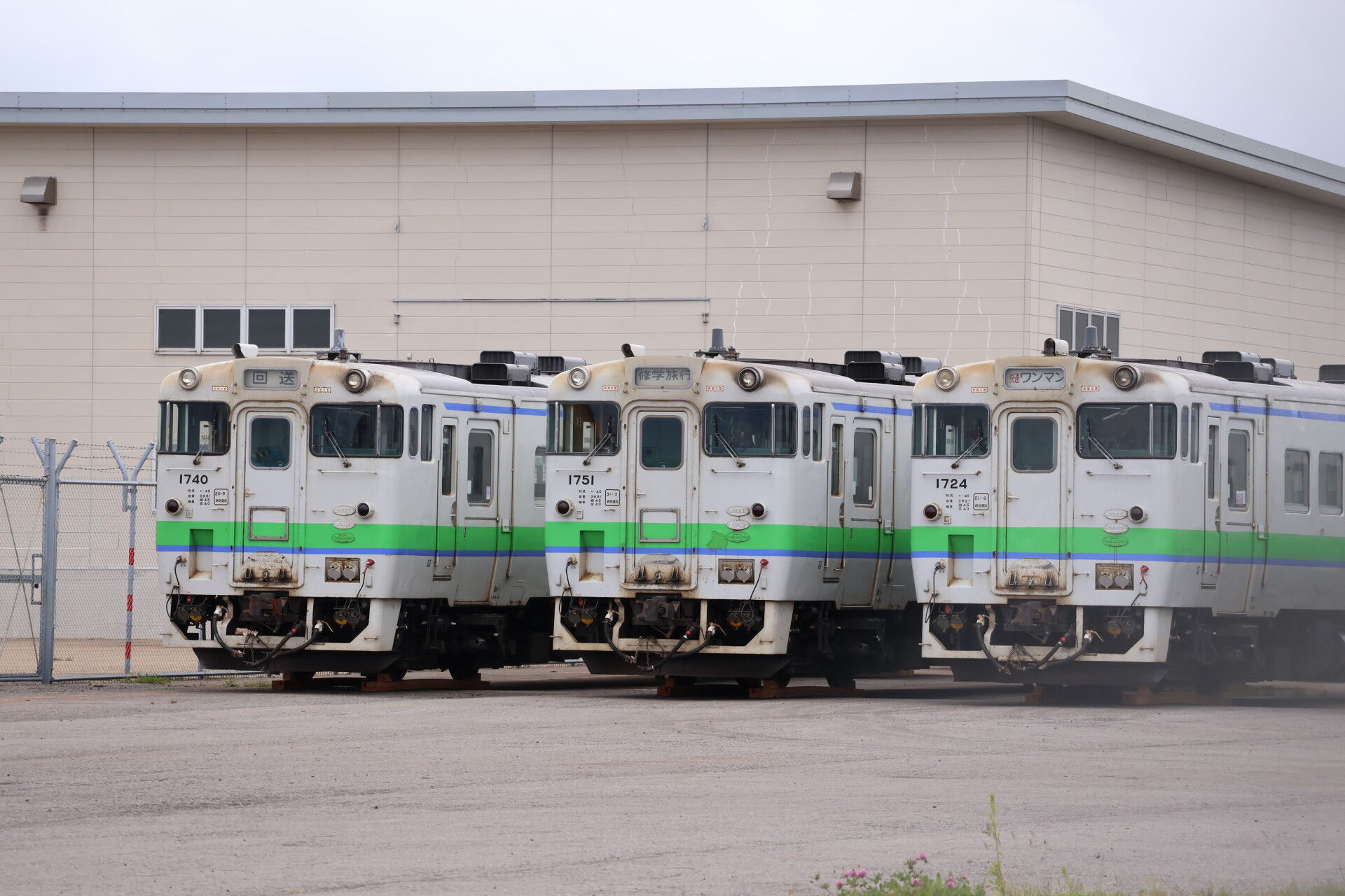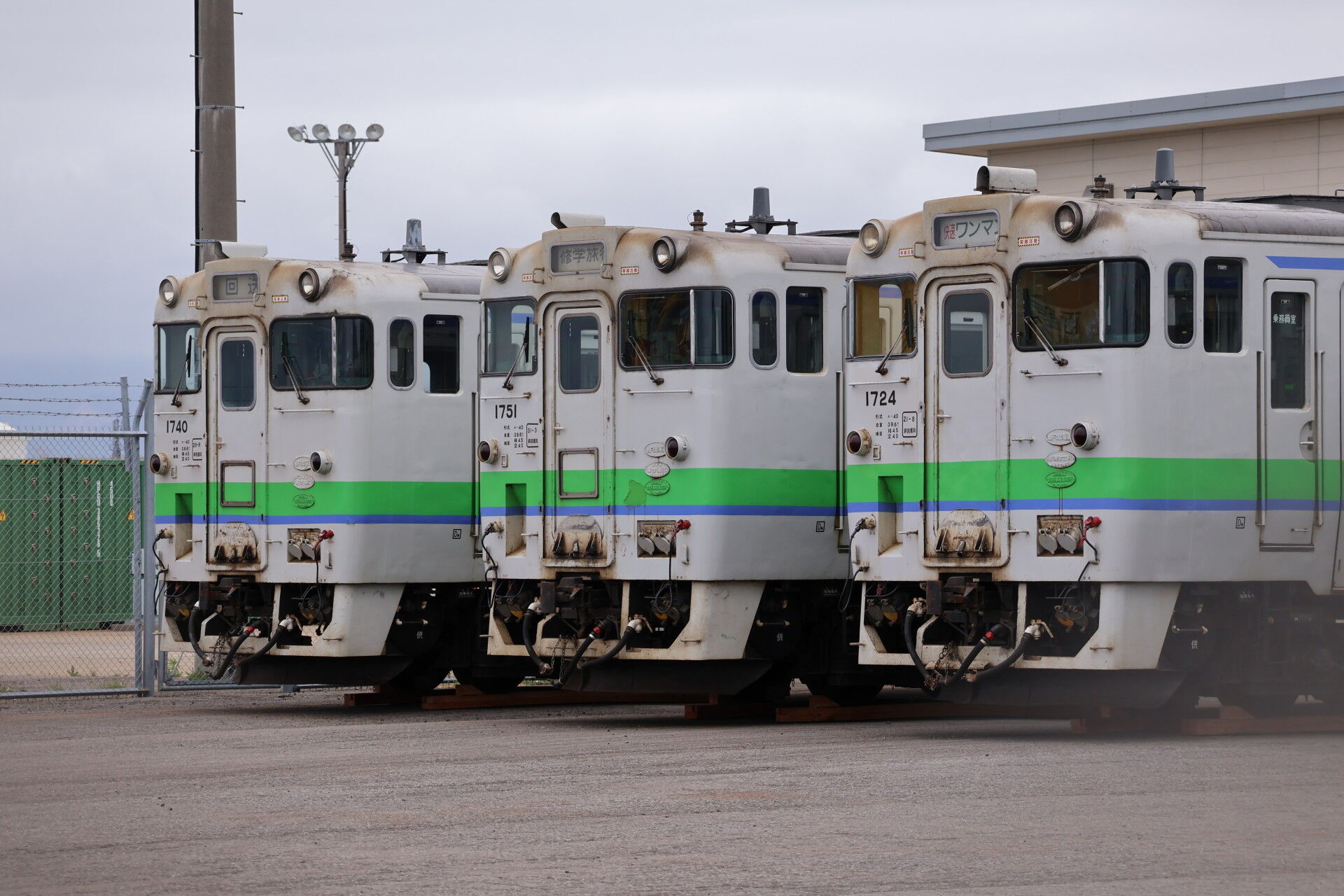 釧路のようなヘッドマークステーのついた車などさまざまな車が並んでいます。