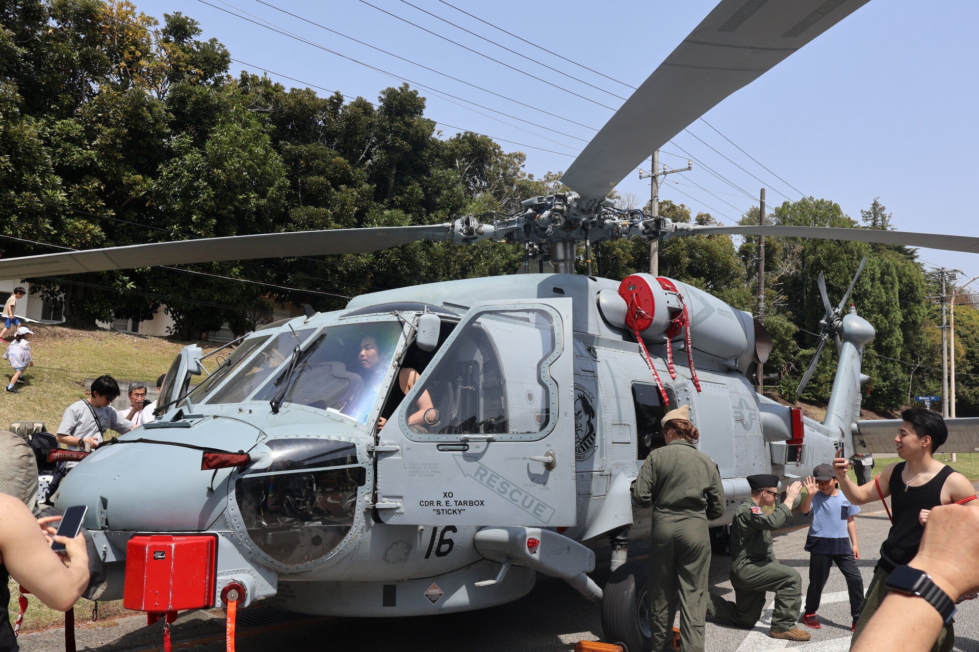 飛行機が発着艦する間、不測のトラブルに備えてこうしたヘリコプターが上空待機しています。