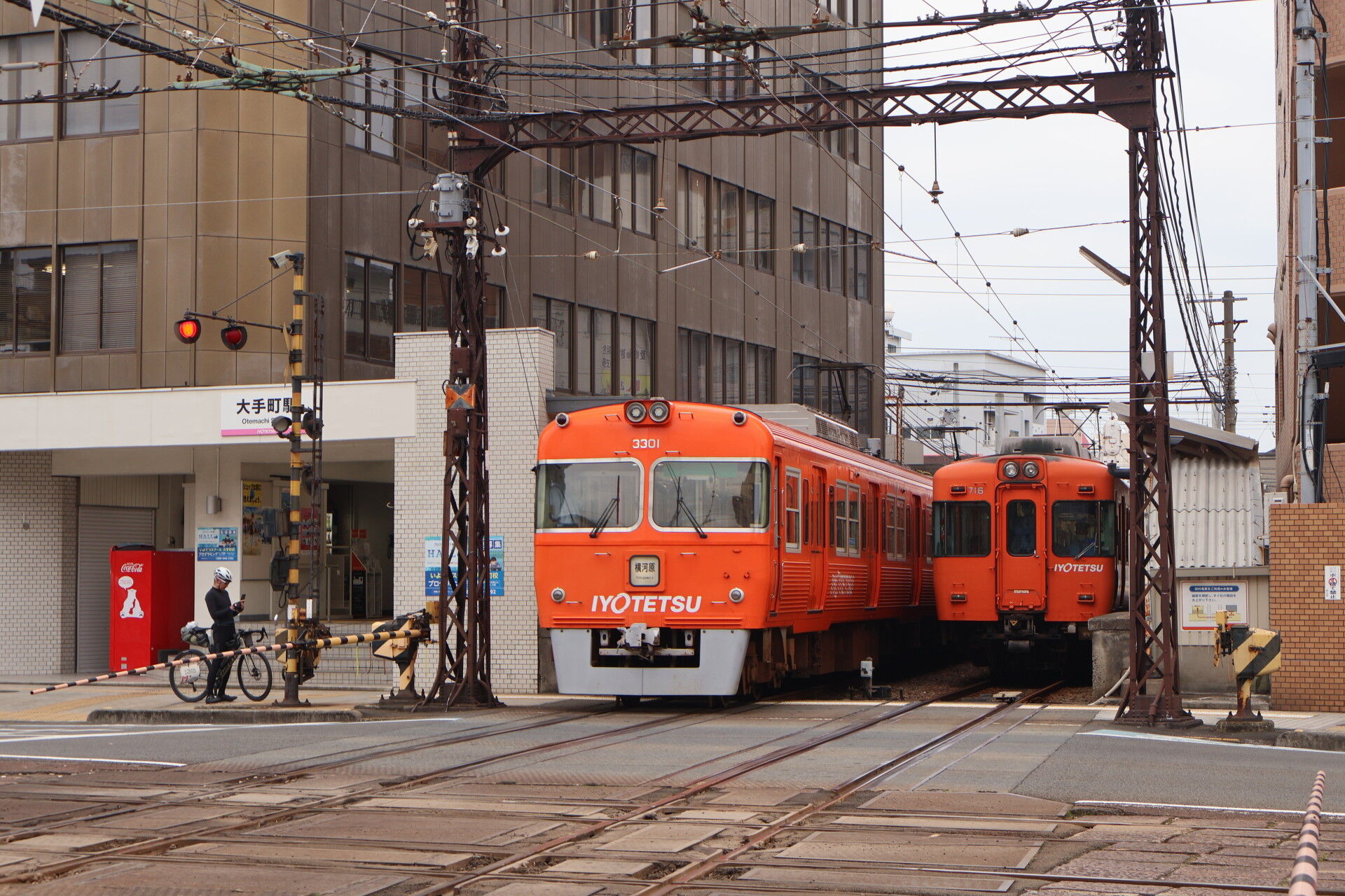 ここは郊外電車と路面電車が平面交差する日本唯一となった踏切です。