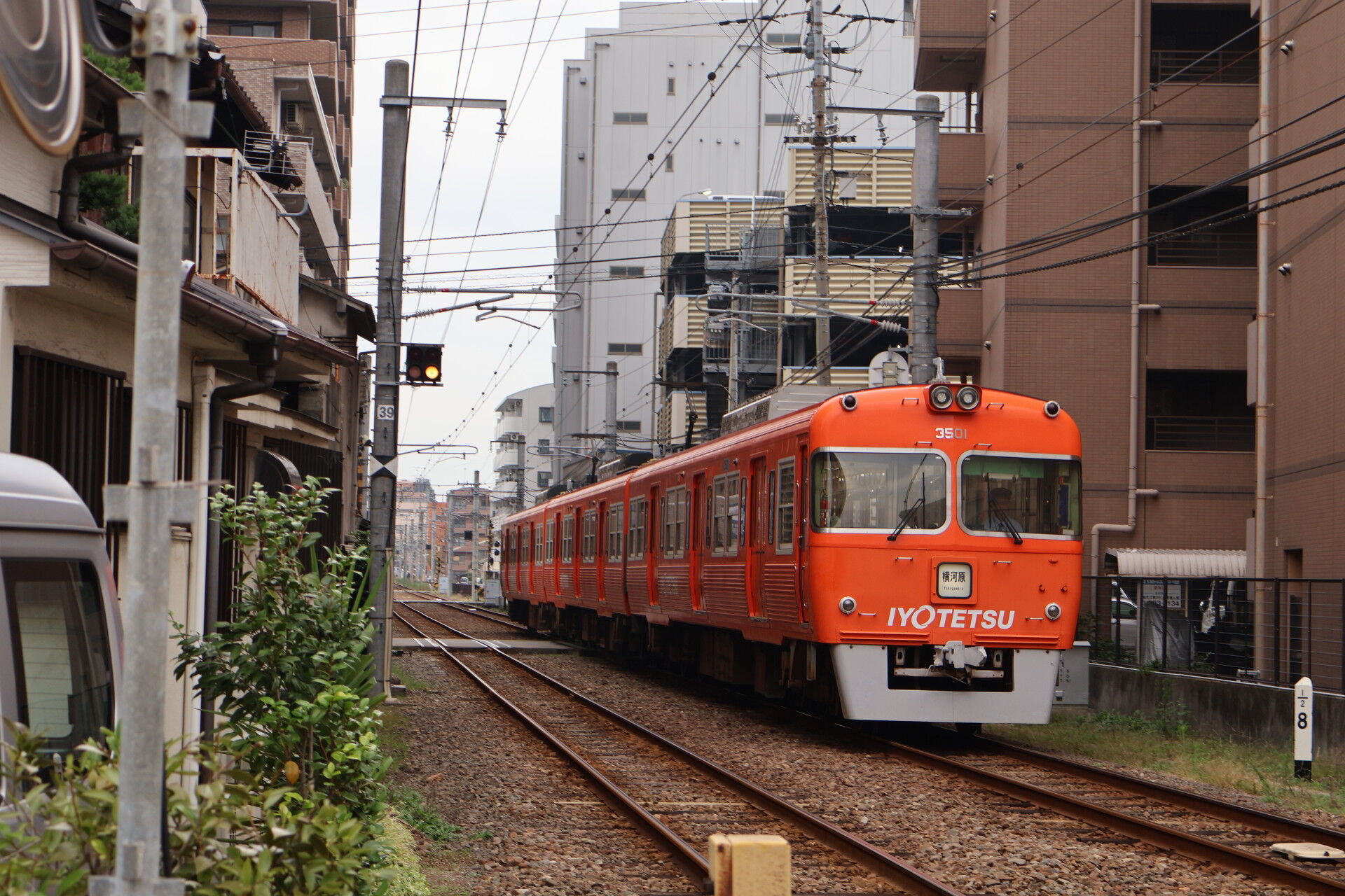 右の線路が市内線、