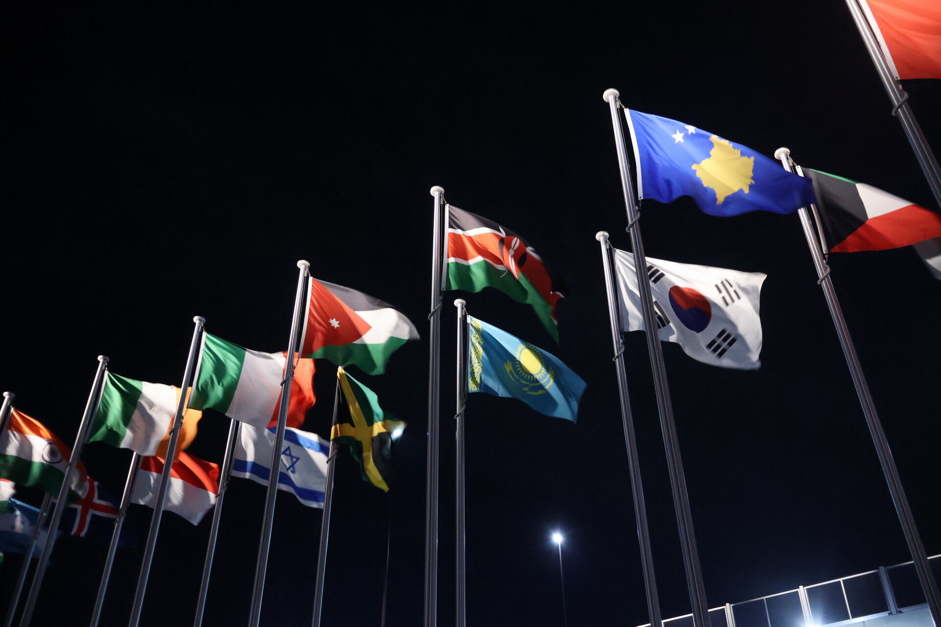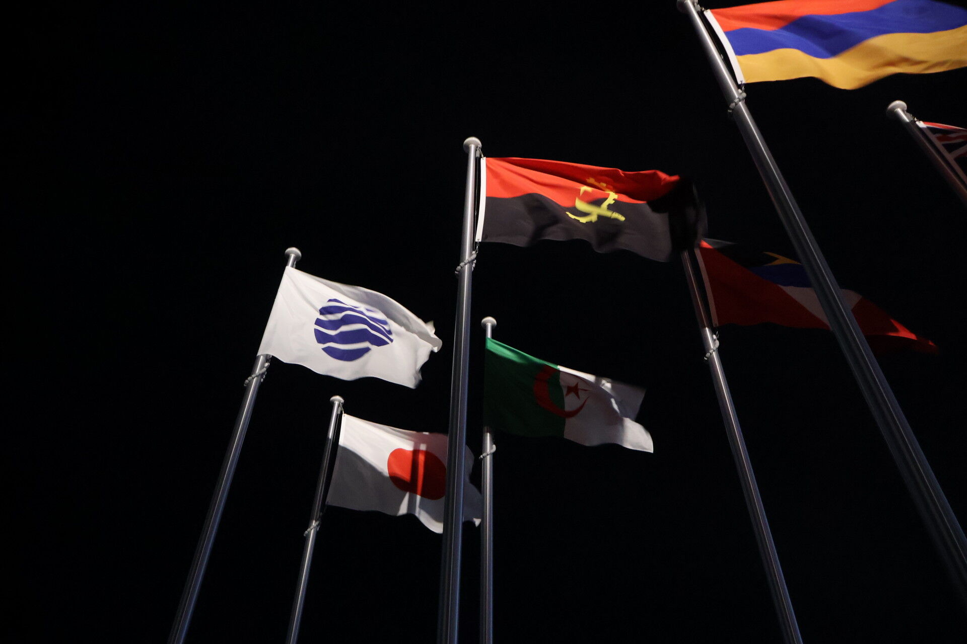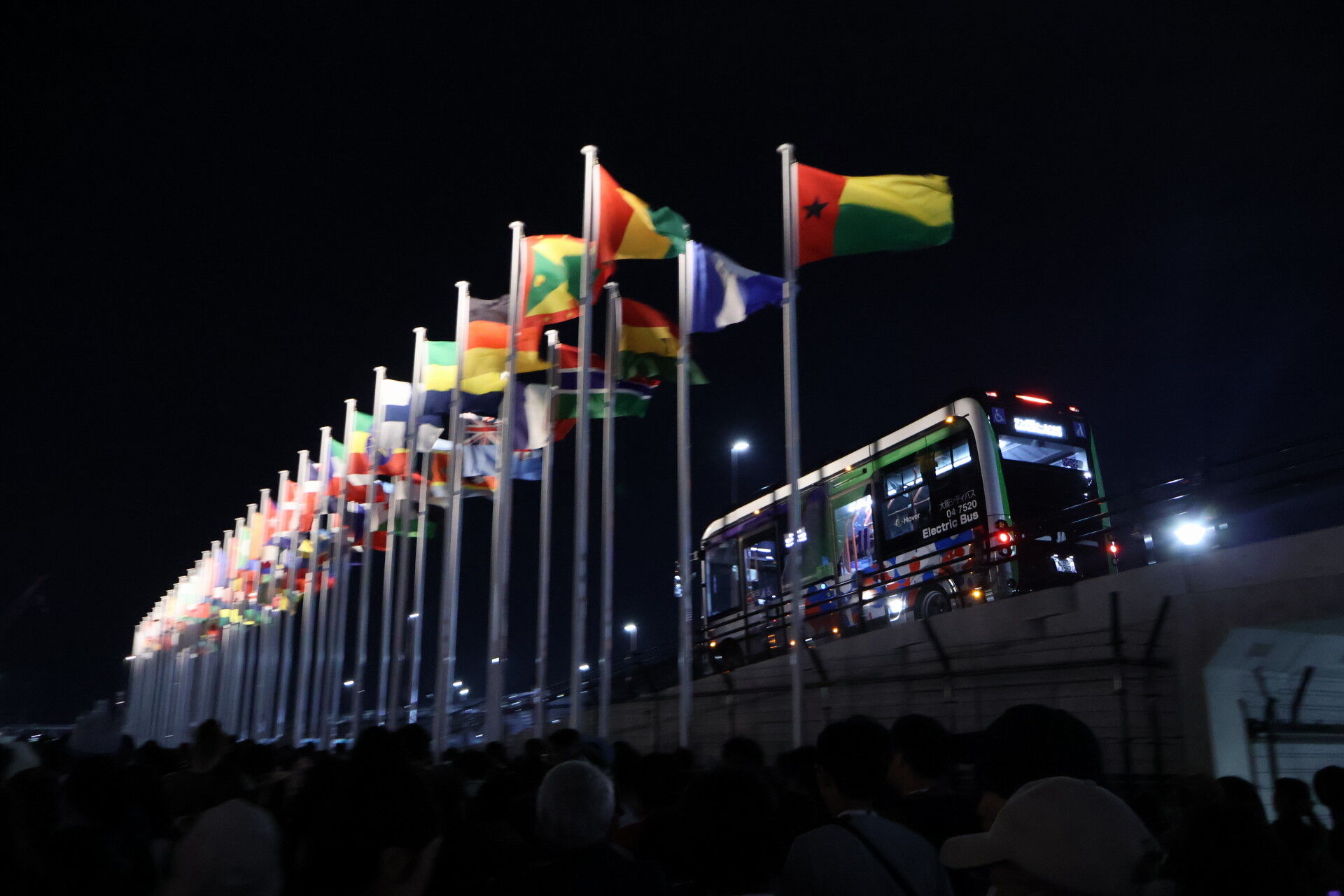 左のパンナムみたいなやつは、博覧会国際事務局BIEの旗です。
