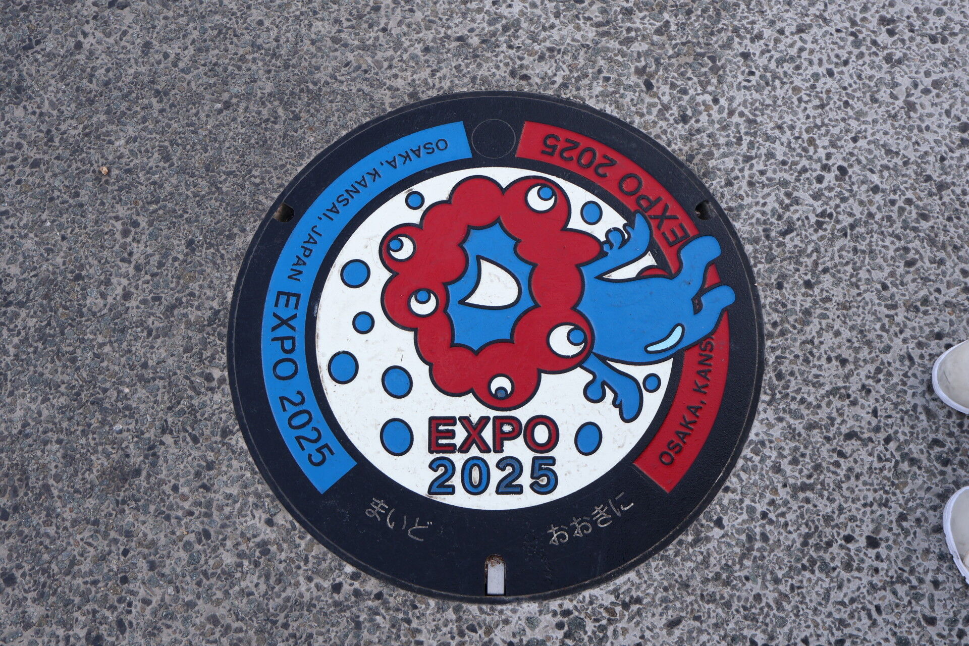 このマンホール蓋。「おおさかし げすいどう」「ばんぱく うすい」とか書いてあるところに
