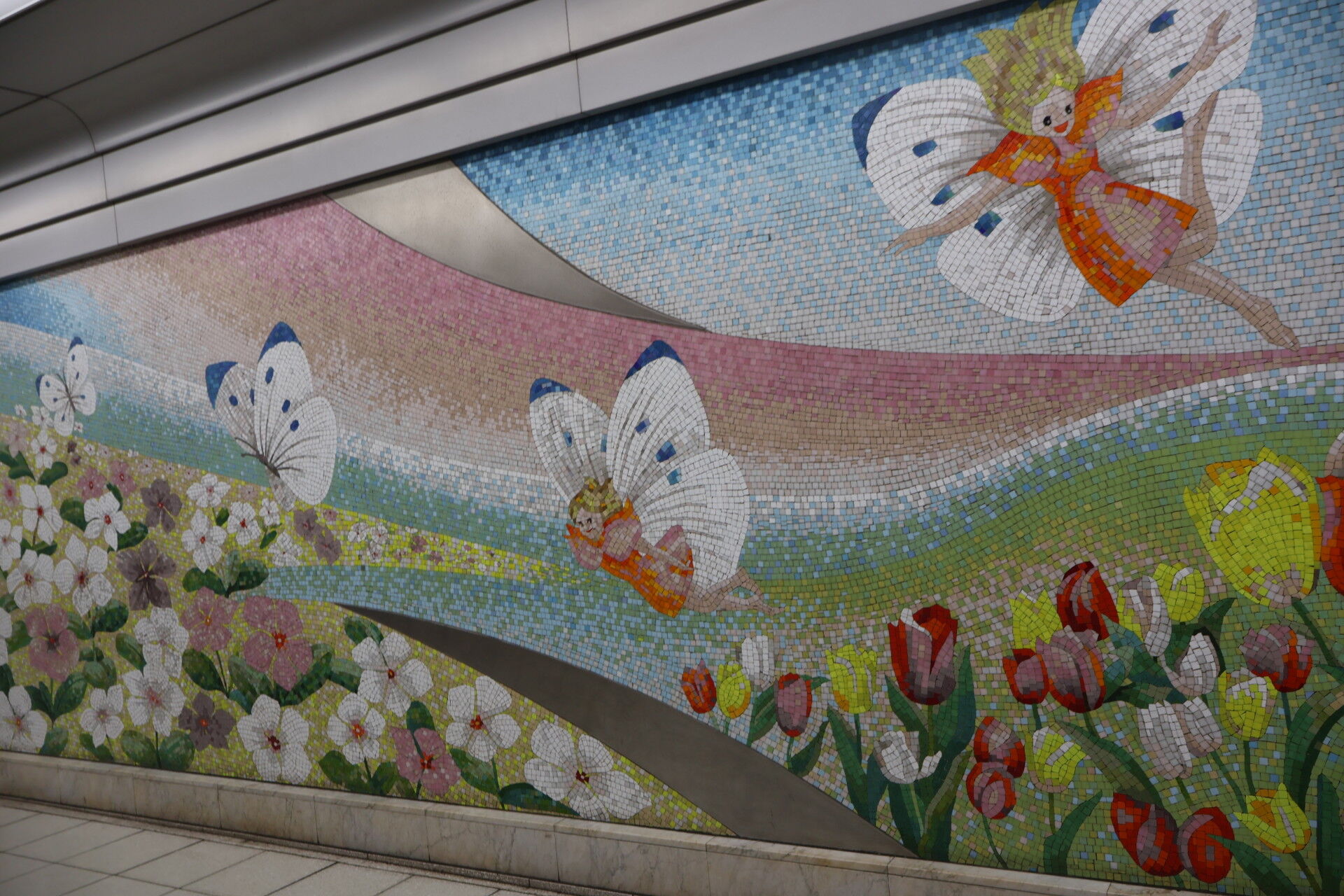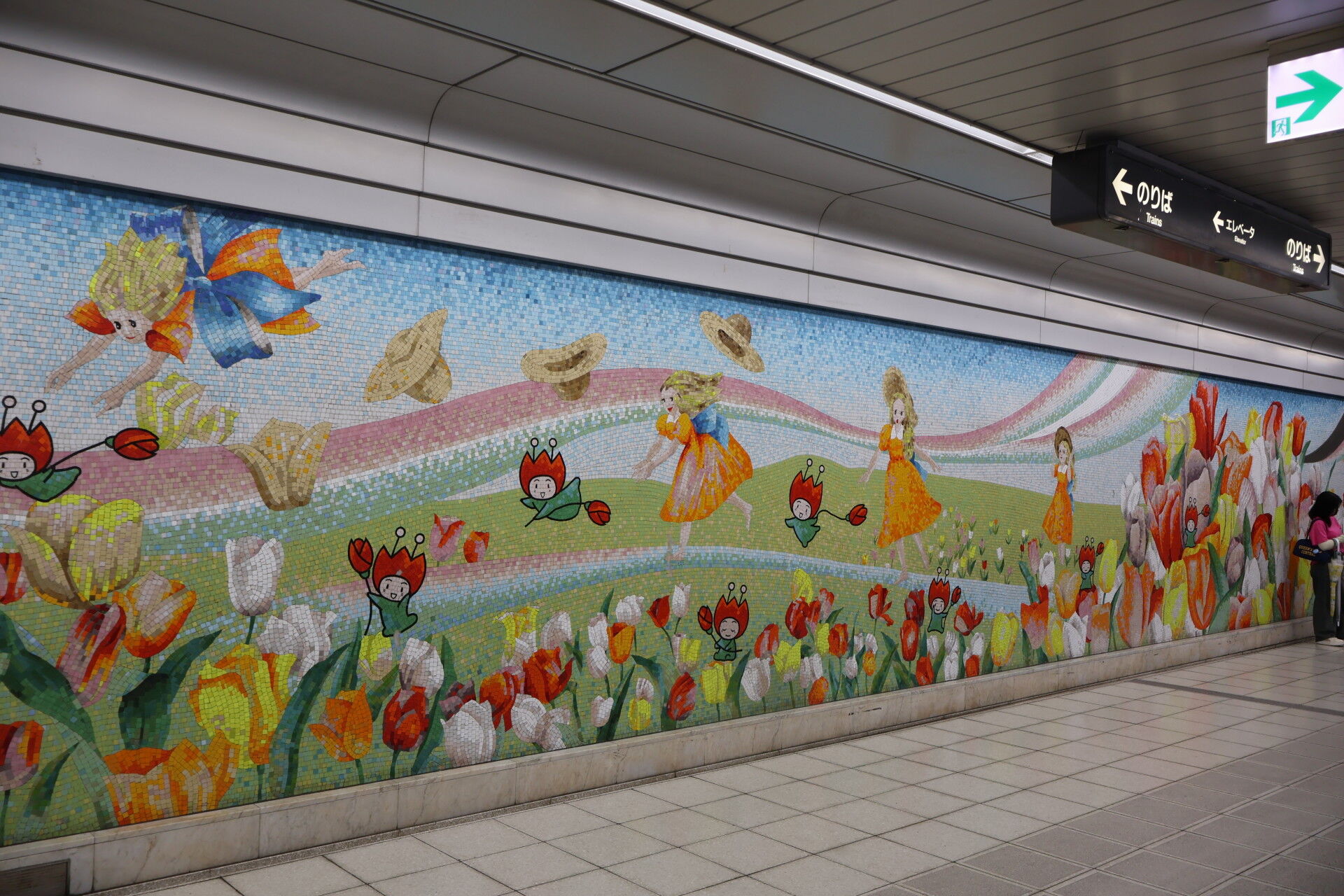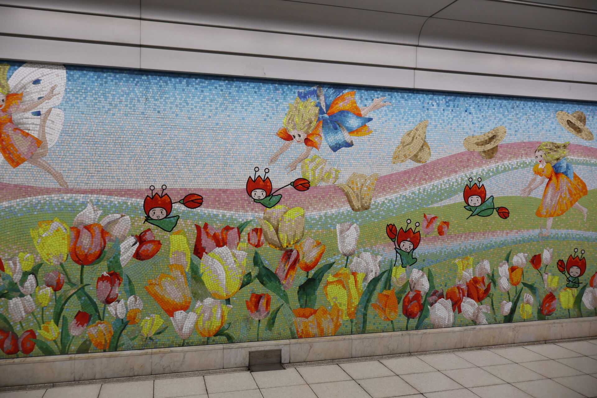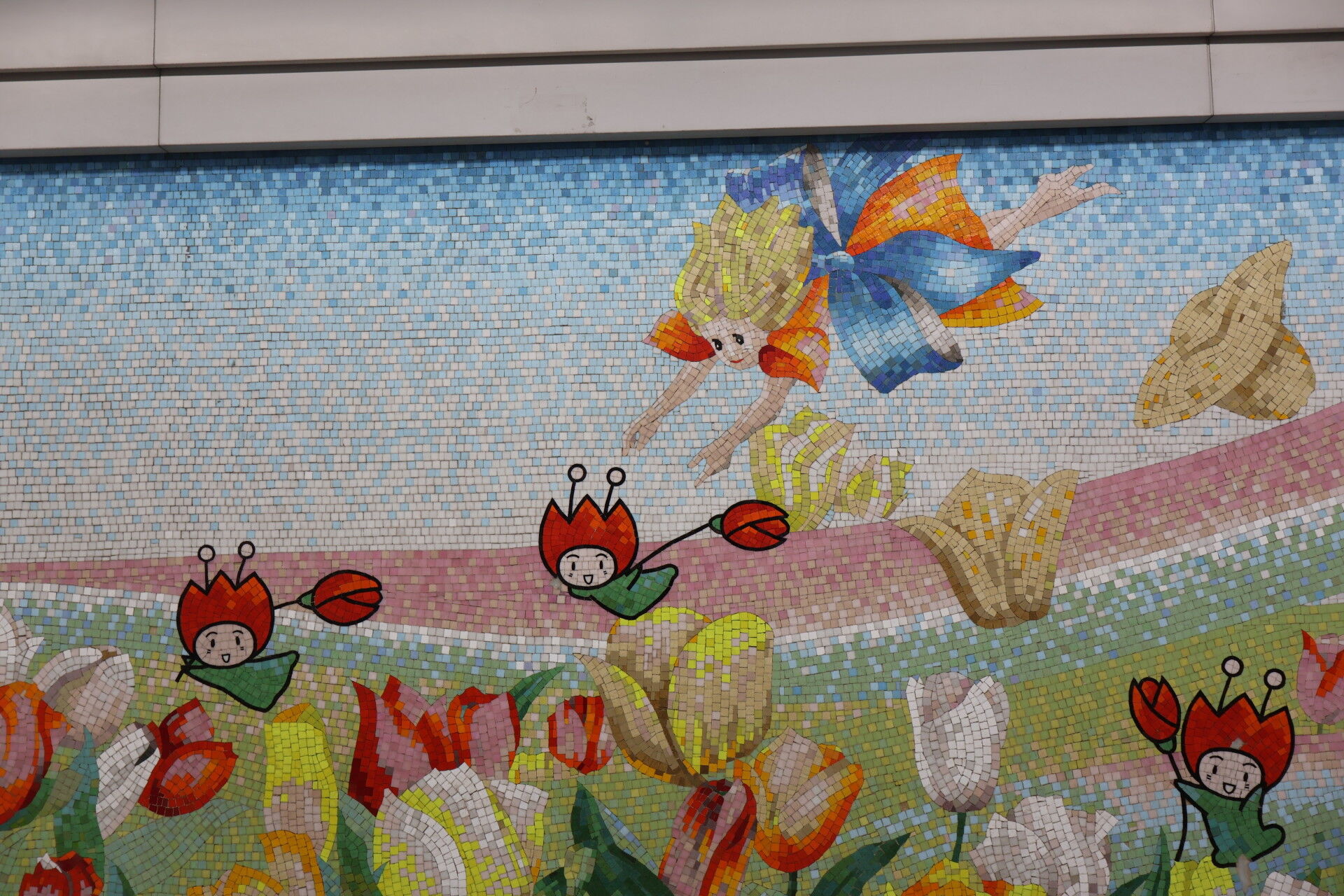 「花ずきんちゃん」のタイル壁画。