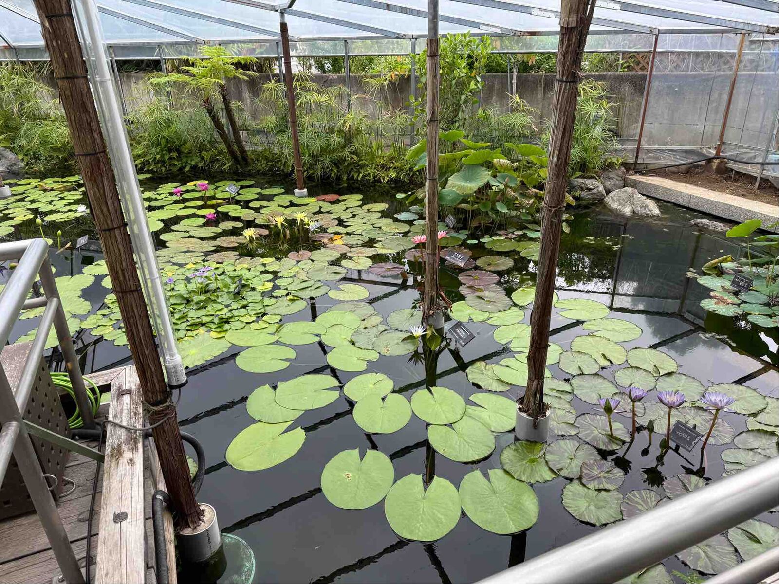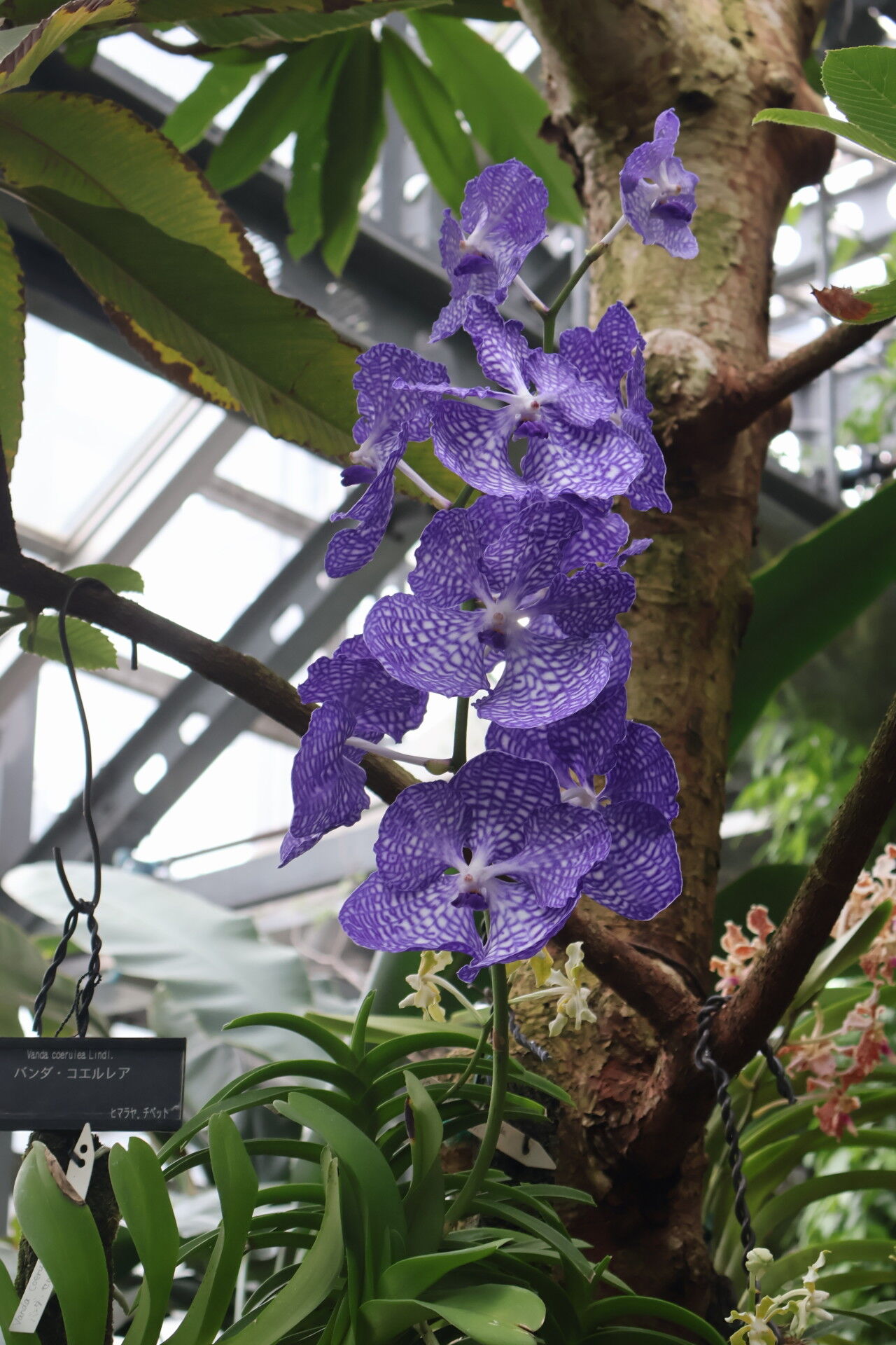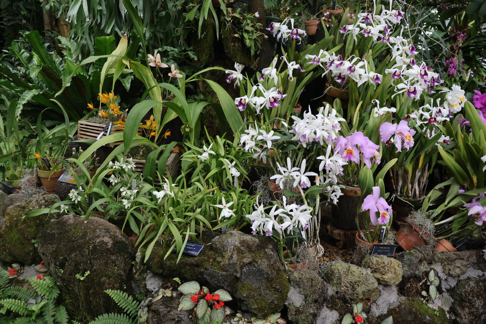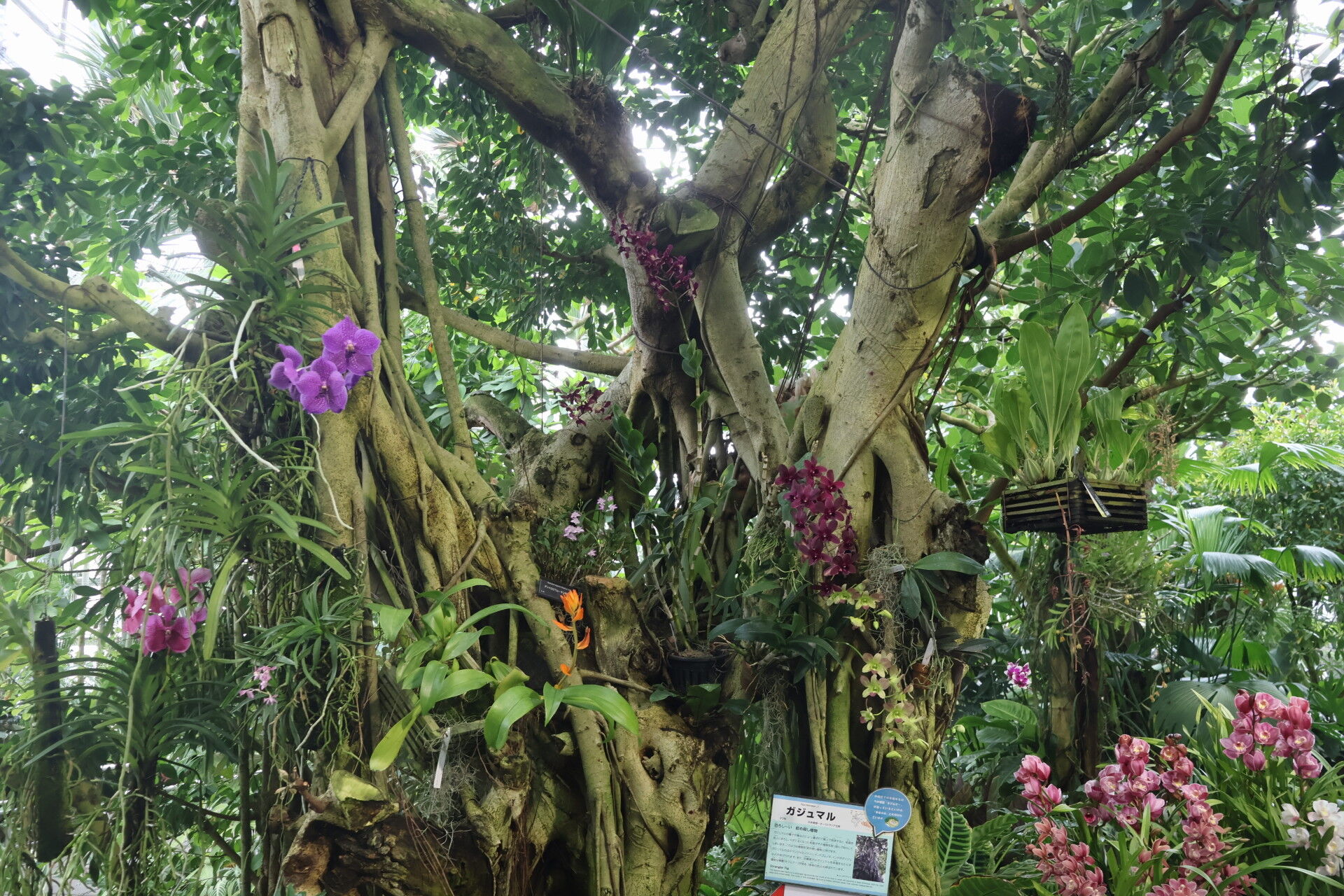 蒸し暑い温室の中でさまざまな花が。