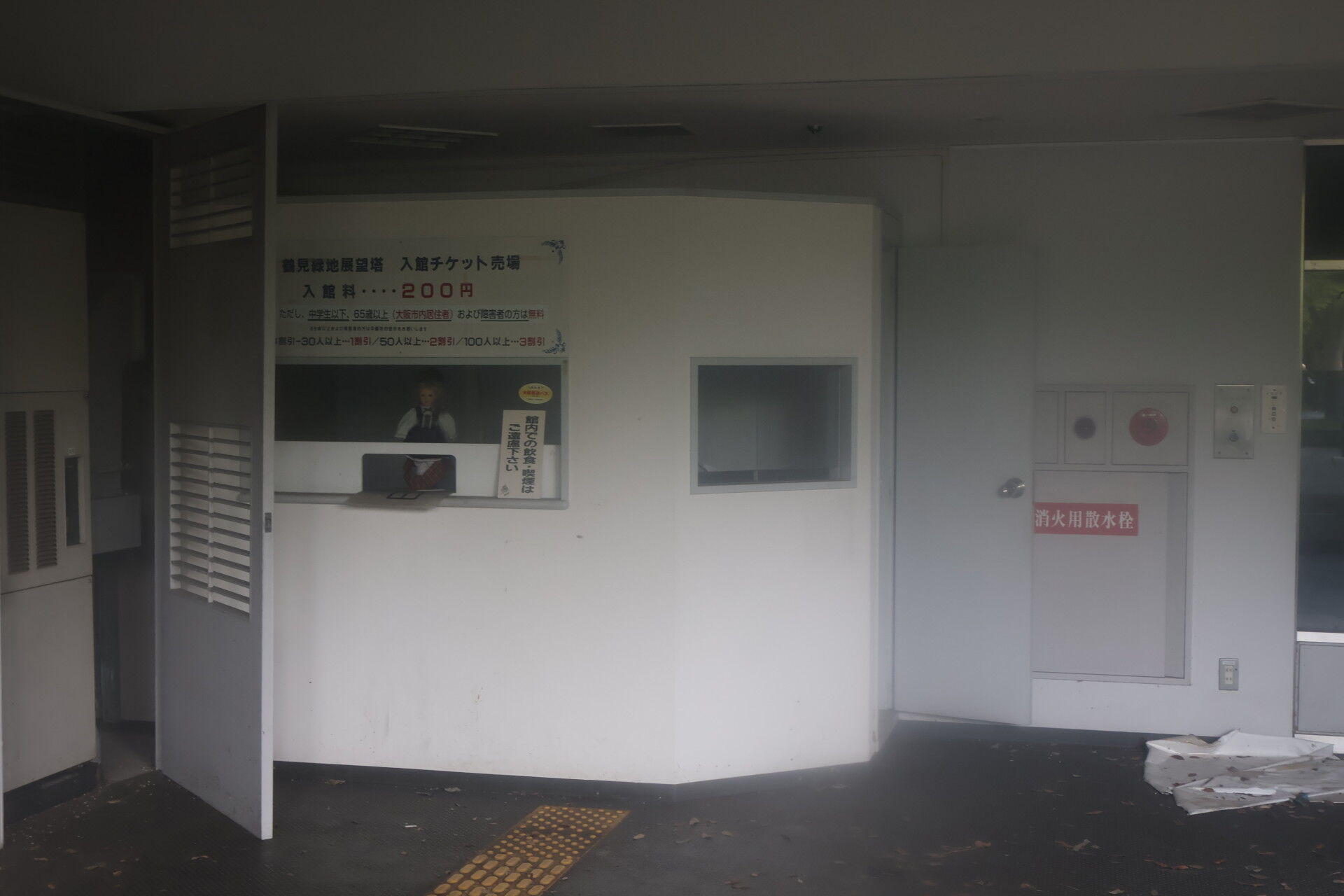 中を覗き込むとチケット売り場が見えます。なぜか人形が置いてありました。