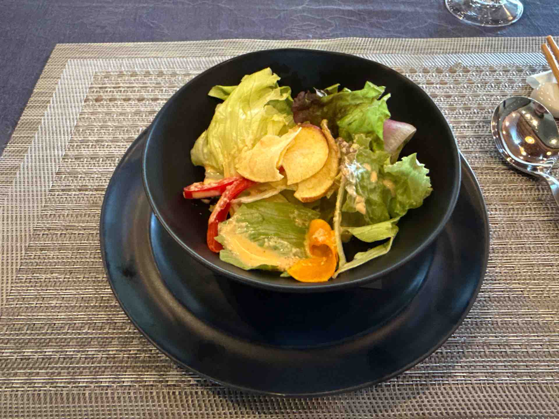 サラダもカラフル。乾燥りんごがスライスされてて食感が面白い。