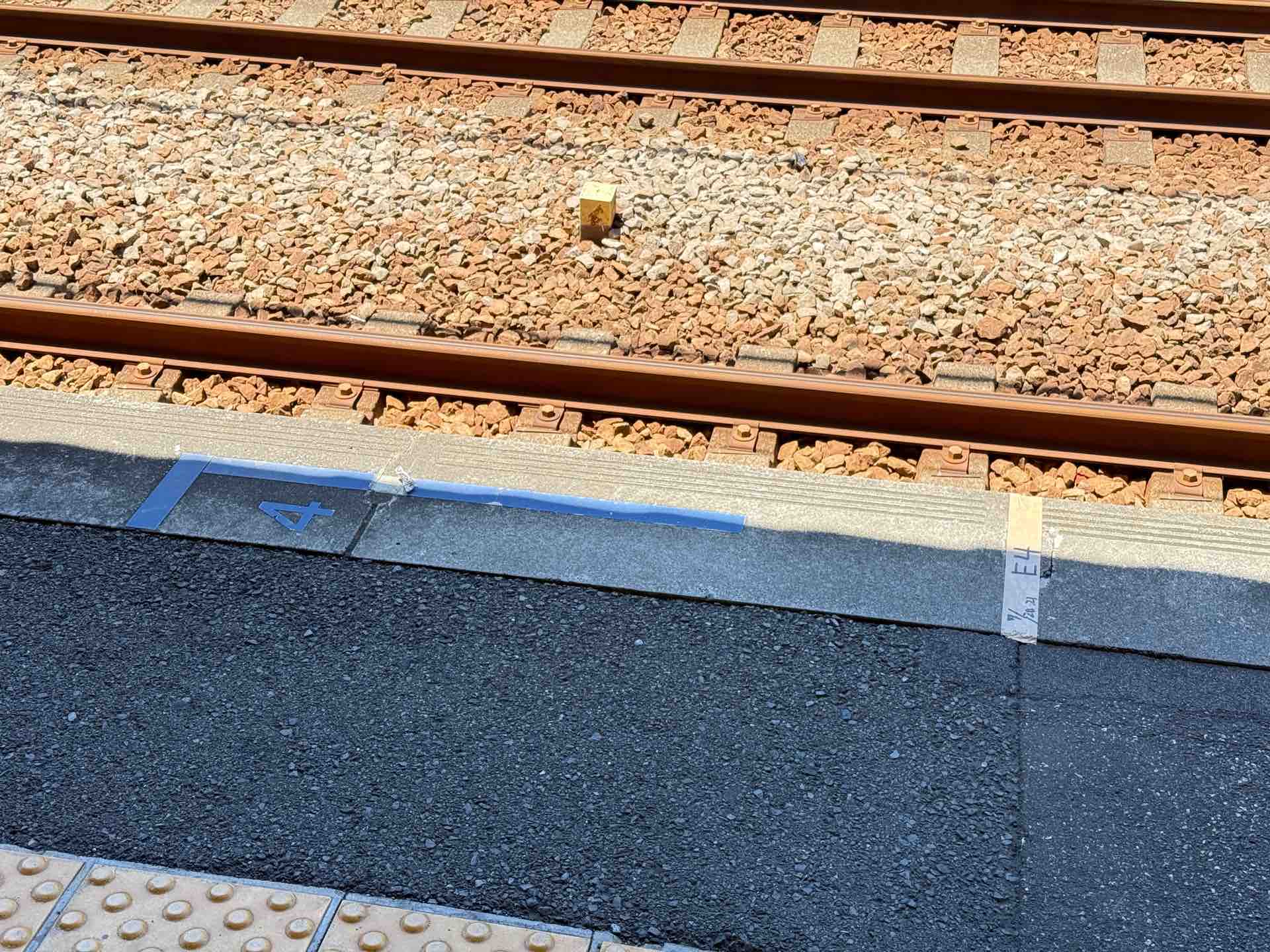 車掌さんの目印になる目標は、「4」が設置されたうえで、EXE用のものがガムテープで仮設されていました。そこを撮ればよかったな…と思います。くやしい。