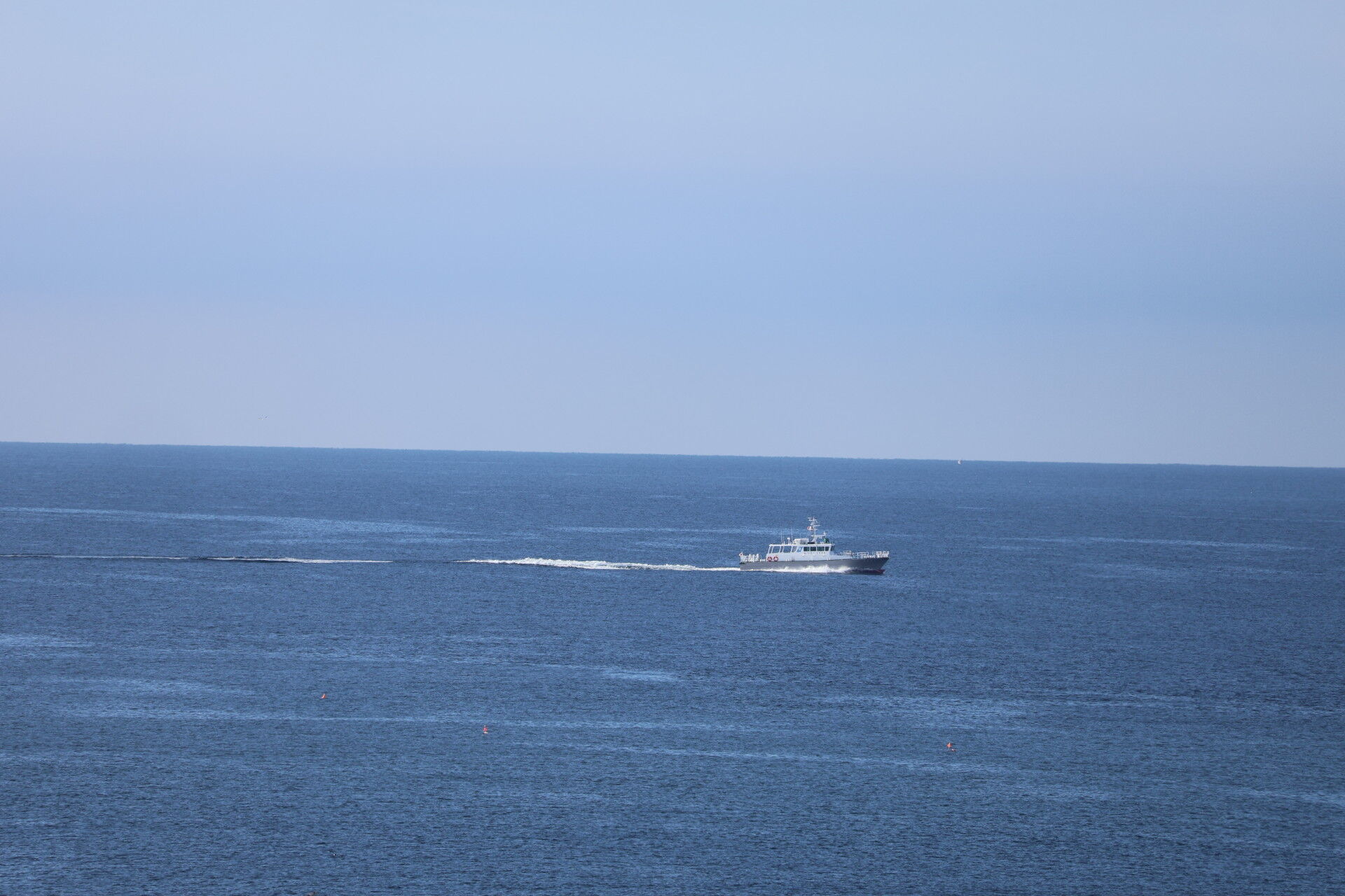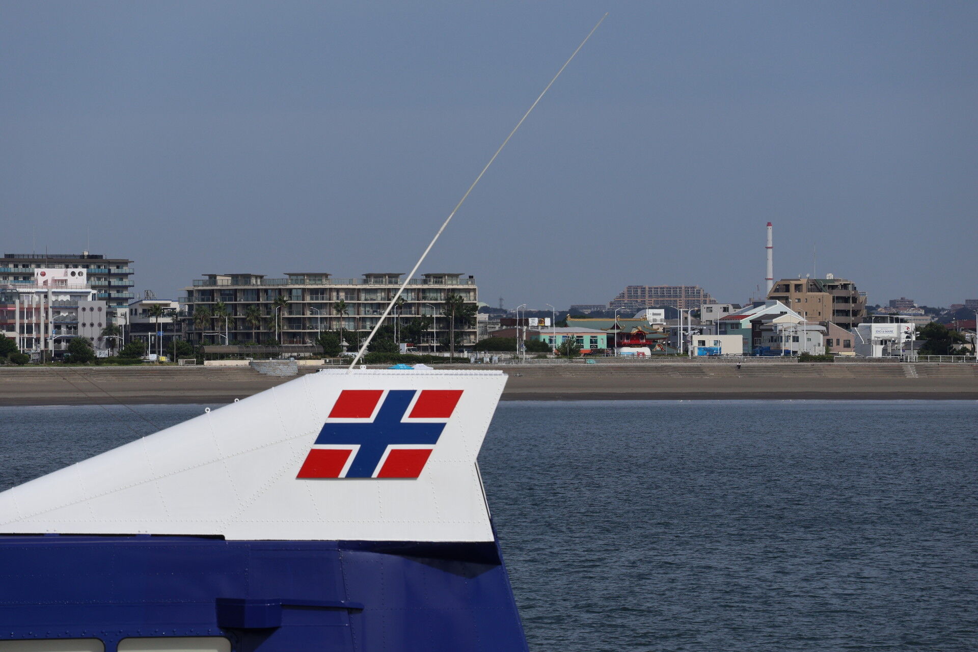 神奈川県のマークがついた謎の船が沖を通過。