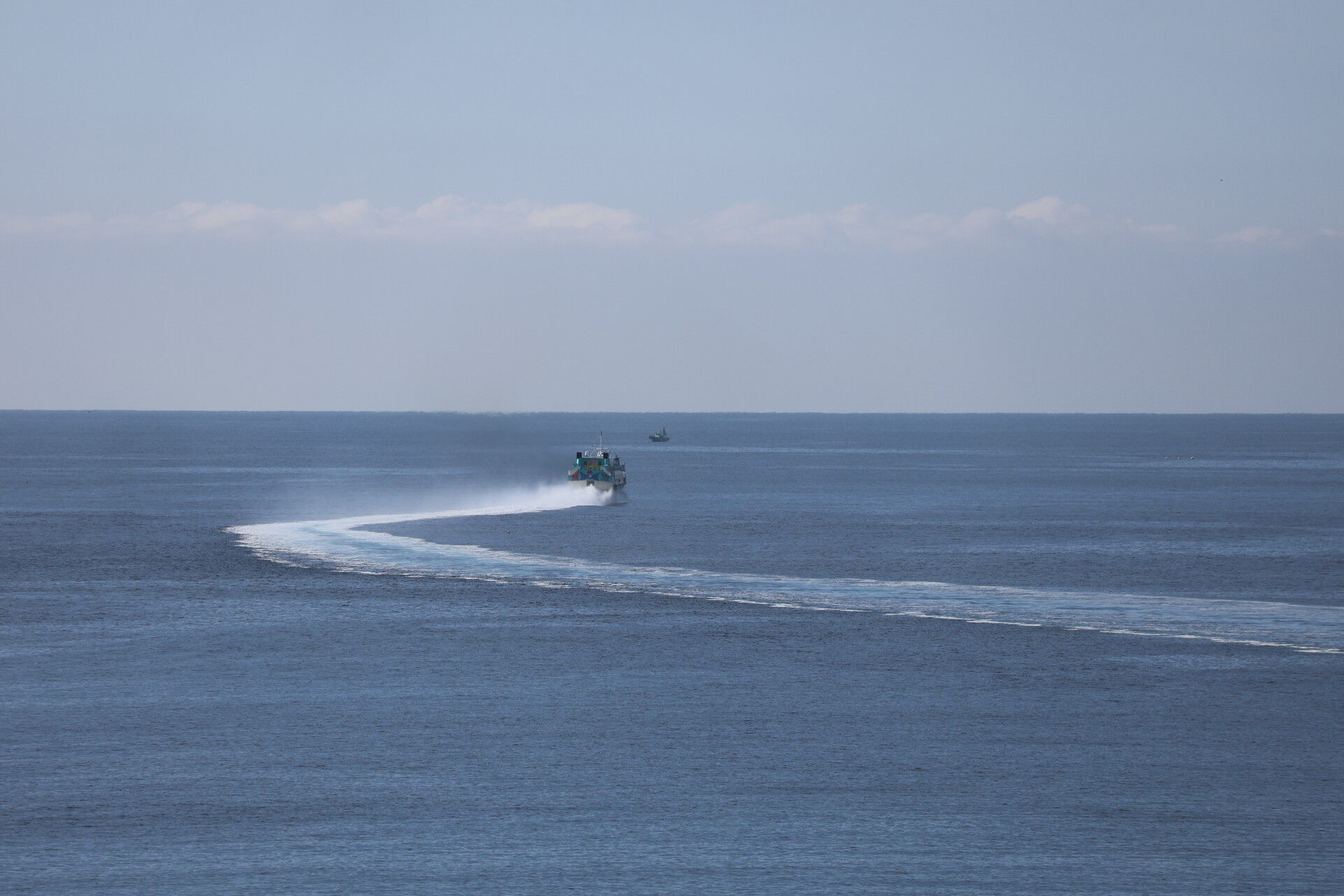 ご覧の通り漁船が操業中、岸壁近くにも漁網のブイもたくさん浮かんでいる中を避けているので、だいぶ沖からきています。