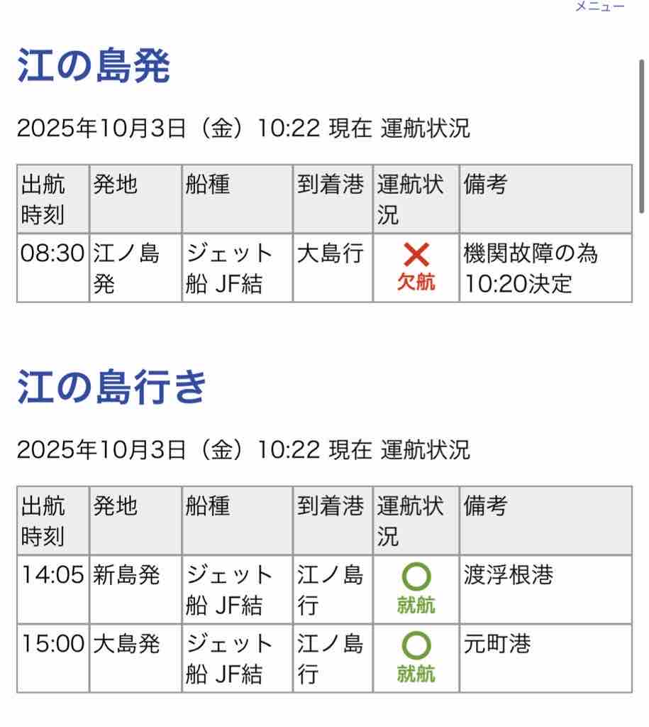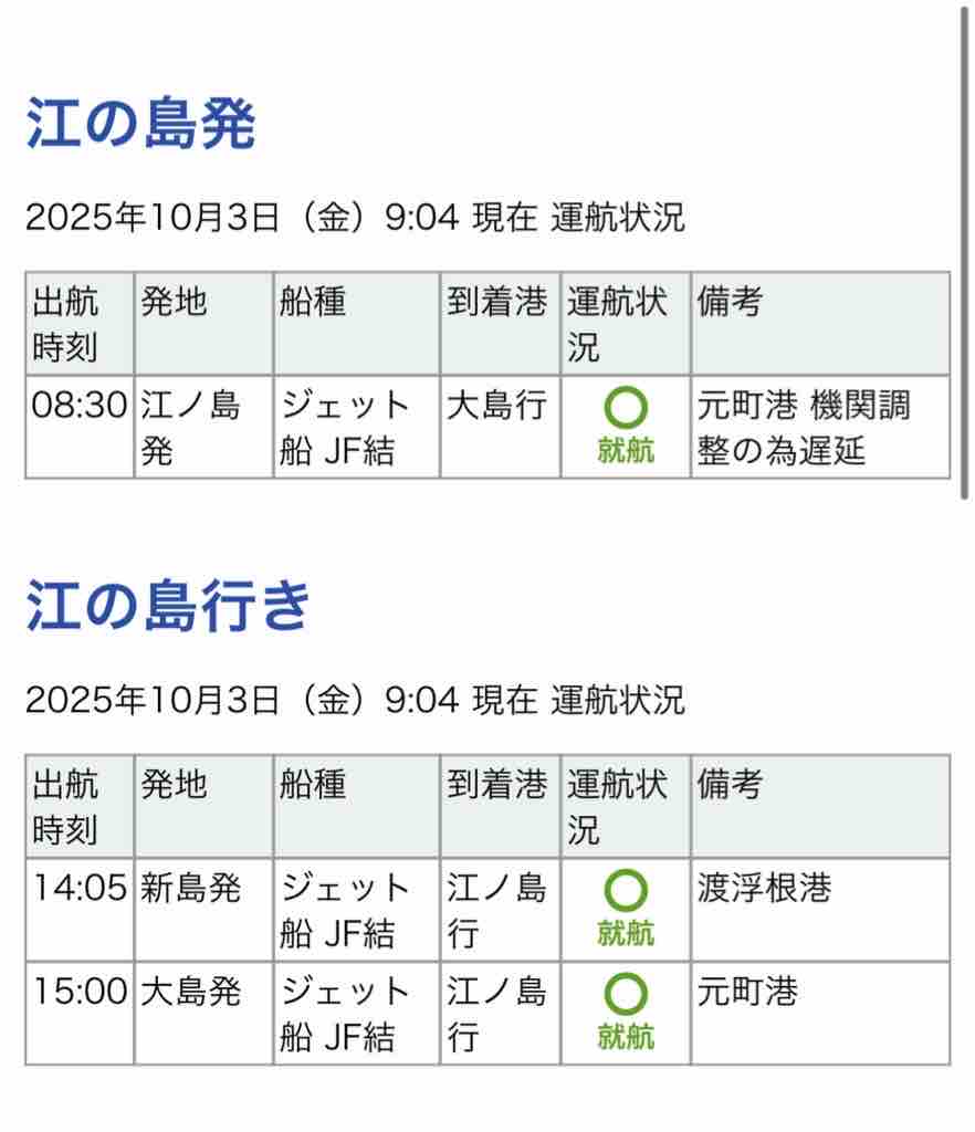 新島発の便は「機関調整のため遅延」とのこと。