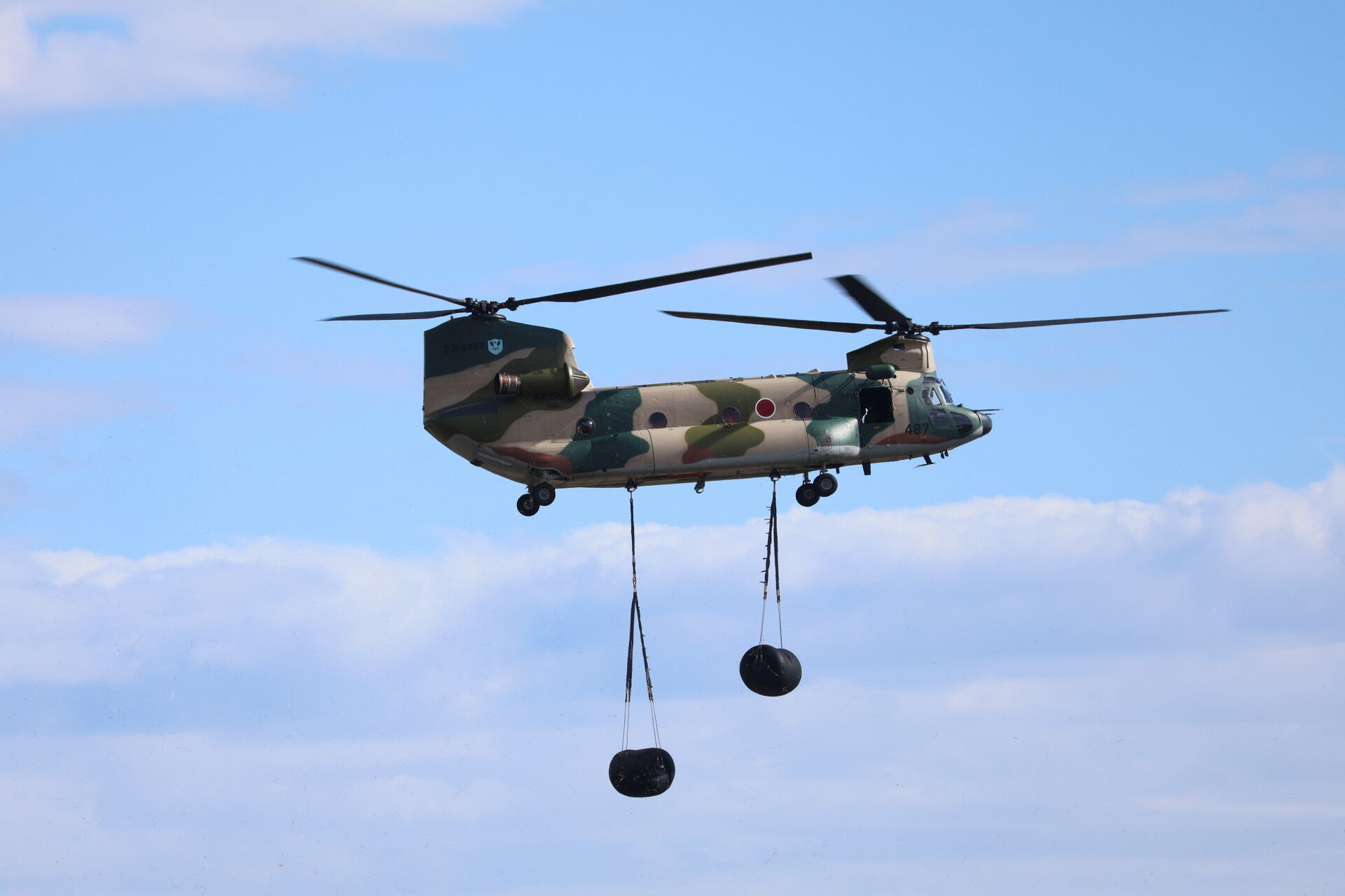 貨物を吊り下げて飛んでいますが、機体が微動だにしません。操縦技術の高さを示しています。