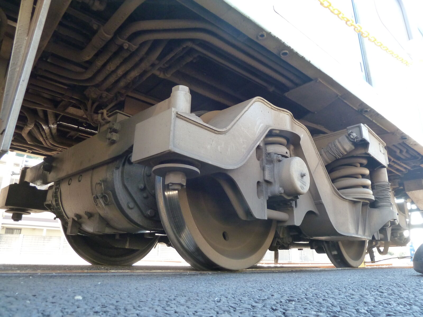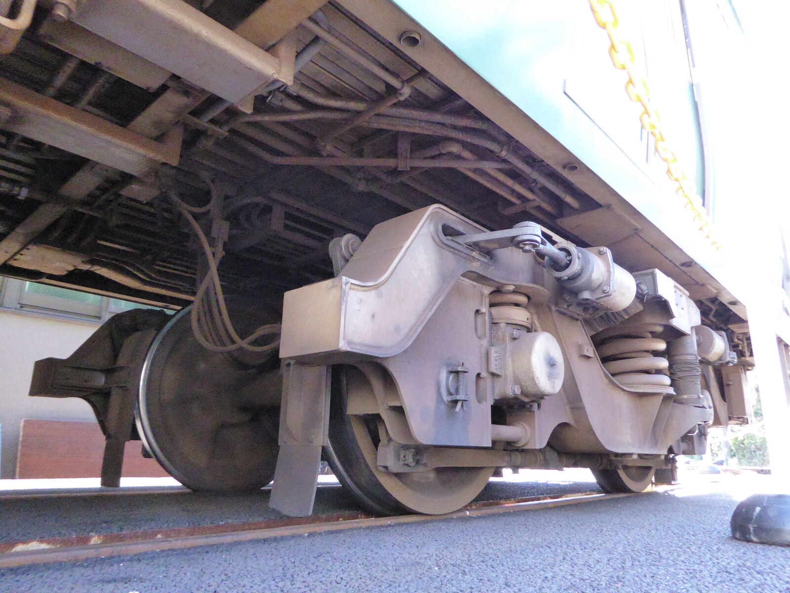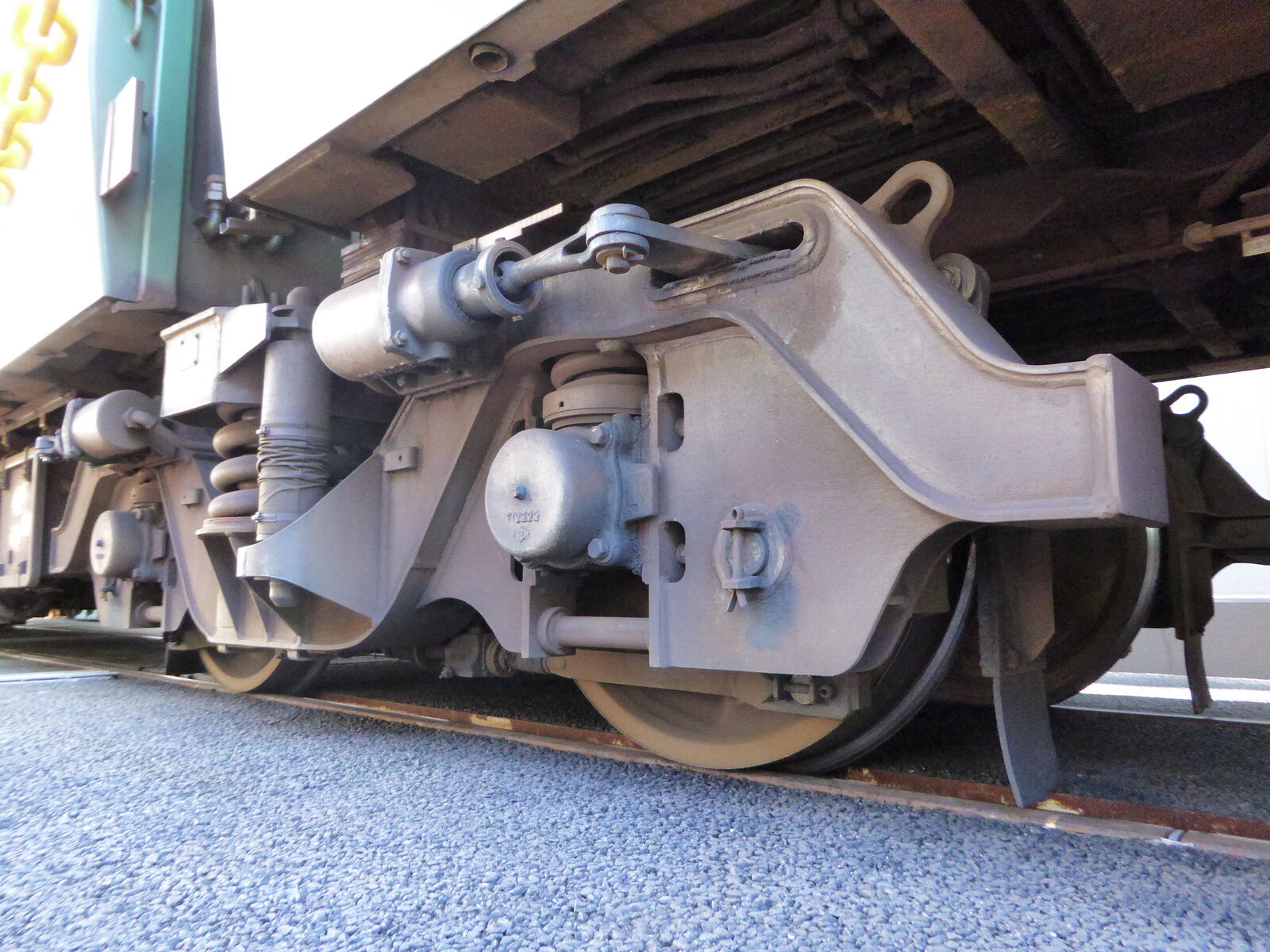 この中間台車には、ディスクブレーキではなく踏面ブレーキのシリンダーが付いています。