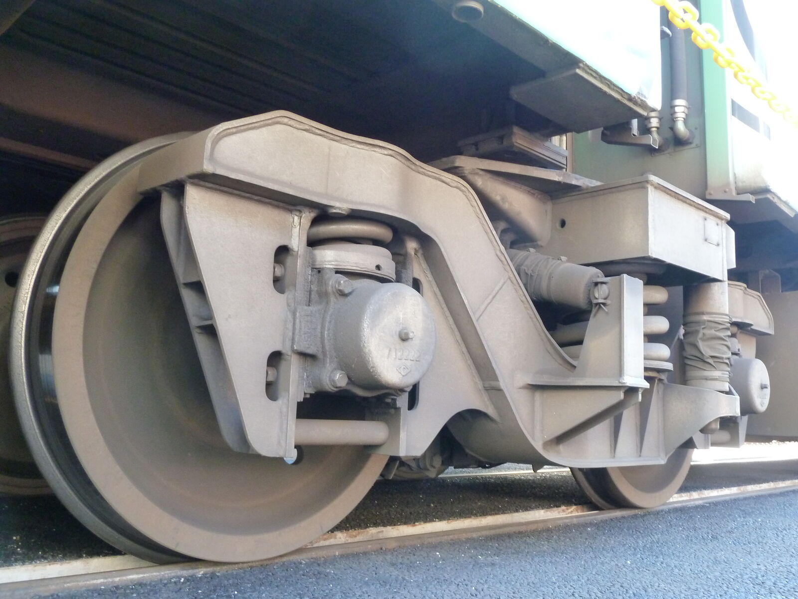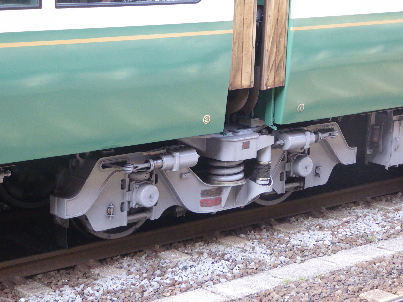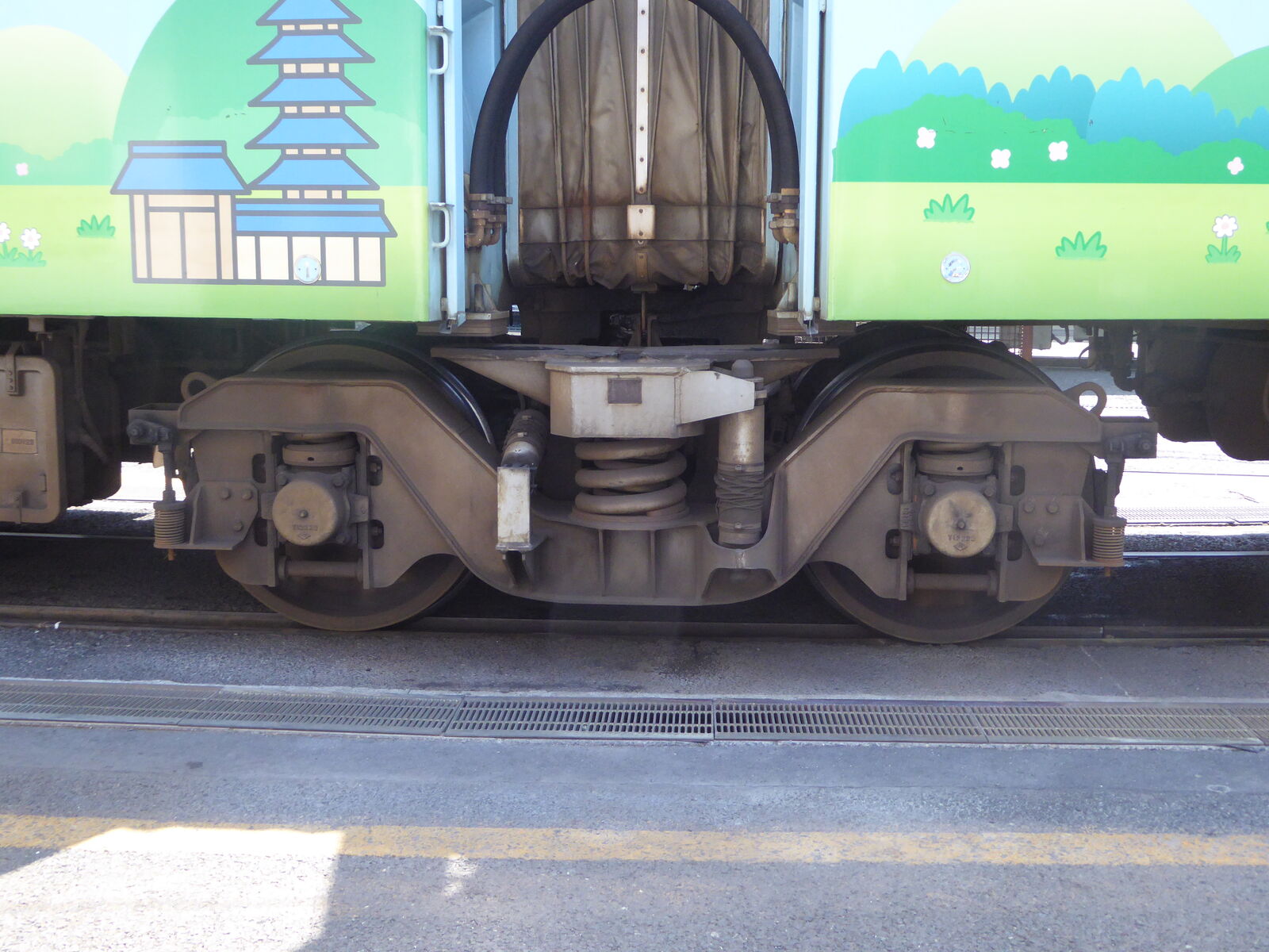 この中間台車には、ディスクブレーキではなく踏面ブレーキのシリンダーが付いています。