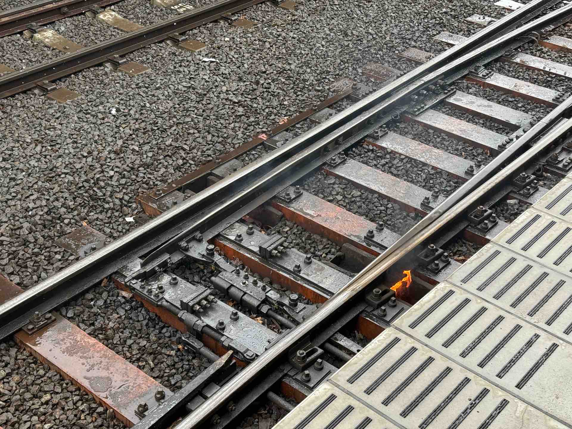 線路の下に火がついているのが!