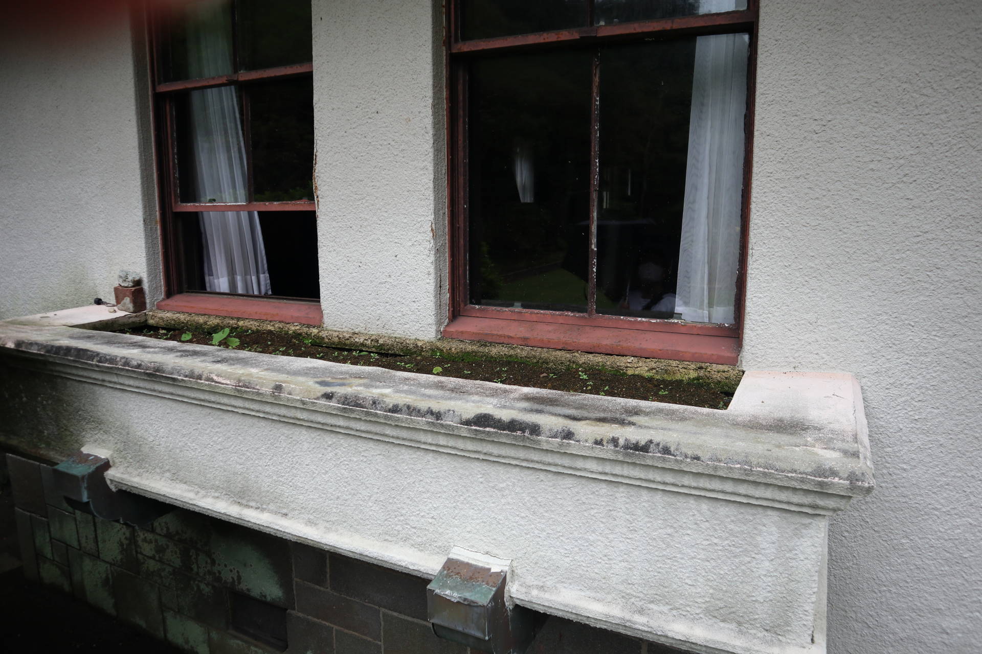 表のゴツゴツした印象から変わって、裏に回ると大きな窓が目立ちます。