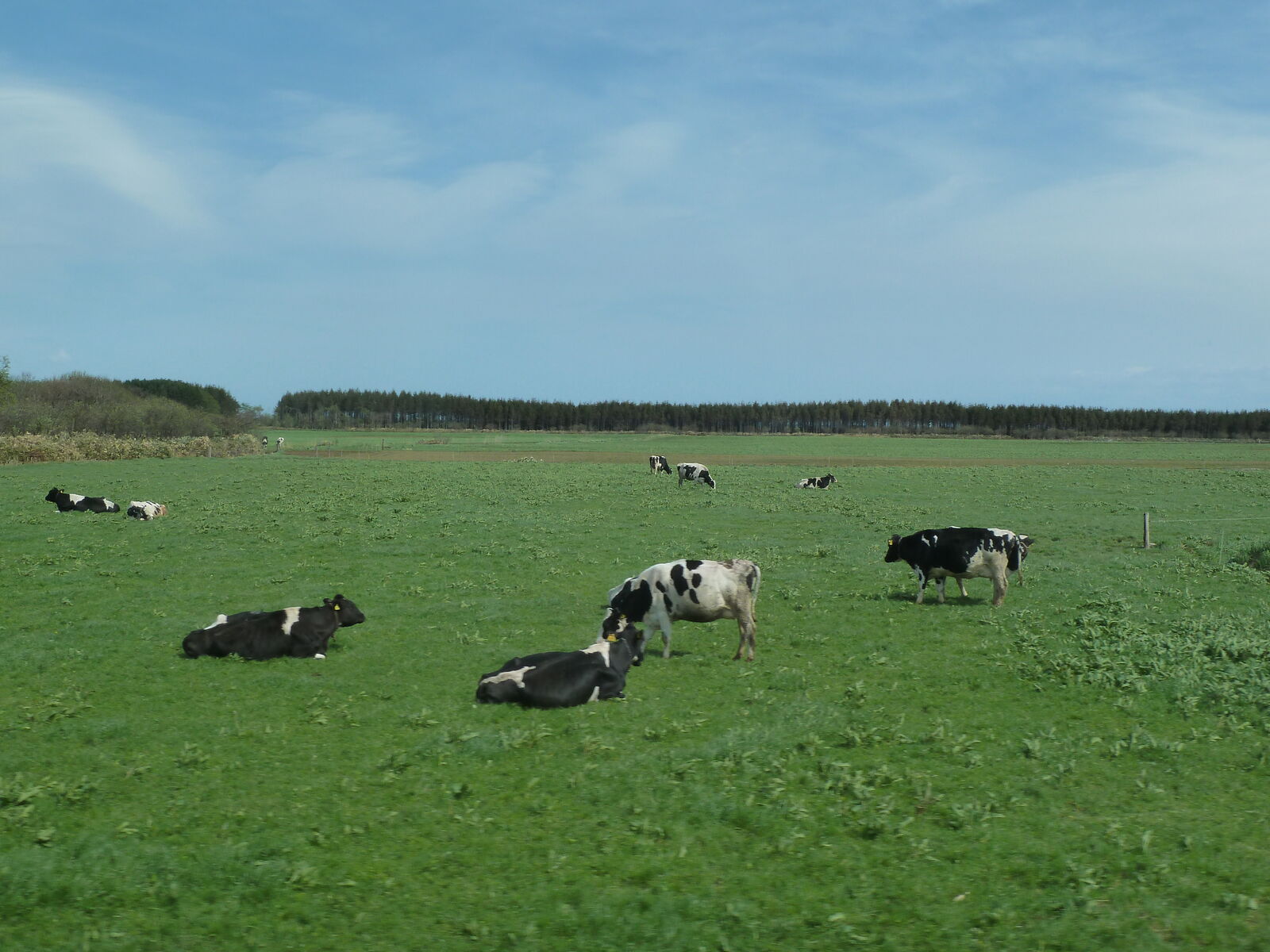拾い草原にときおり水飲みブースがあり、それ以外はごろんとしたり草を食べたりしている牛たち。