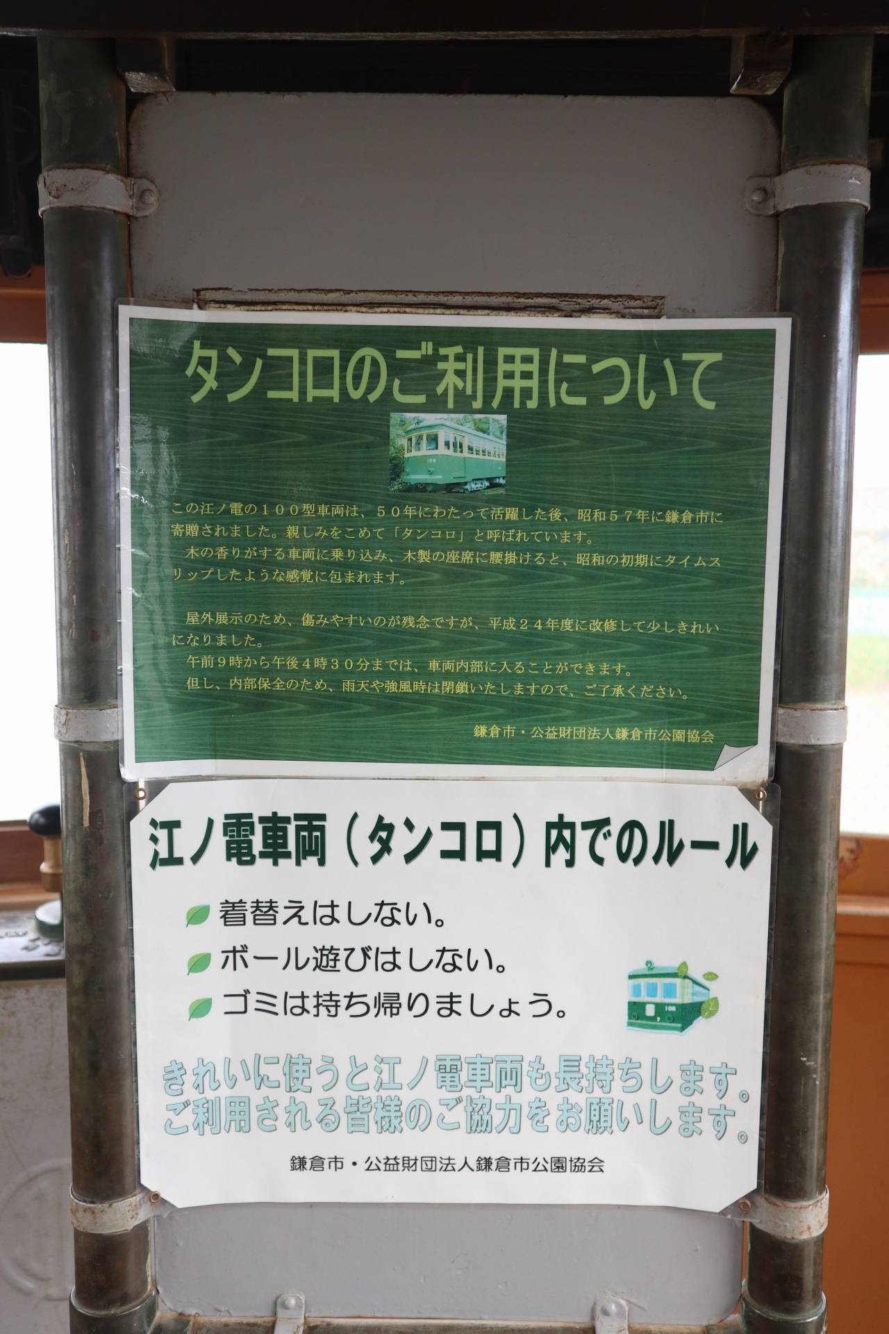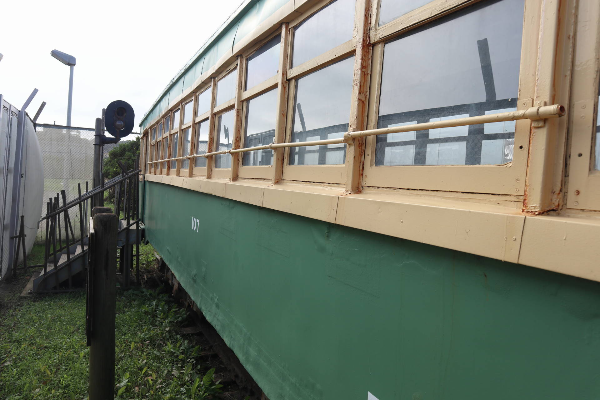 鎌倉海浜公園の由比ガ浜地区の一角に保存されている江ノ電107号車。