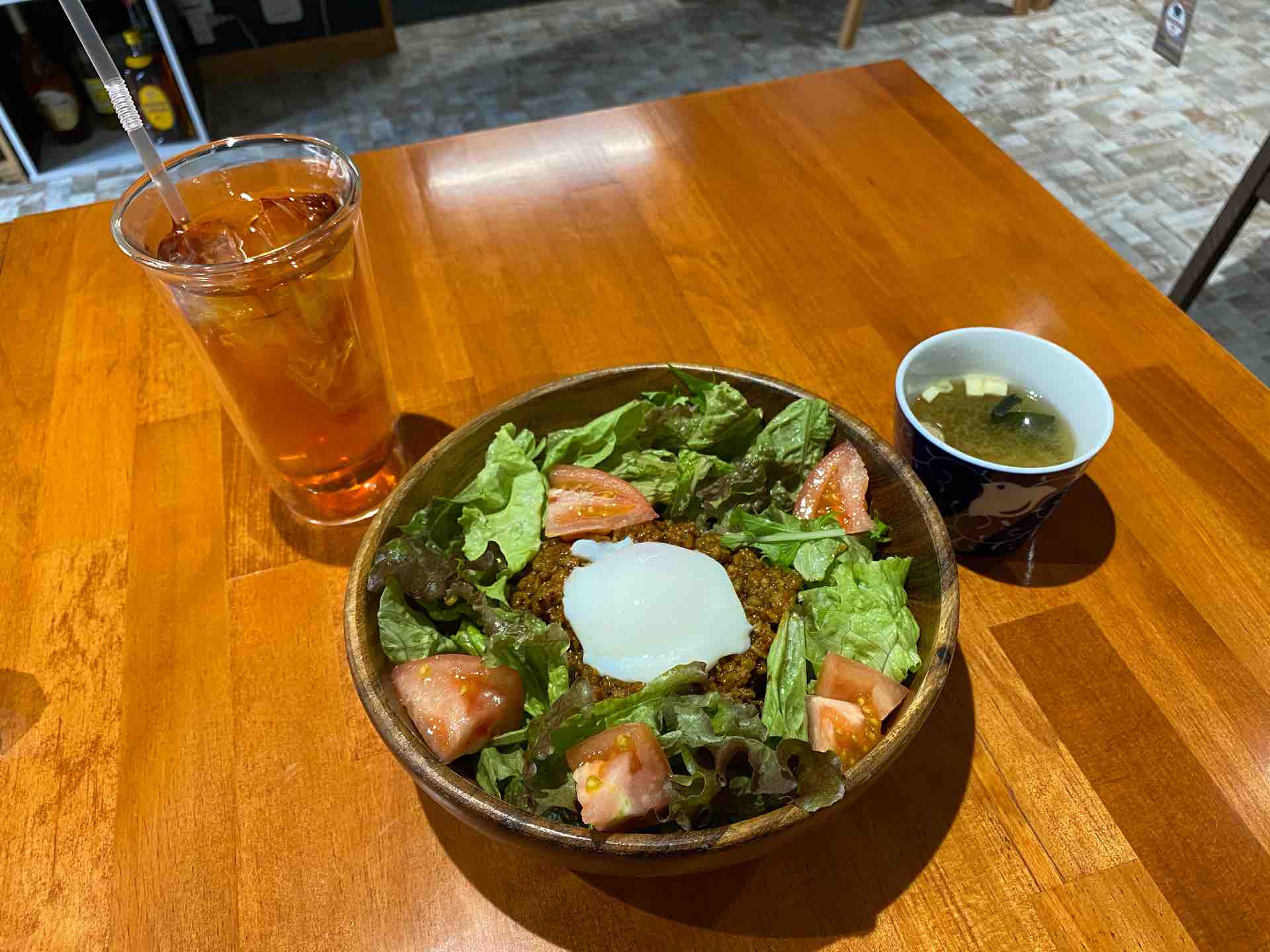 甘辛ひき肉と生野菜を卵でトロッとさせたライスです。