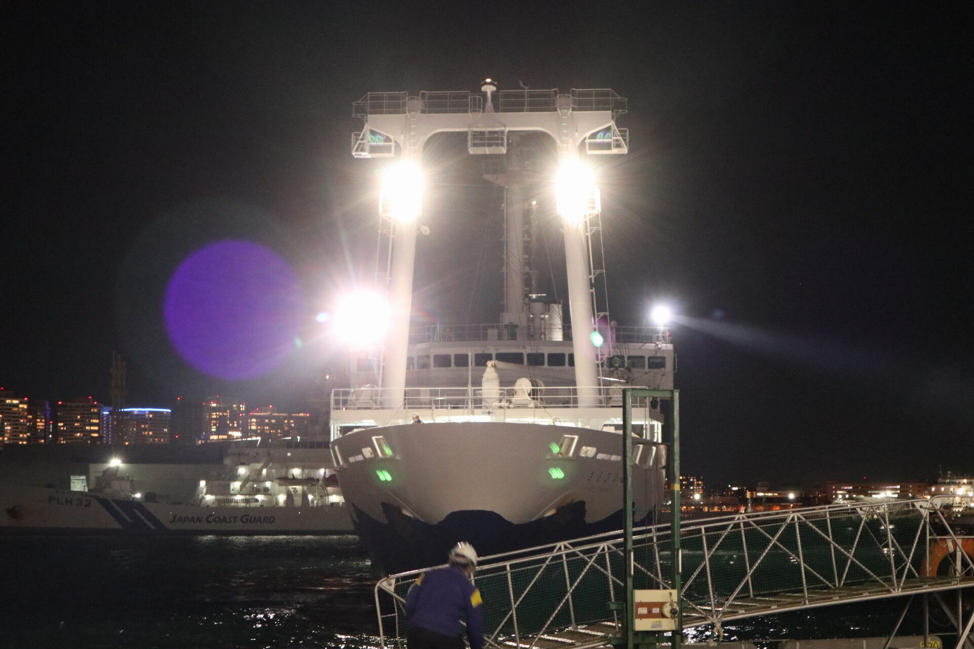 サーチライトをこちらに向け、選手を中心にぐるりと転回するさるびあ丸です。