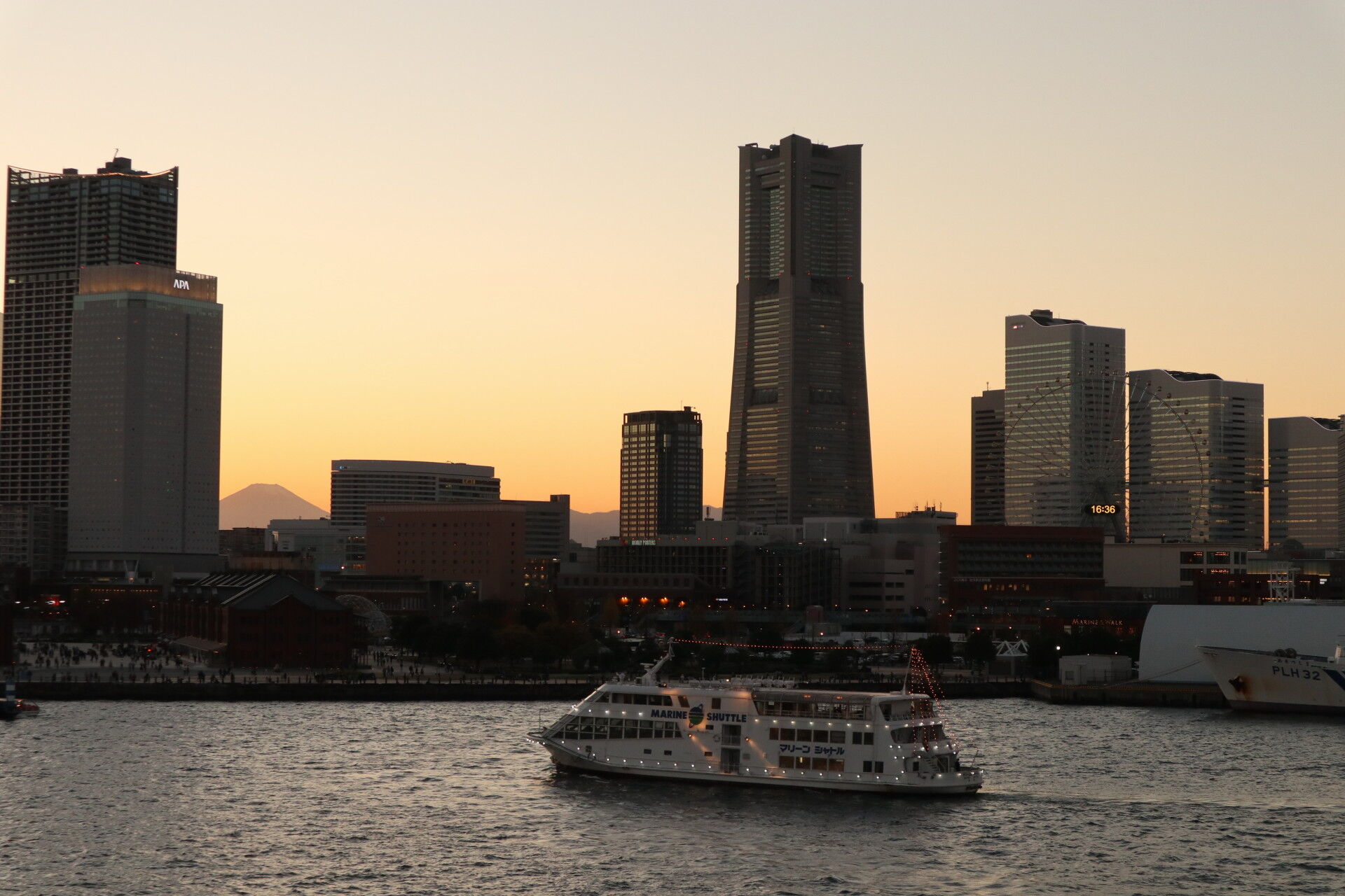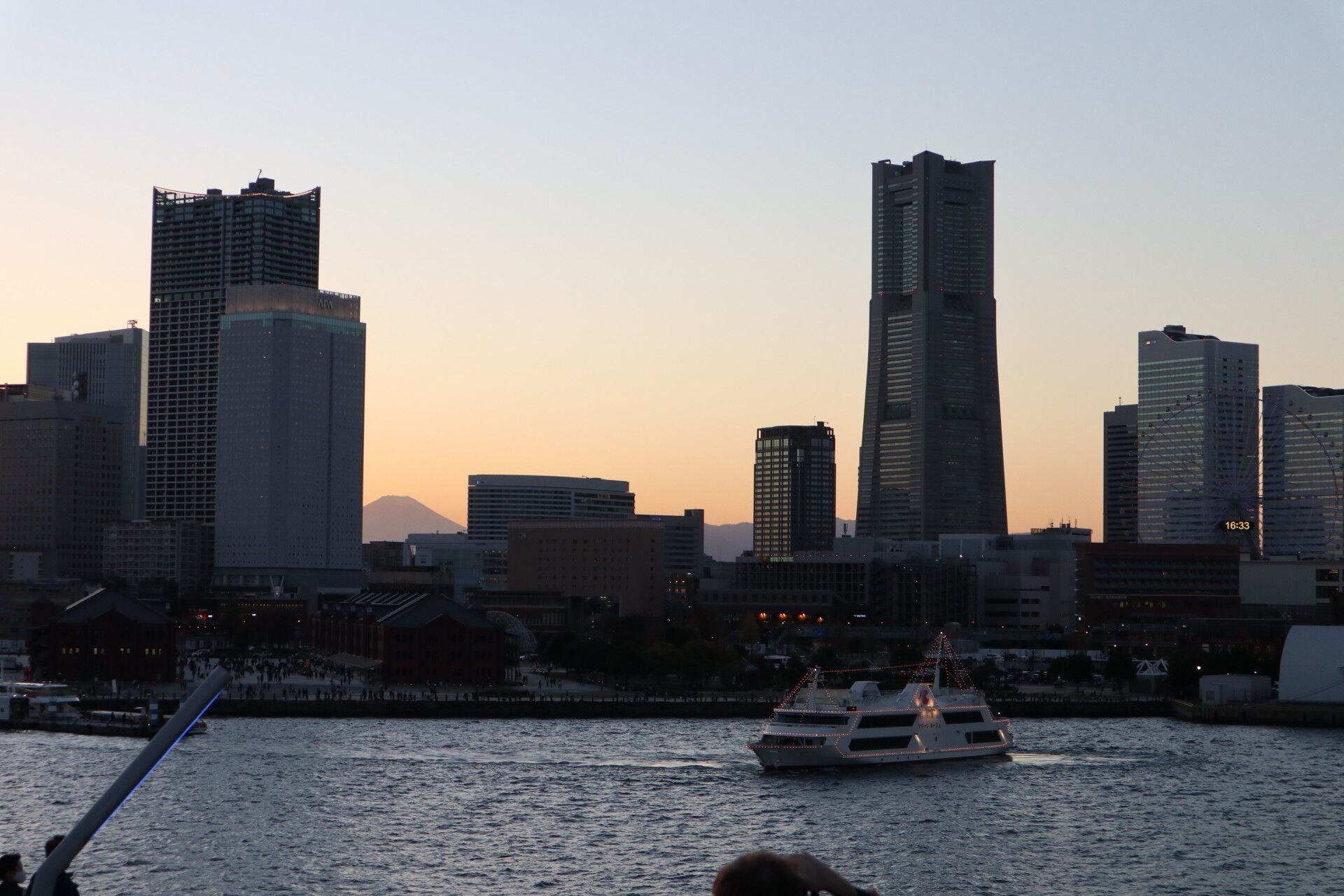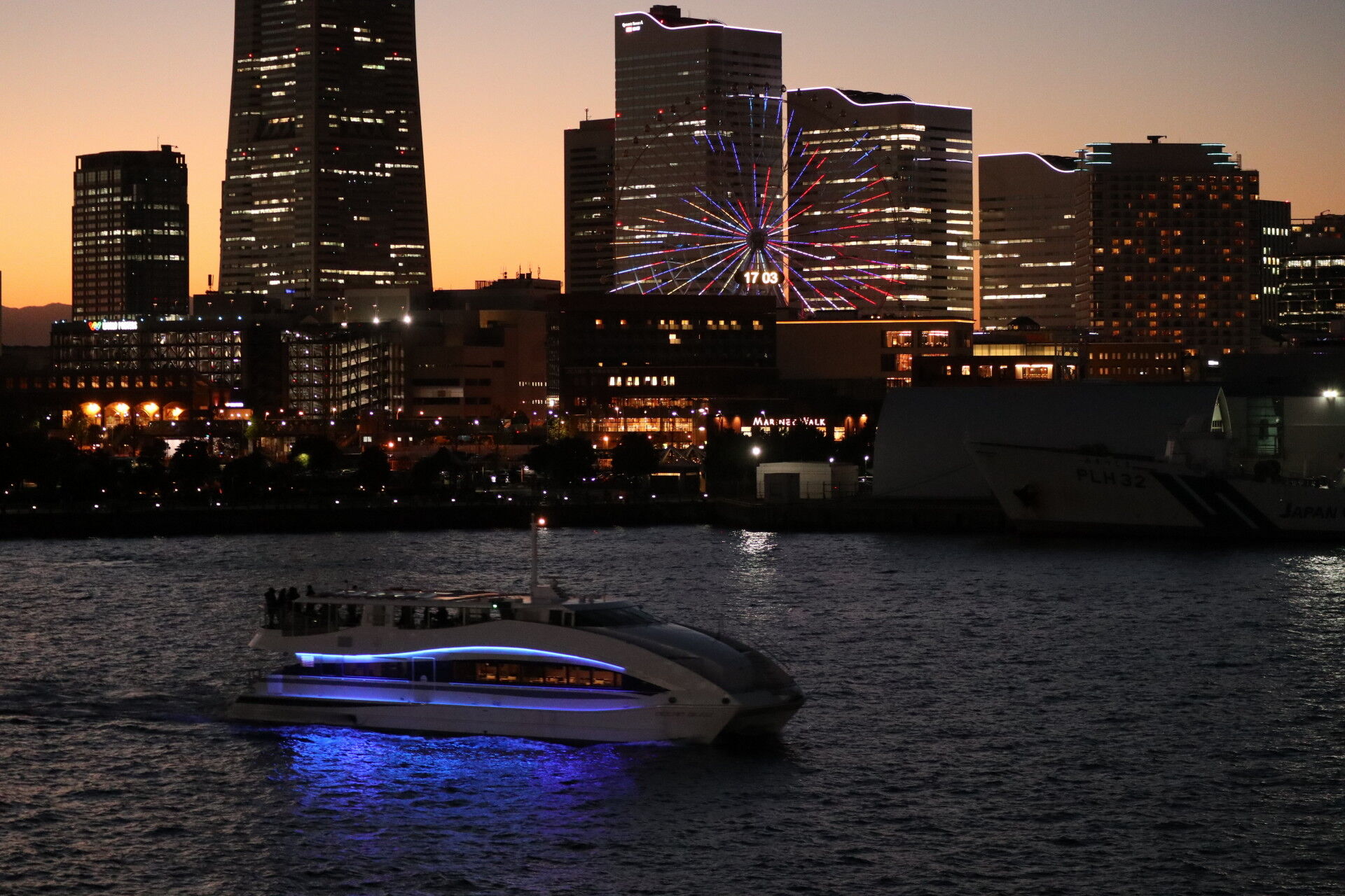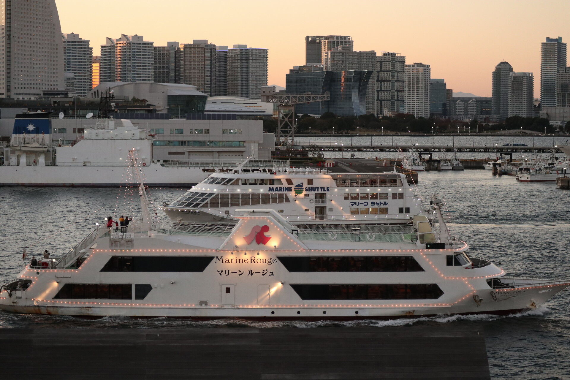 ピア赤レンガから出港する遊覧船「マリーンルージュ」の姿が見えます。